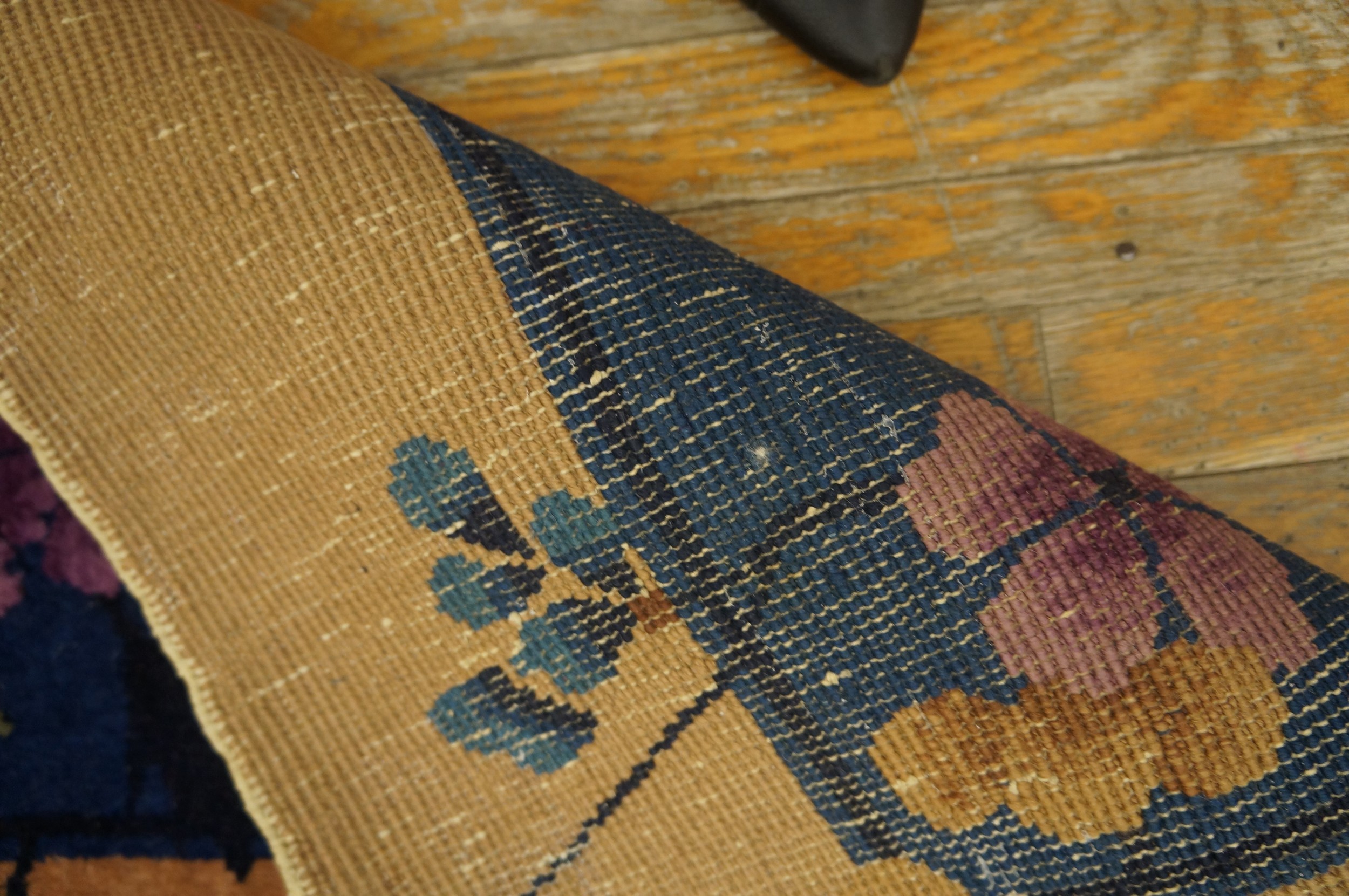 The dramatic border features a dense array of flowering vines and blossoms, executed with a sophisticated, yet simplified, hand. These organic elements, while rooted in traditional Chinese rugs iconography, are presented with the graphic clarity favored by the Art Deco movement. The interplay of deep indigo and vibrant secondary colors—yellow, orange, and magenta—lends the composition an undeniable energy.