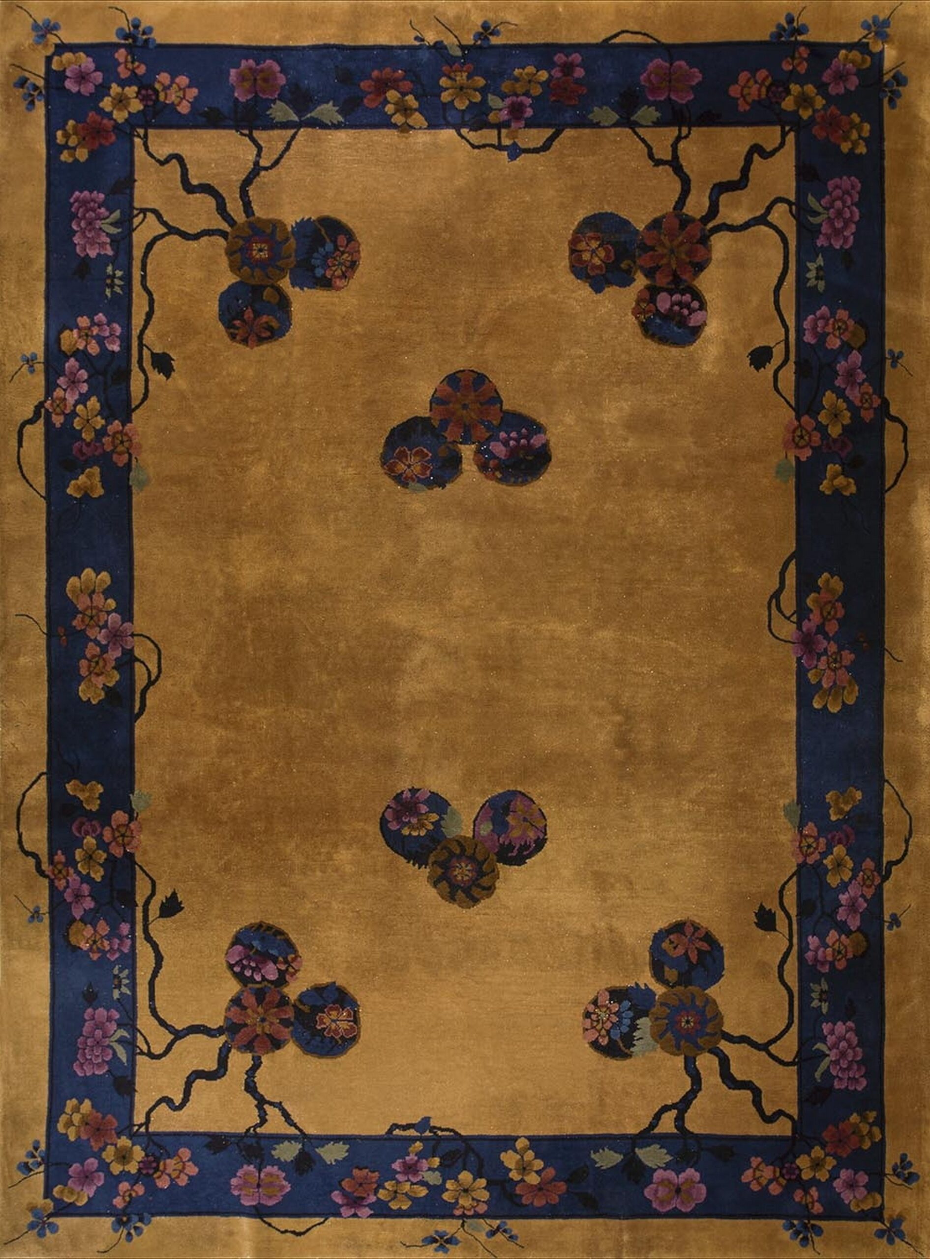 The field is dominated by a rich, burnished gold hue, providing a luxurious, almost metallic sheen that is characteristic of high-quality Chinese wool from this era. This central expanse is subtly punctuated by stylized floral medallions rendered in deep blues, oranges, and pinks. The use of the rich, saturated blue color in the border creates a powerful visual frame against the luminous field.