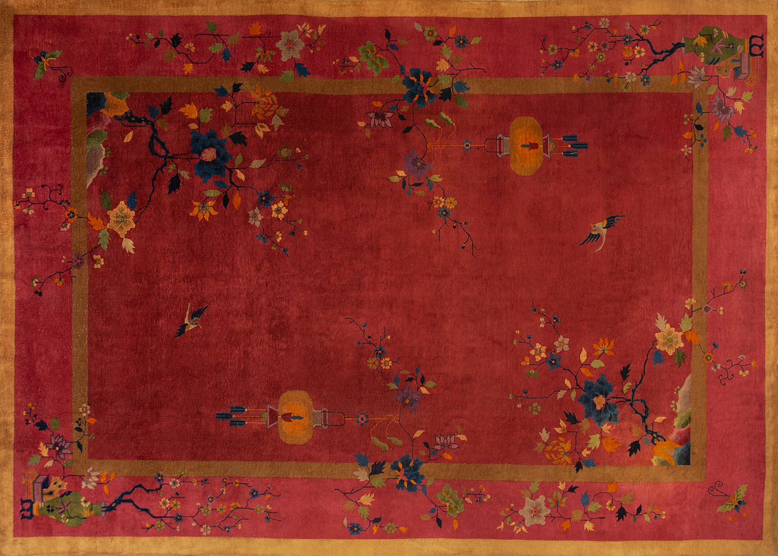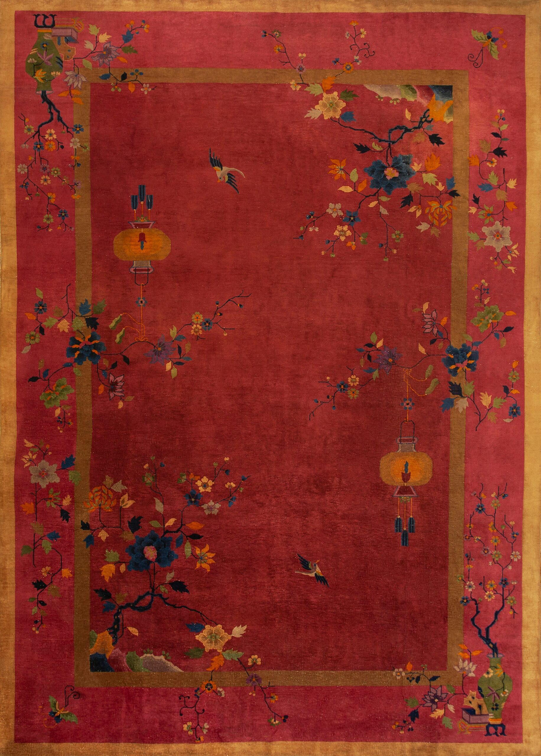Measuring generously, this piece is classified as a true room size rug, making it an ideal anchor for a large living space or formal dining room. Its enduring quality and unique aesthetic make it a compelling decorative statement, bridging Eastern artistry with Western Art Deco glamour, perfect for discerning collectors.