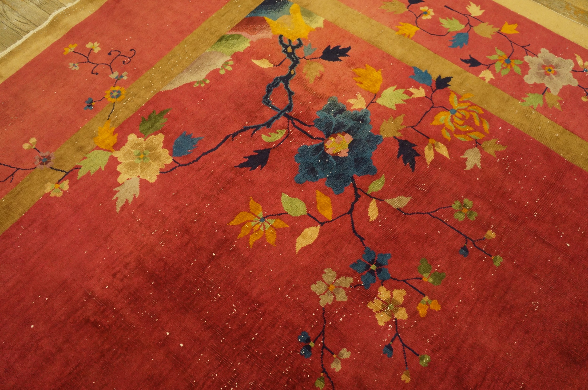 Antique Art Deco Room Size Wool Coral Rug, Circa Date: 1920s. This exceptional example of antique rugs captures the transitional design spirit of the early 20th century. Its bold, saturated field color provides a dramatic backdrop for the stylized Chinoiserie motifs popular during the Art Deco era.