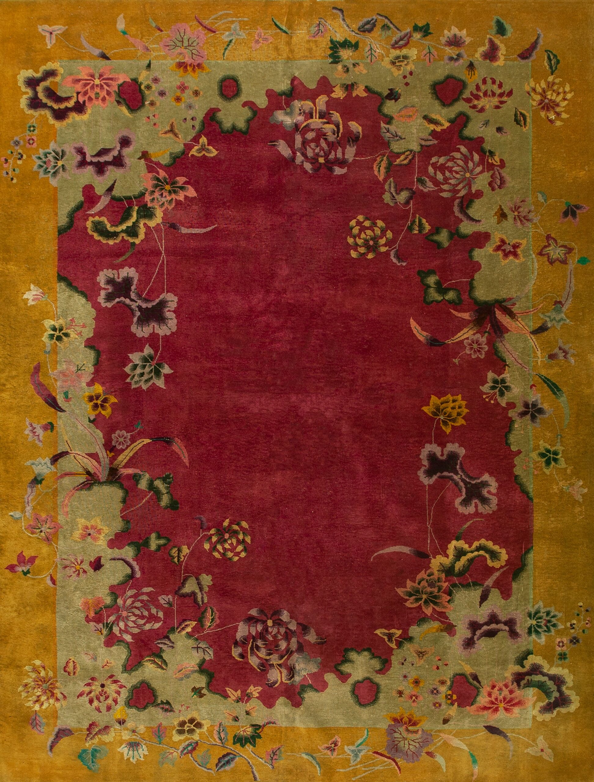 Stylized floral vines and blooming chrysanthemums cascade inward from the border, creating a dynamic, scalloped edge against the main field. The secondary border, rendered in a soft, sage-green tone, provides a crucial buffer between the primary colors. As a true room size rug, this piece is perfectly scaled to anchor a grand living area or formal dining room, ensuring its artistic presence is felt throughout the space.