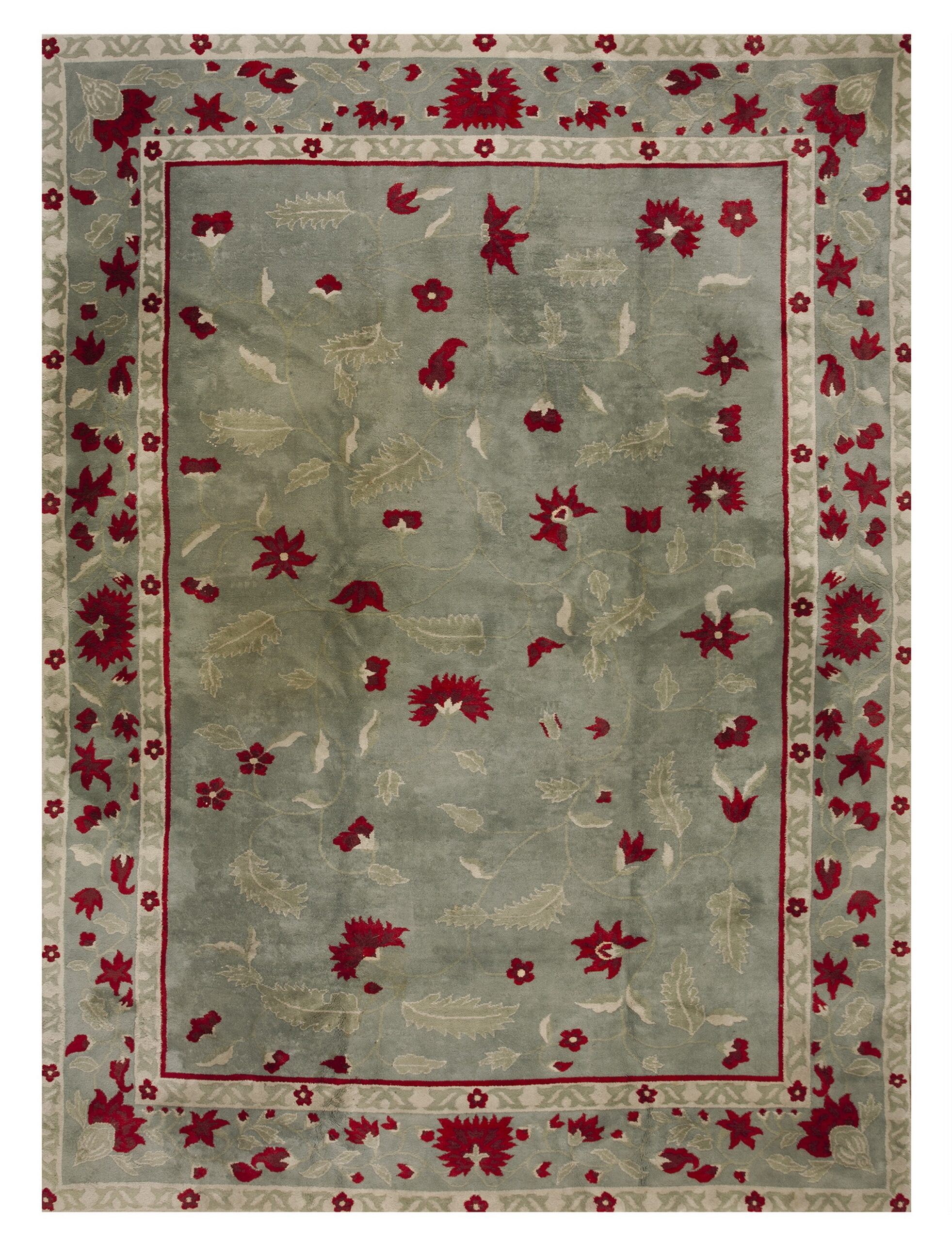 The design eschews the dense patterning of earlier periods in favor of an open, airy composition. Stylized crimson floral sprays and pale sage leaves float across the field, contained by a complex, multi-layered border. This simplification of form and color palette is a hallmark of the 1930s decorative arts.