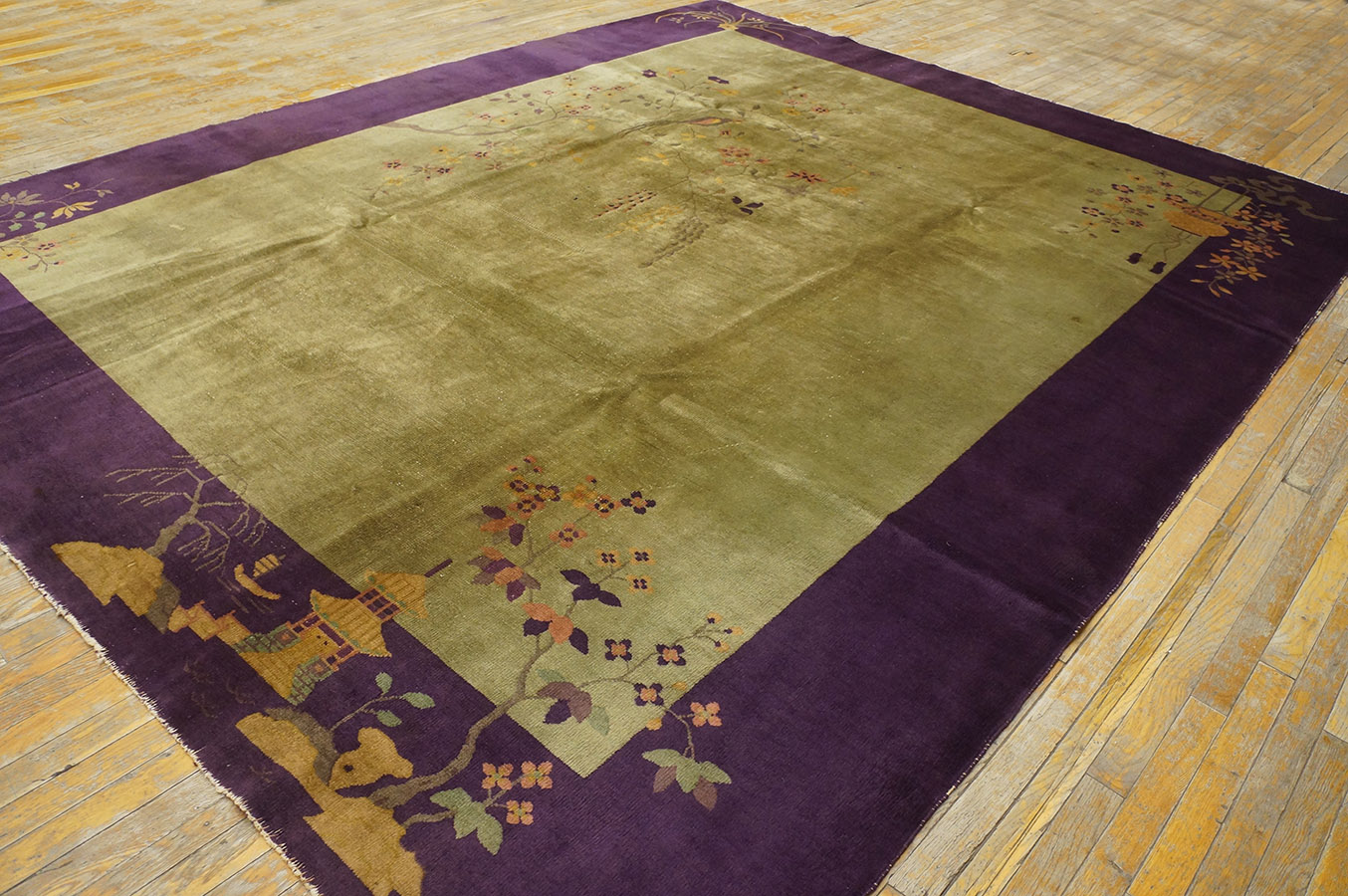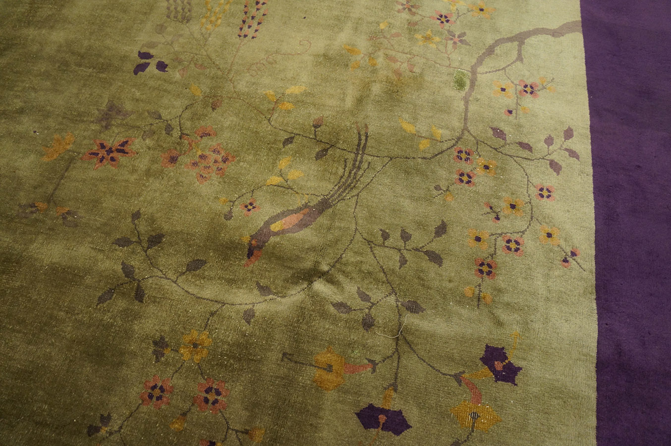 Antique Art Deco Room Size Wool Olive, Purple Rug, Circa Date: 1920s. This exceptional room size example of Art Deco design captures the period’s fascination with Eastern aesthetics, presenting a highly stylized and asymmetrical composition. The dramatic visual tension created by the deep, saturated purple border against the field of soft olive green is characteristic of high-end 1920s textile design.