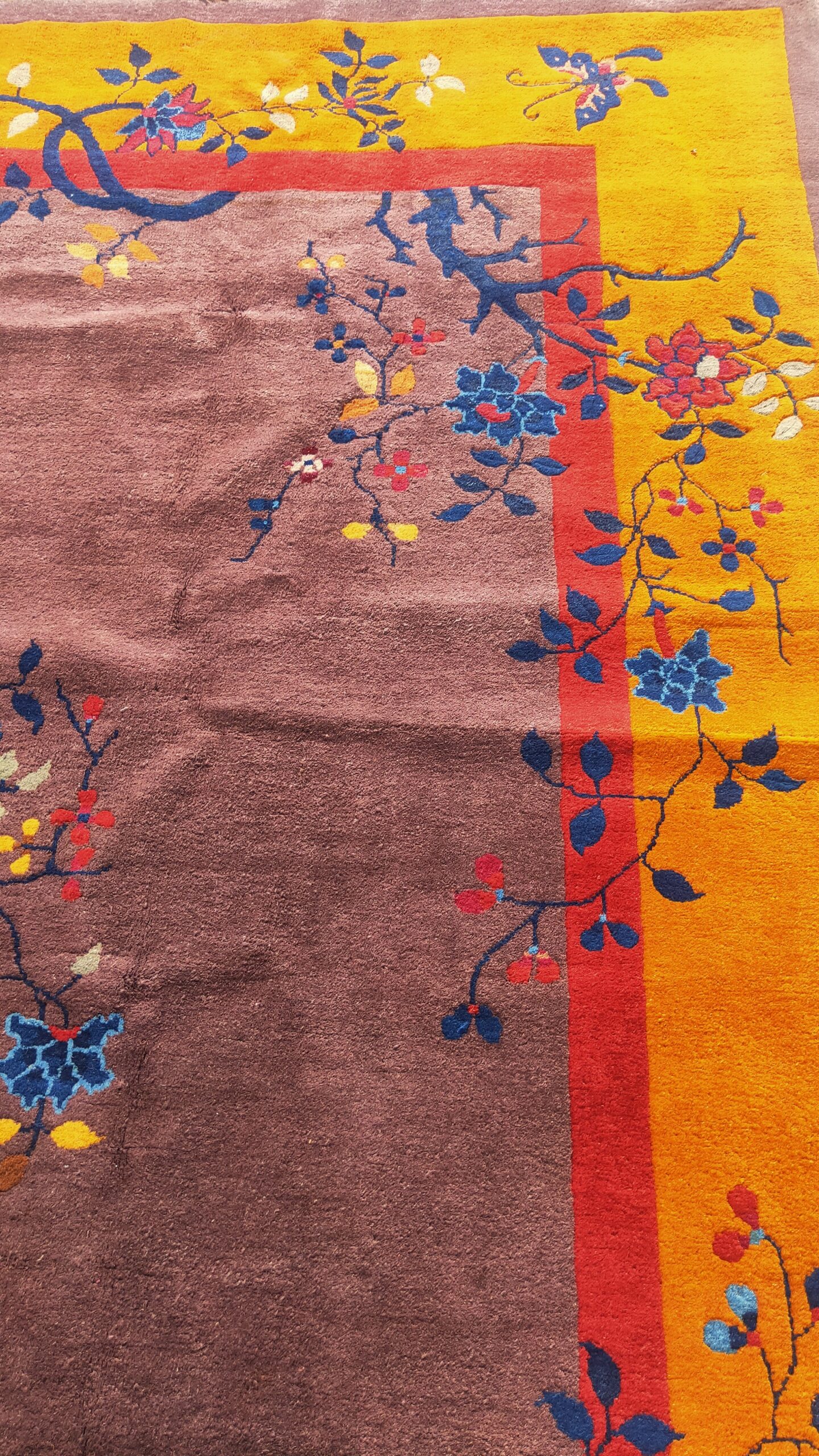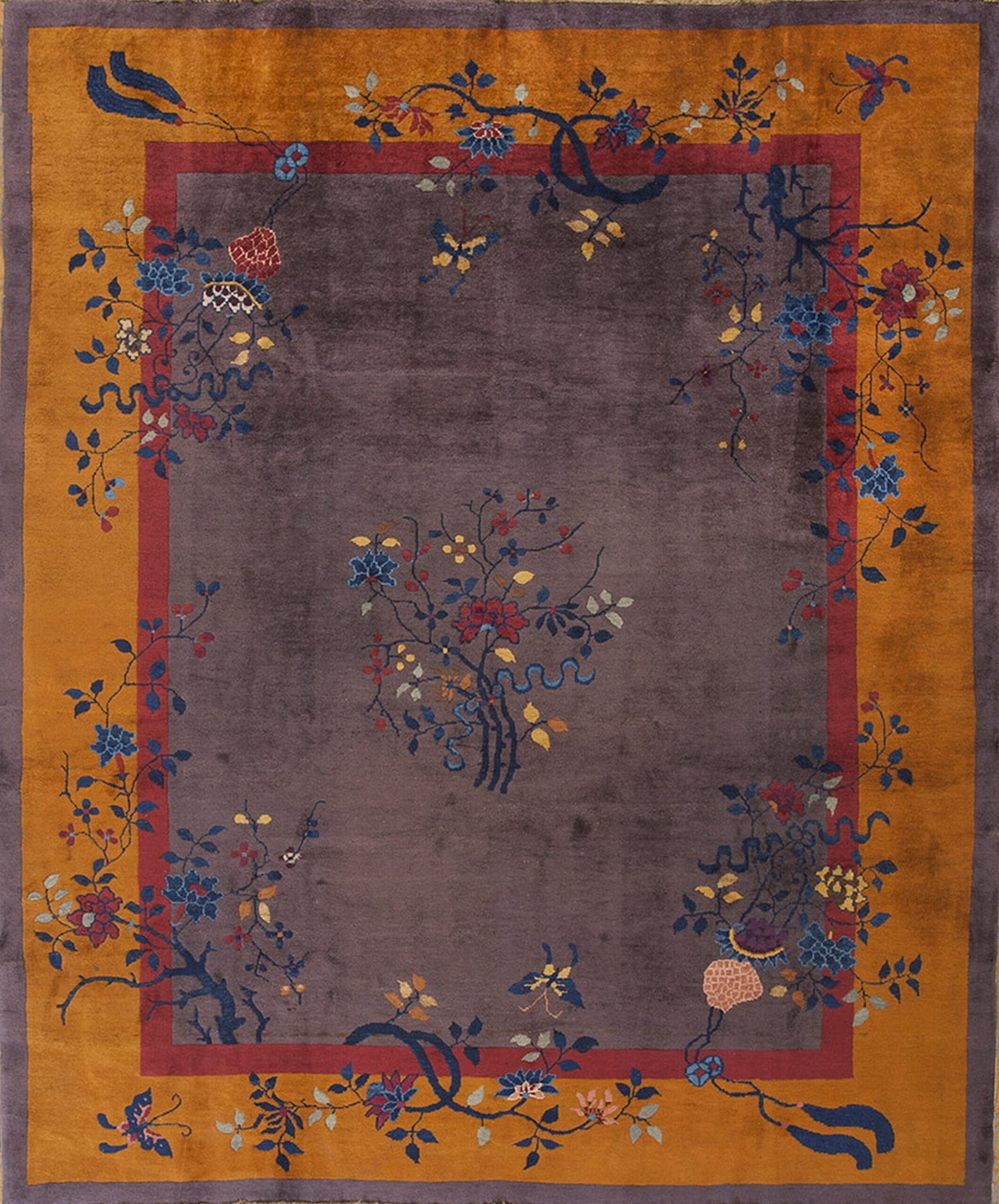 The design employs a striking open composition characteristic of early 20th-century Chinese Deco production. Delicate vines, stylized peonies, and fluttering butterflies cascade from the border into the field, demonstrating a masterful use of negative space. Such refined pieces are highly sought after by collectors of antique rugs.