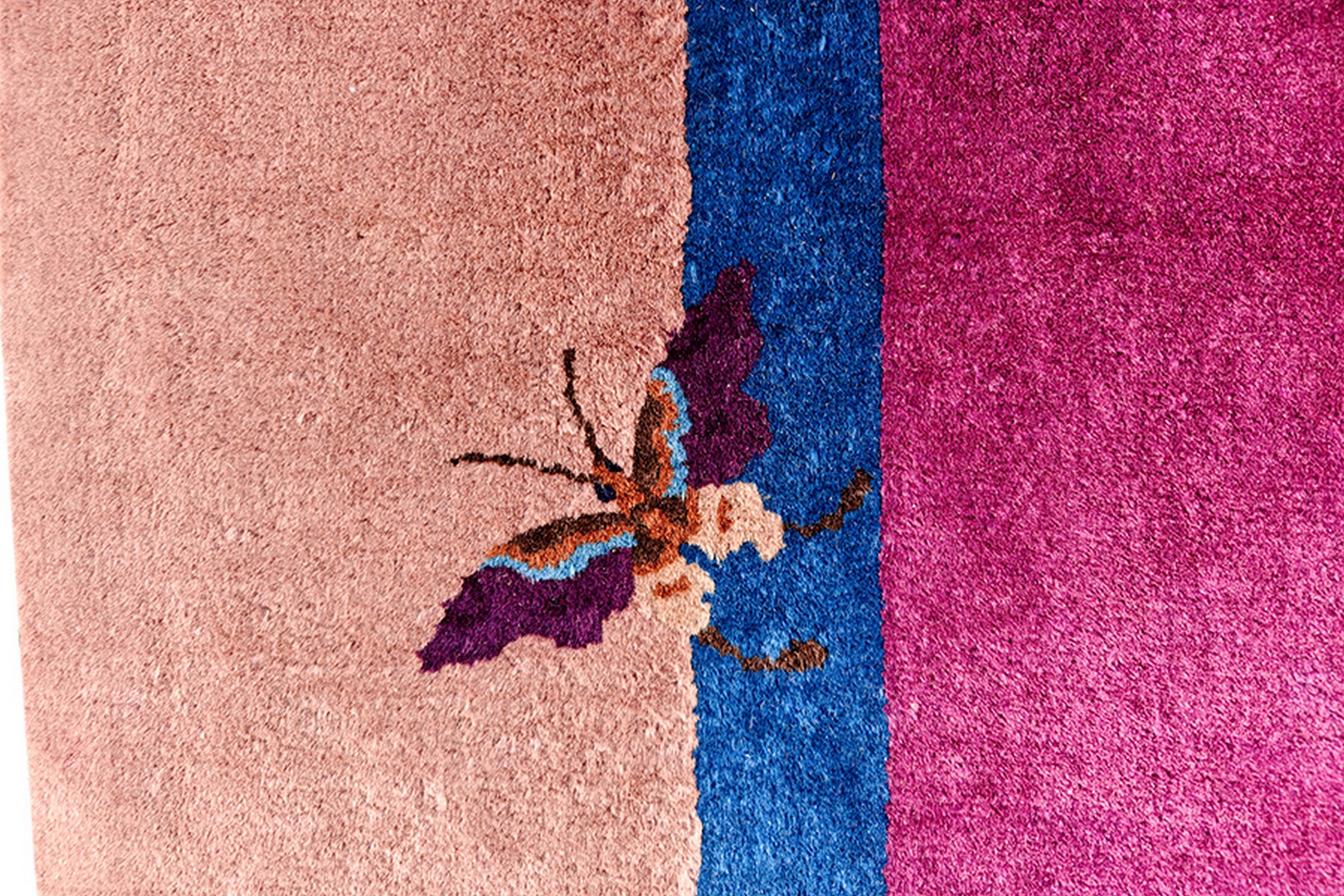 The central field is dominated by a rich, saturated fuchsia or magenta, providing a bold canvas for the sparse, naturalistic motifs. This deep hue is beautifully framed by a soft, dusty rose border, creating a sophisticated visual tension. While the primary field is crimson, the vibrant accents of yellow, green, and blue ensure this piece complements other gold Orange color rugs in a curated collection.