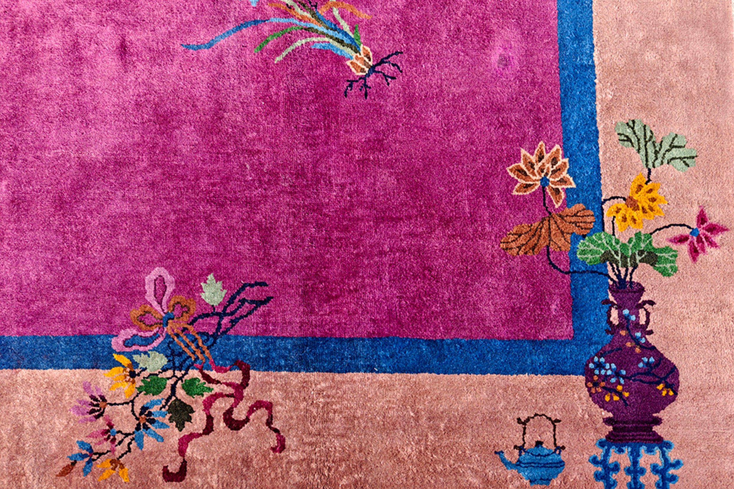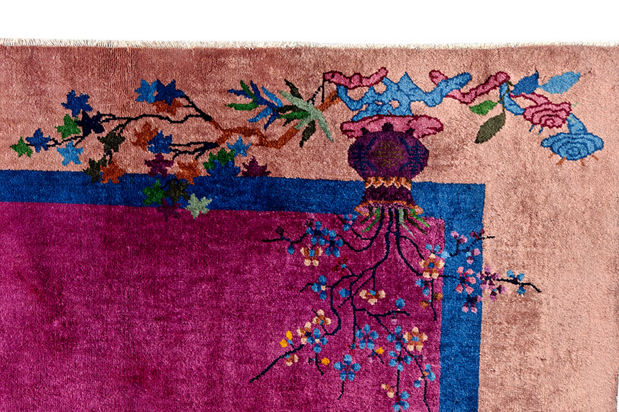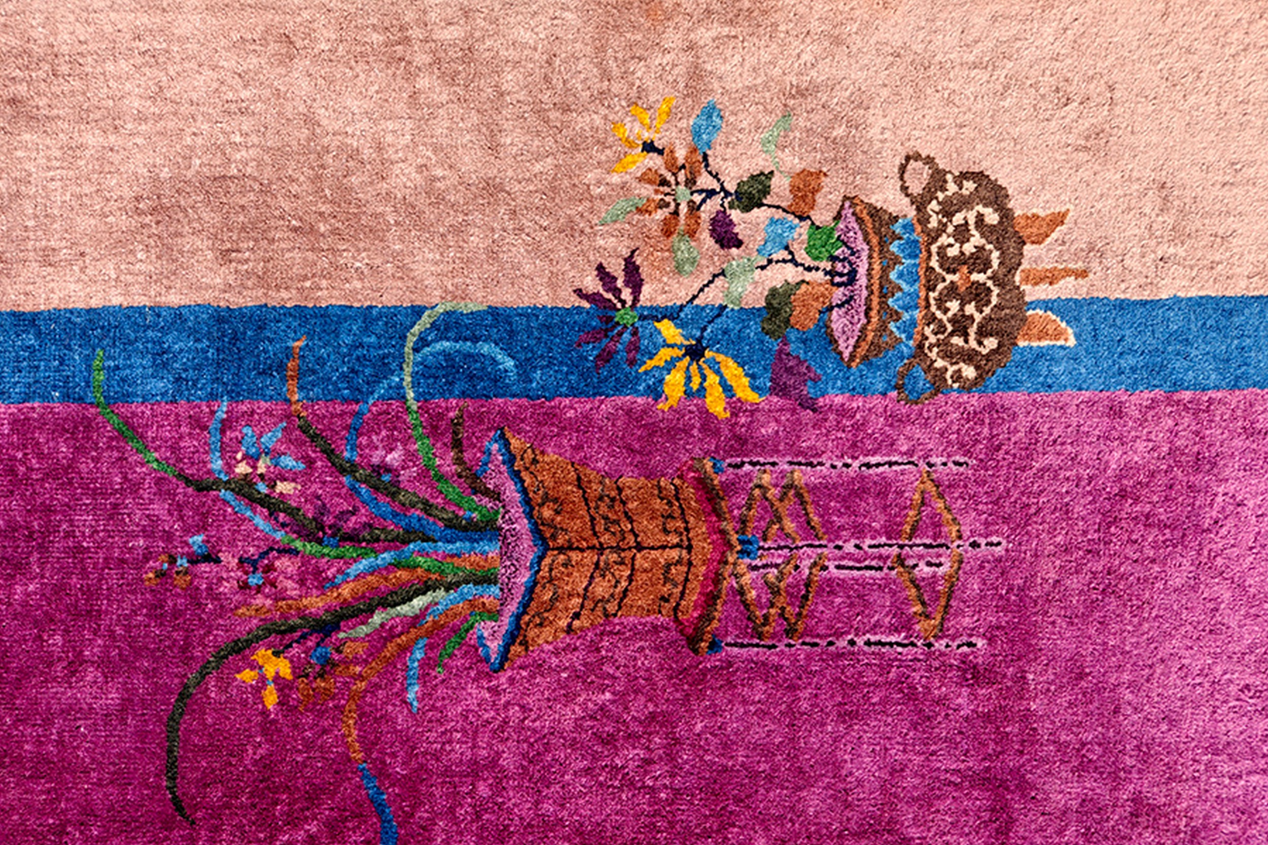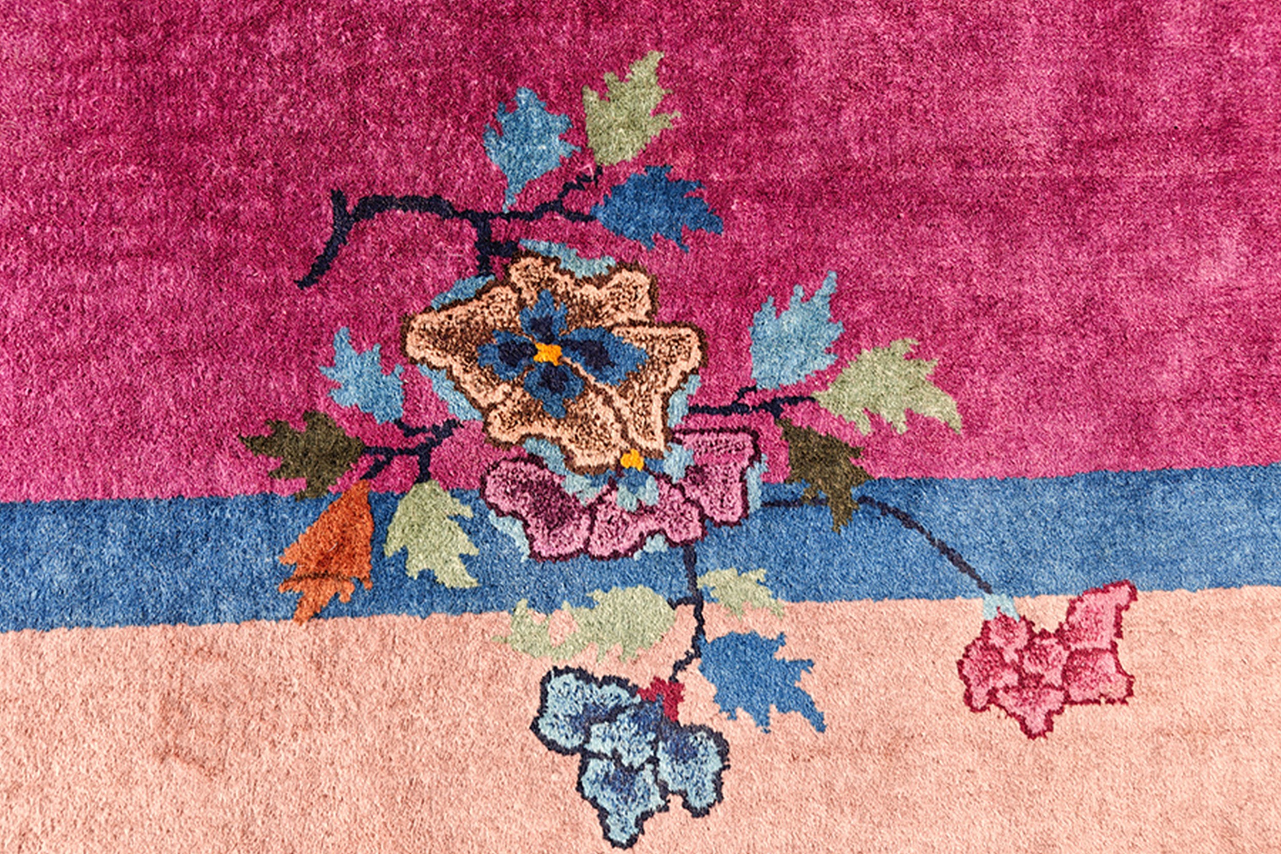 Hand Knotted Pile Fuchsia / Pink Orange 1920s Rectangle Wool Antique Rug, Circa Date: 1920s. This exceptional Chinese Art Deco piece captures the dramatic color shifts characteristic of the period. Its generous proportions and striking palette make it a standout among room size rugs of the early 20th century, offering both historical depth and immediate visual impact.