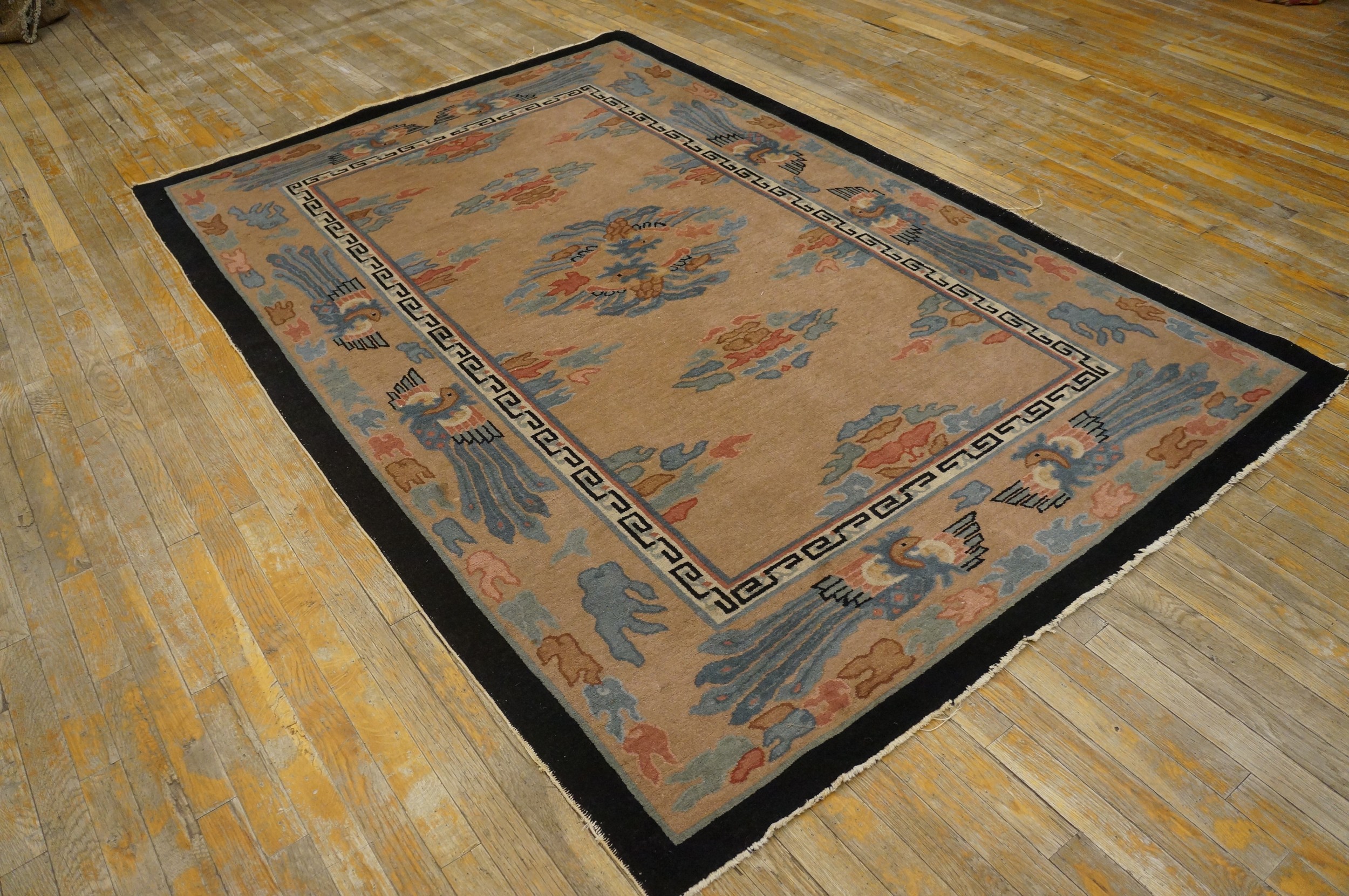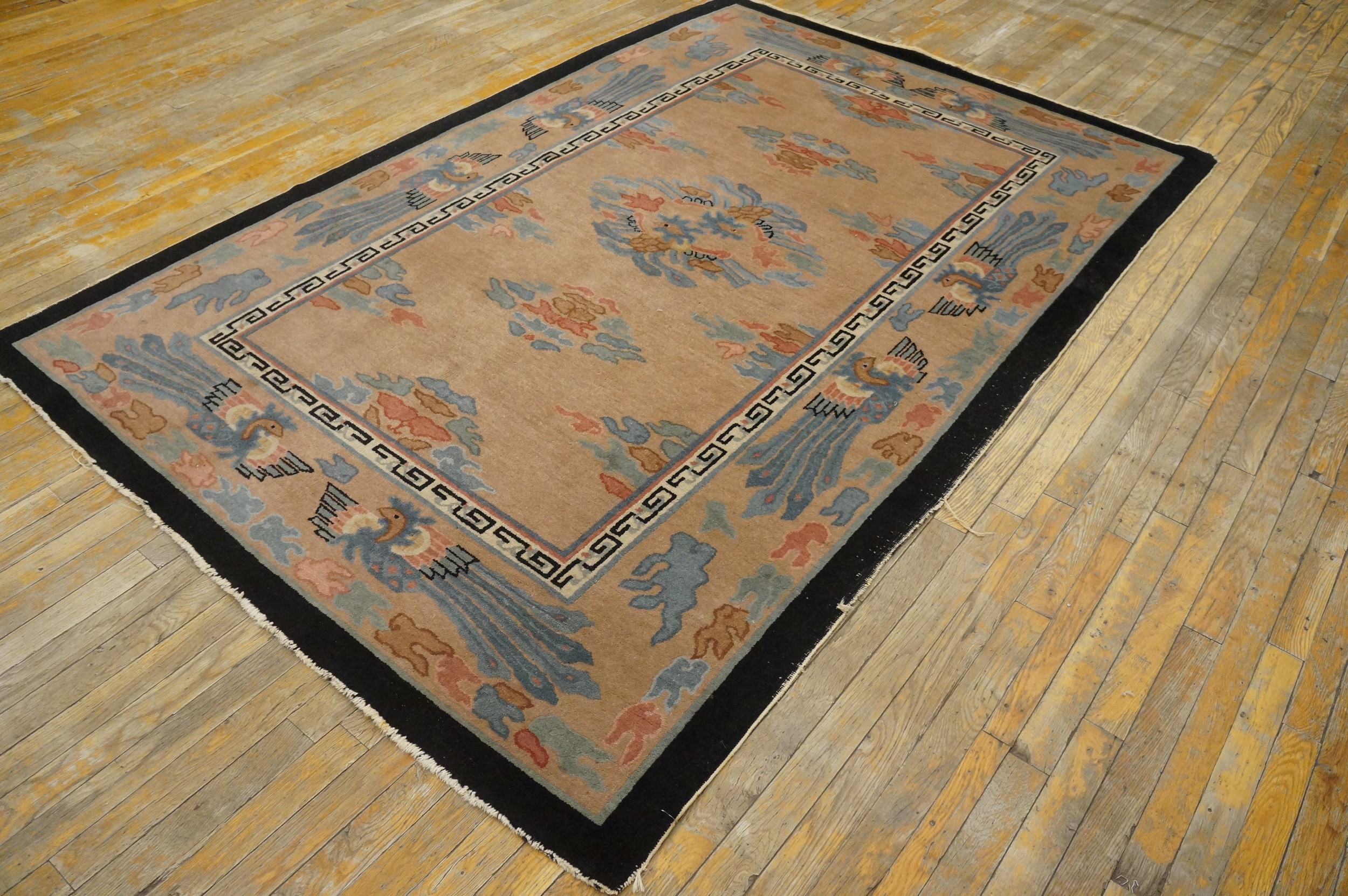 The palette is sophisticated and restrained. The central field utilizes a warm, saturated tan, placing it among desirable beige color rugs. This neutral foundation beautifully offsets the secondary colors: soft slate blue, muted coral, and a grounding black outer border, creating a harmonious yet striking visual contrast typical of the period.