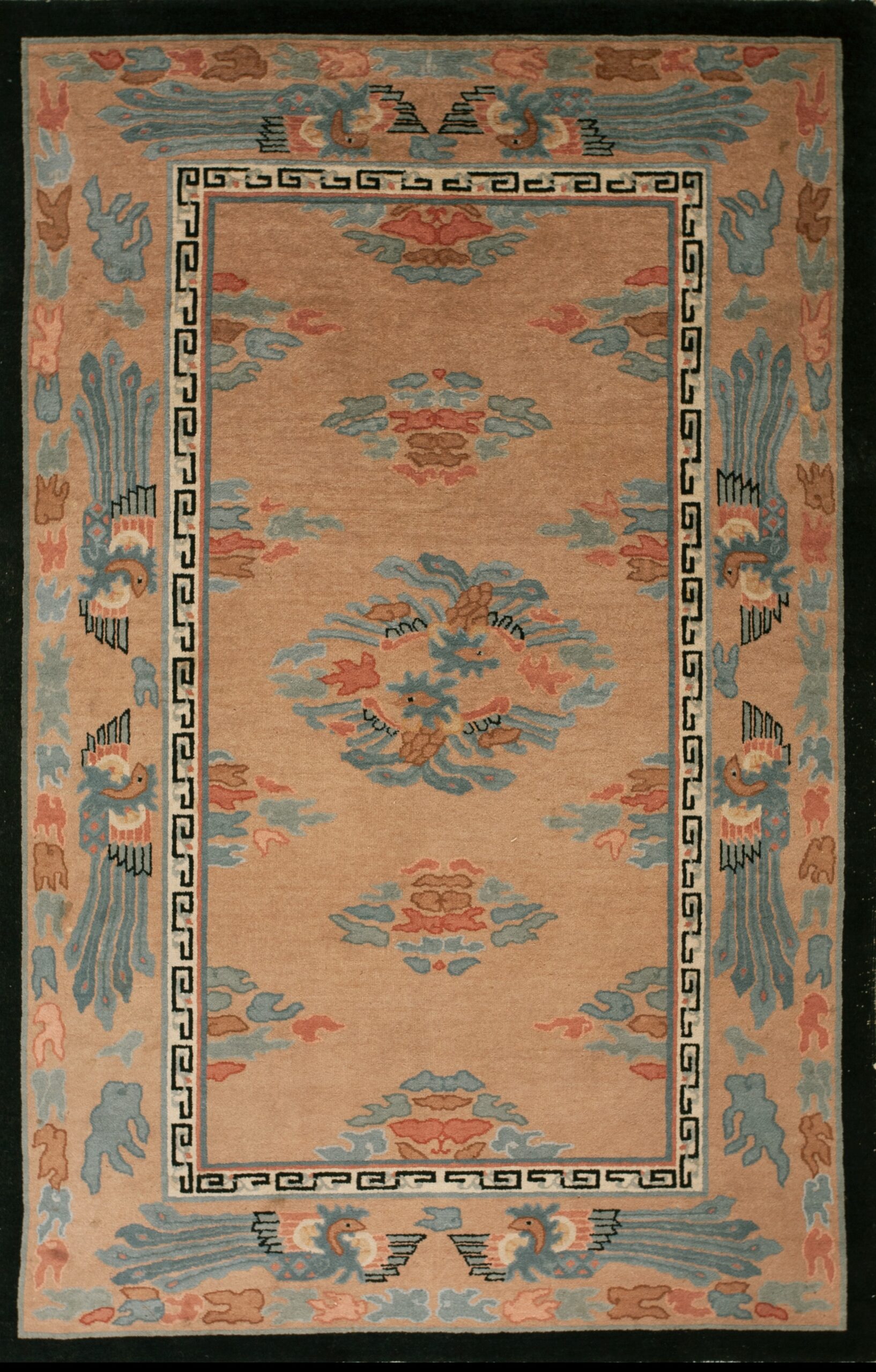 The design features highly stylized avian figures—likely phoenixes or peacocks—flanking the central medallion and corners. These motifs are contained within a crisp, rectangular frame delineated by a traditional Greek key pattern, illustrating the era’s fascination with synthesizing global decorative traditions into a modern form.