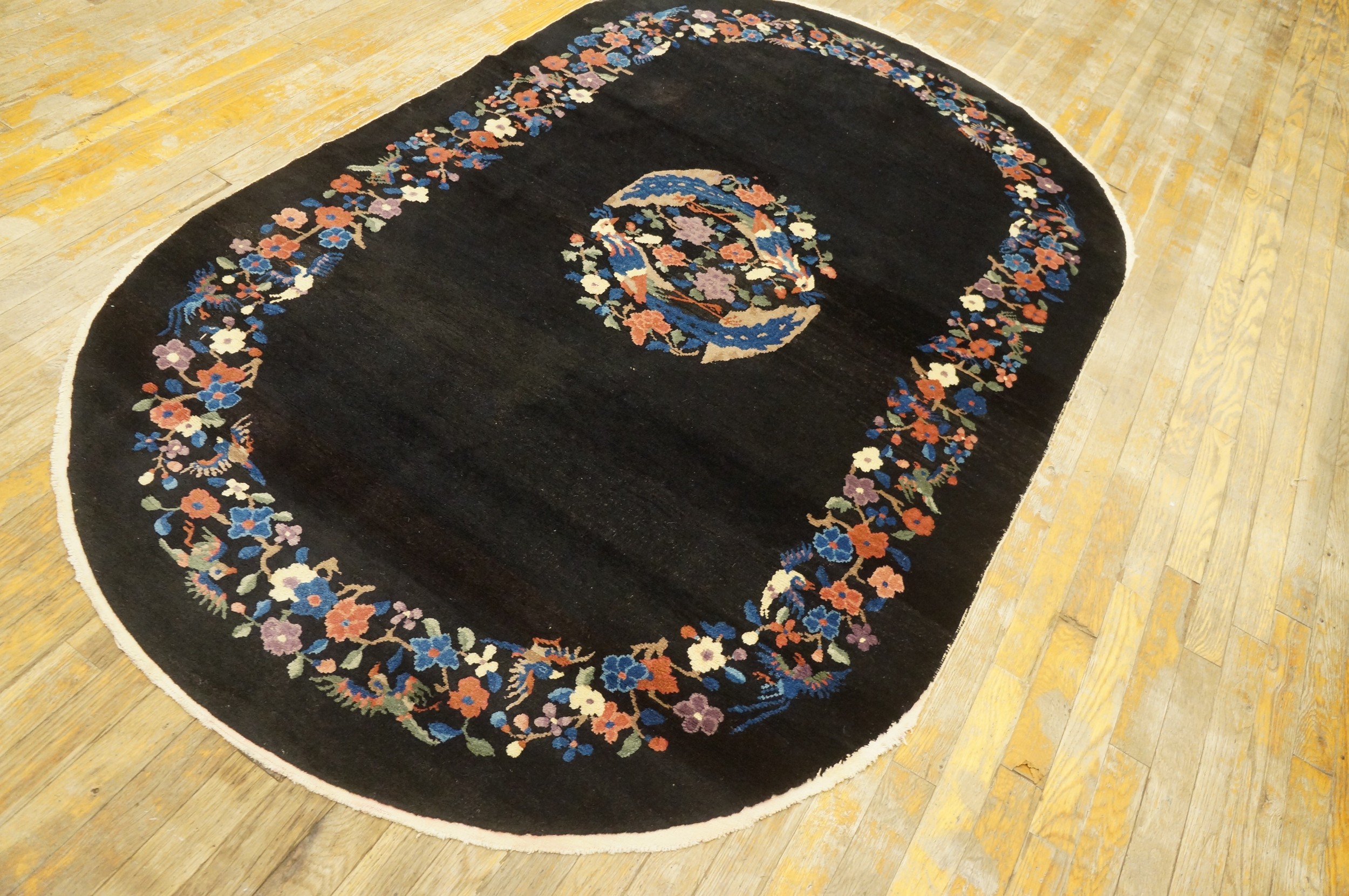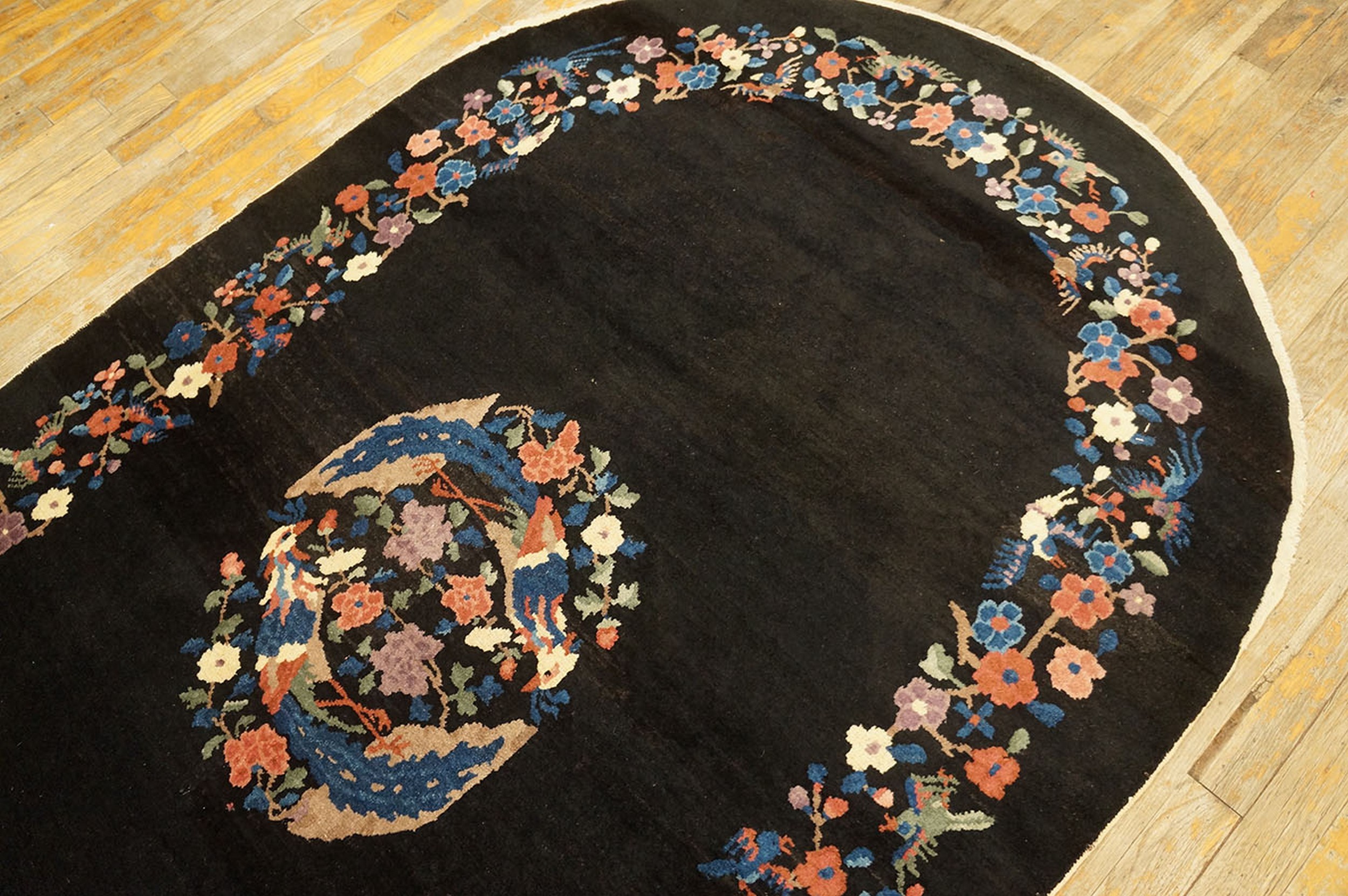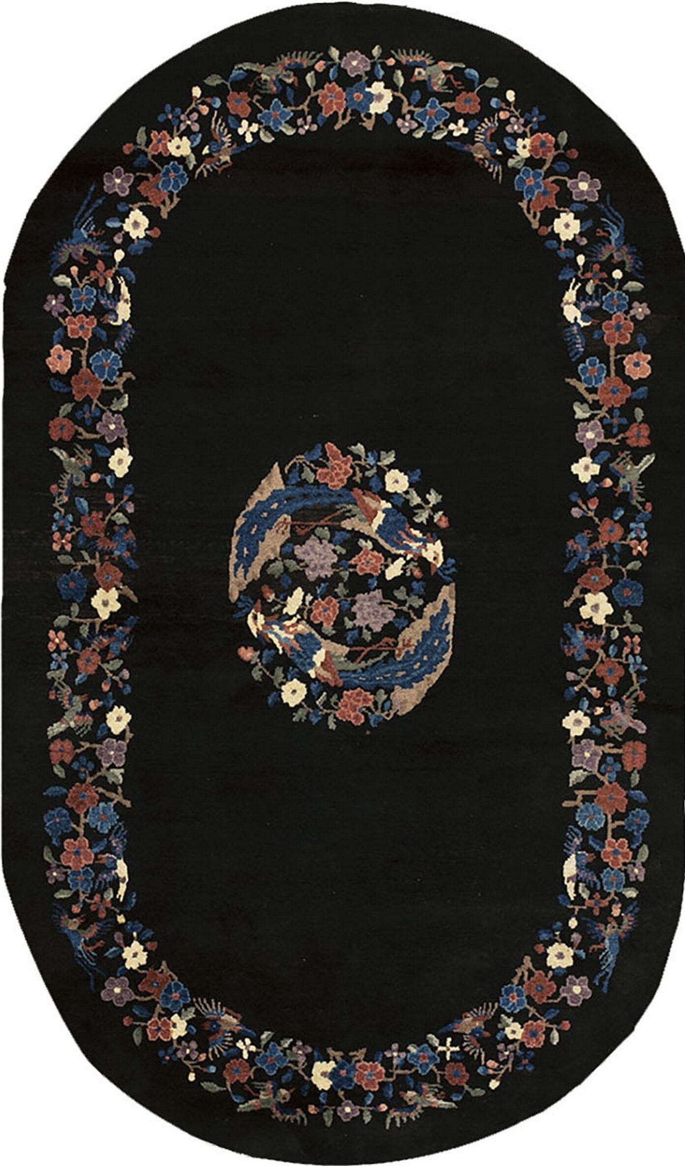 Antique Art Deco Small Scatter Size Wool Black Rug, Circa Date: 1920s. This exceptional piece captures the transitional design sensibilities of the Jazz Age, blending the geometric precision of Art Deco with traditional Chinoiserie motifs. It is a stunning example of antique rugs that define the early 20th-century shift in decorative arts.