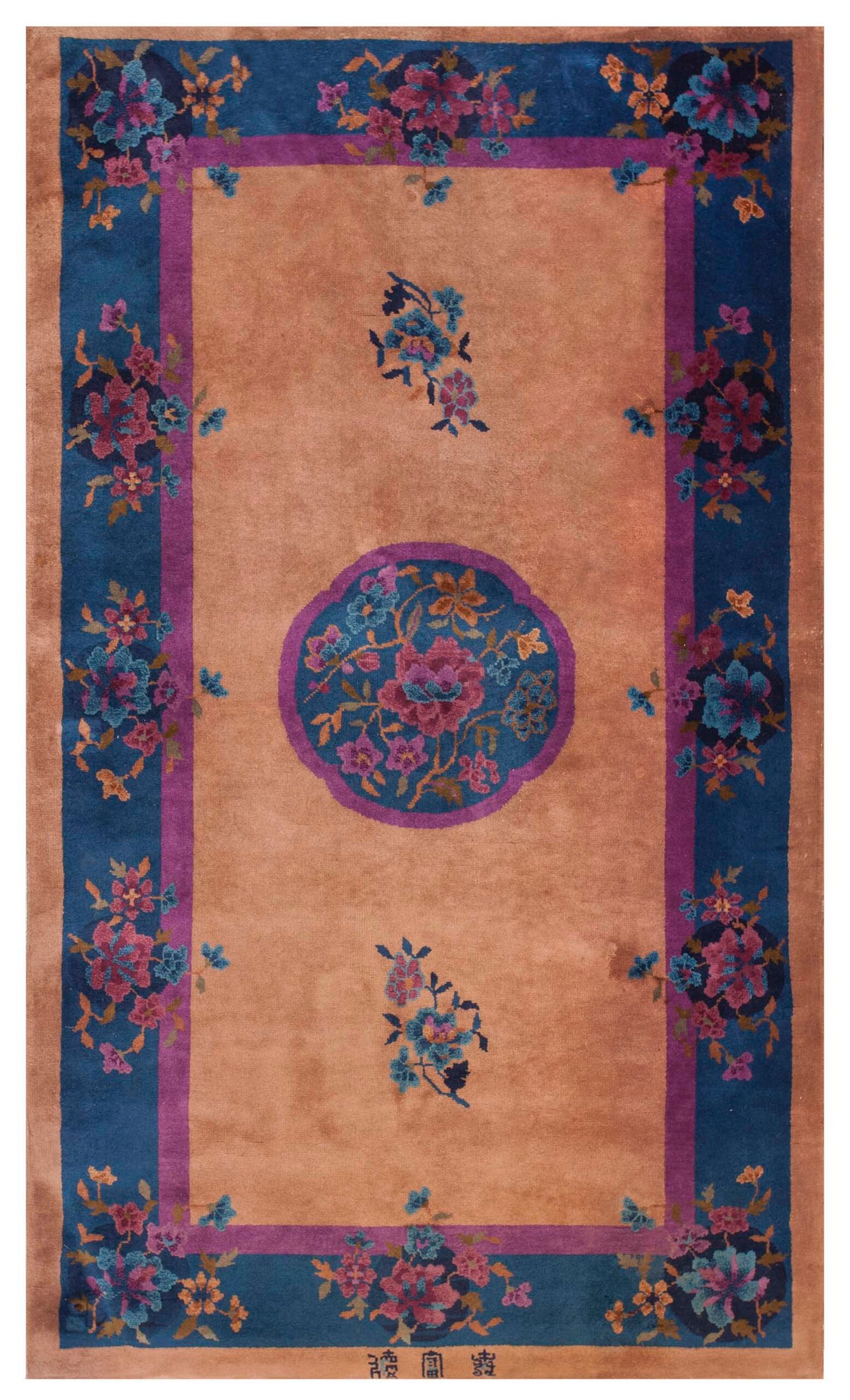 The luxurious, subtly striated wool field is rendered in a warm, rich tone, placing it firmly within the category of salmon coral pink color rugs. This intense, almost luminous hue provides a dramatic backdrop for the stylized floral motifs executed in deep cobalt blue, magenta, and turquoise. The use of saturated, contrasting colors is a hallmark of this period’s decorative arts.