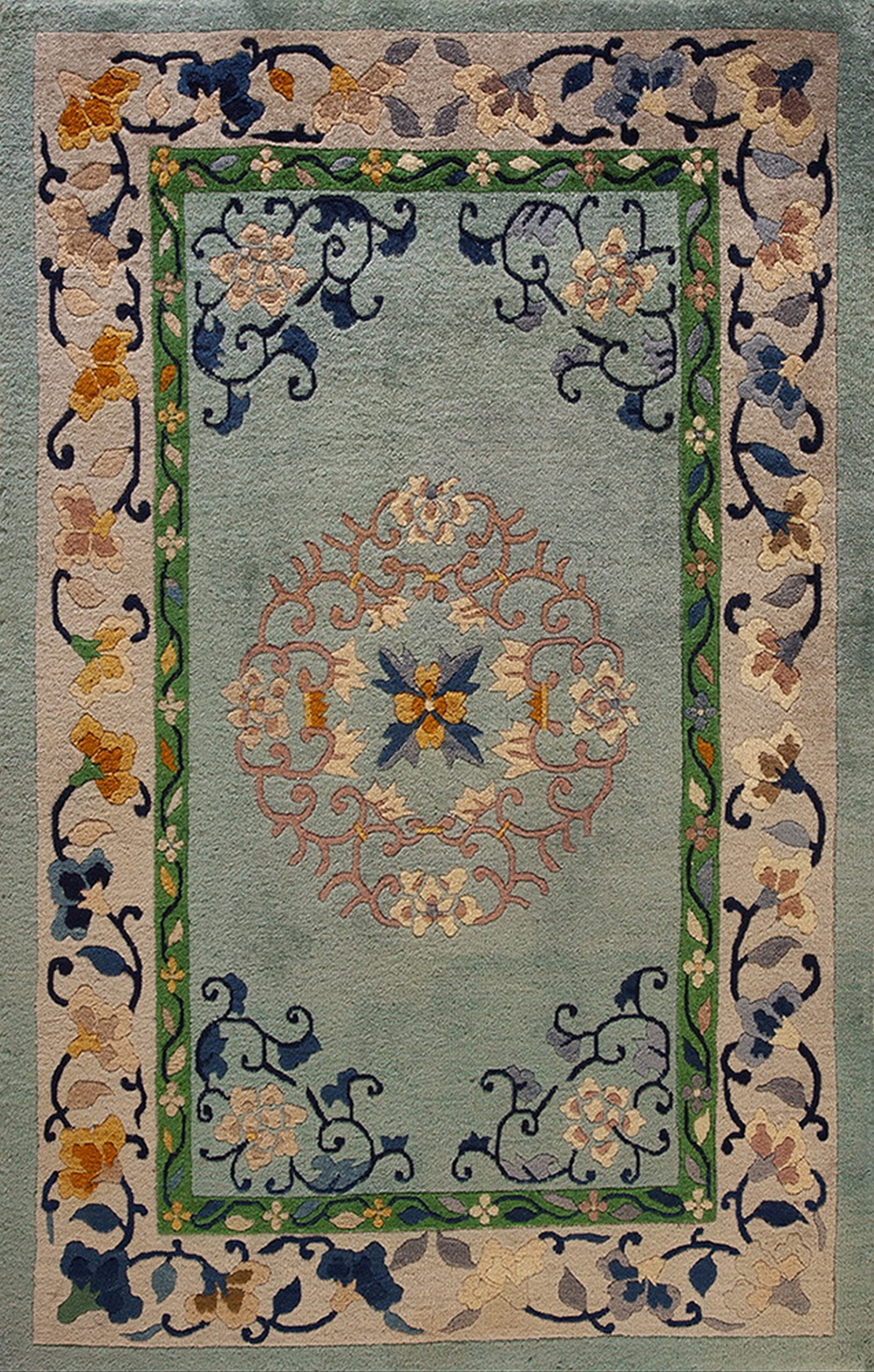 A delicate central medallion, rendered in soft pinks and blues, anchors the composition, radiating outwards into the open field. The primary border features robust, curving vines and blossoms set against a contrasting taupe ground, framed by a striking inner guard band of vibrant emerald green, demonstrating the era’s masterful use of color blocking.