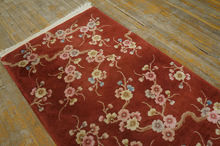 A graceful, all-over pattern of flowering branches dominates the composition. The blossoms are rendered in a sophisticated palette of soft pastels—blush pinks, ivory, and pale gold—with subtle accents of powder blue, lending the rug a distinctly elegant appeal. Such stylized natural motifs are hallmarks of high-quality antique rugs from the early 20th century.