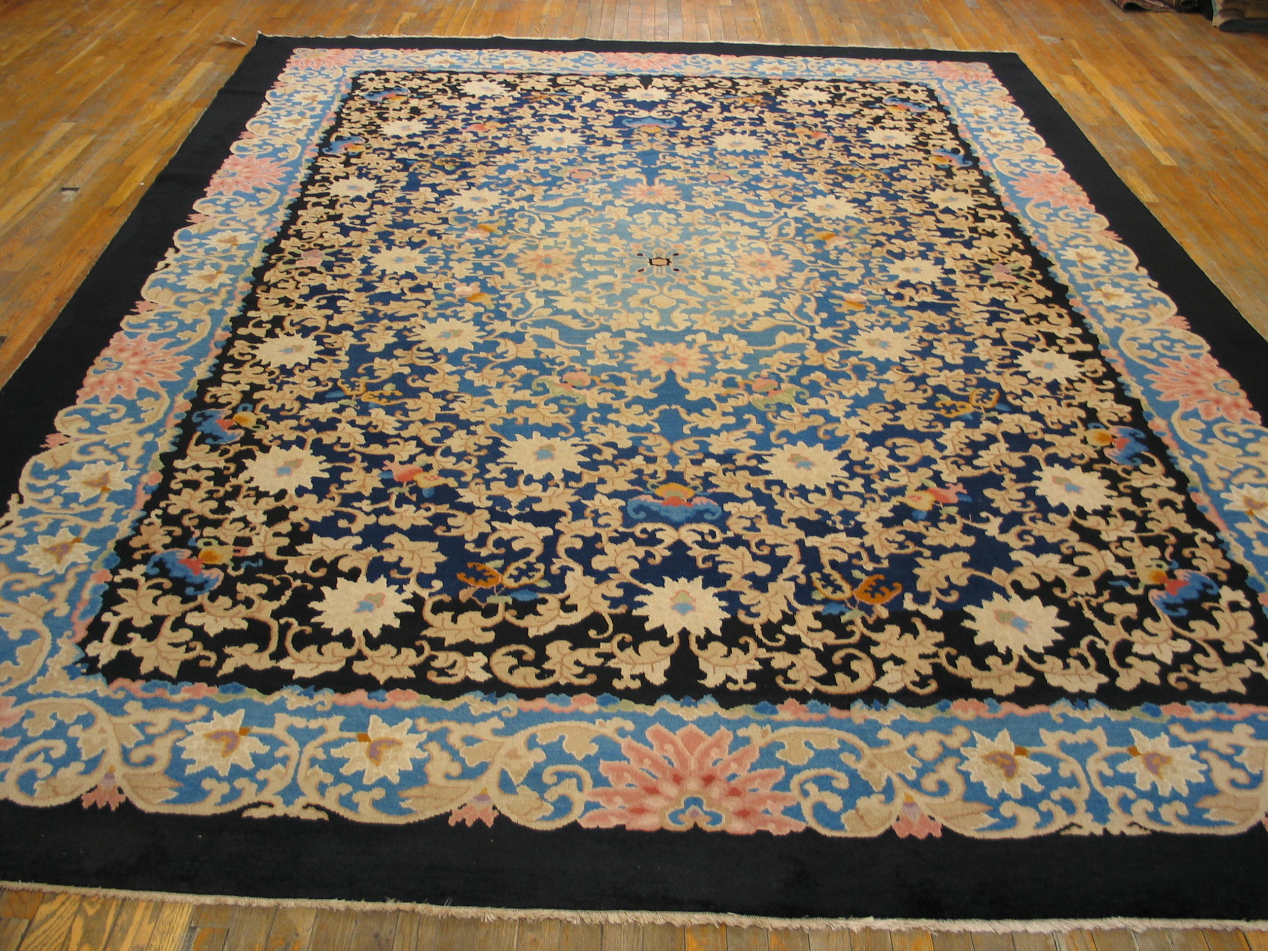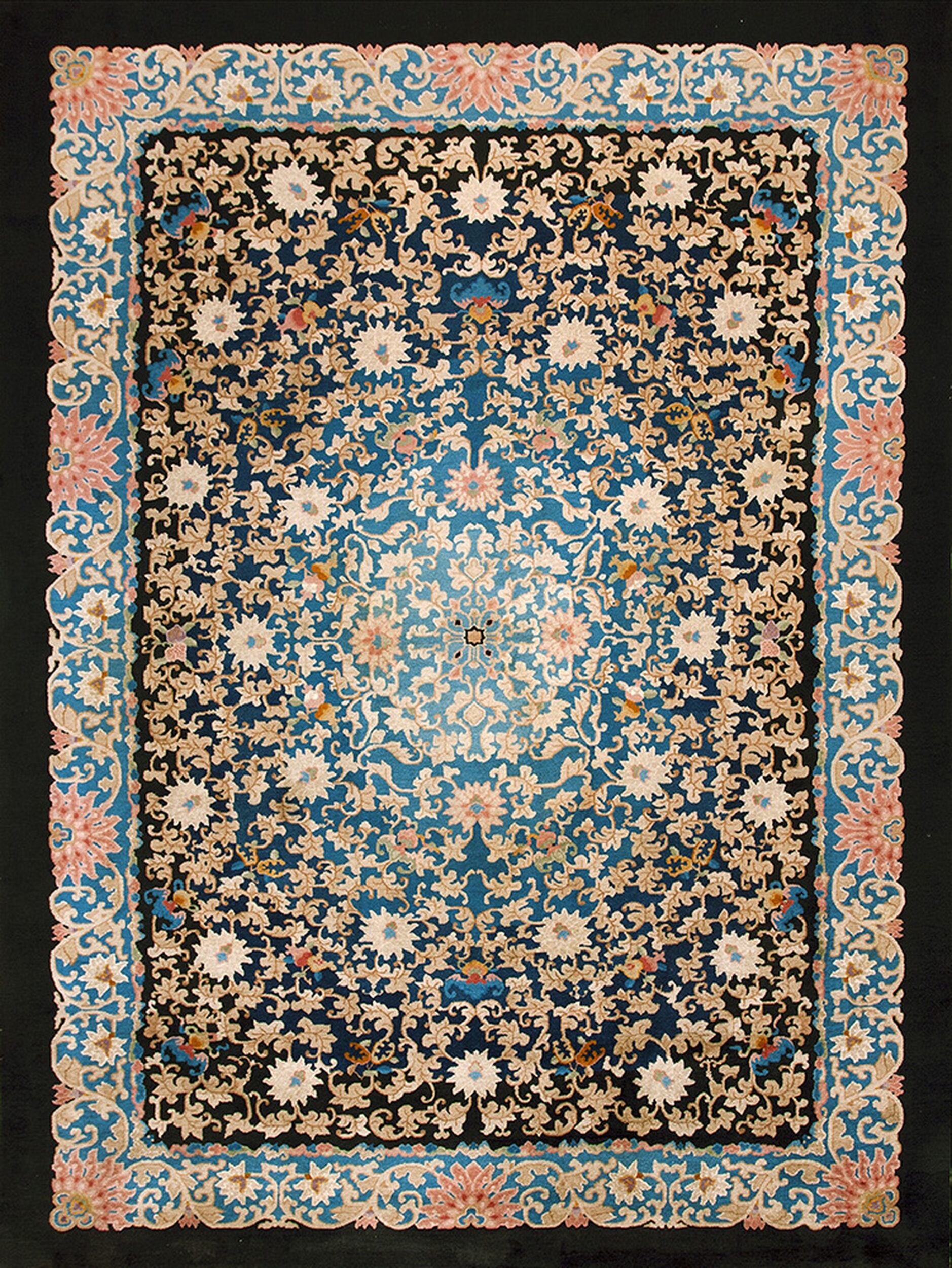 Characteristic of the finest Chinese Art Deco production, the design utilizes an extremely dense, continuous pattern of foliage, blossoms, and small auspicious symbols. Unlike centralized medallion formats, this dense arrangement ensures visual interest across the entire plane, classifying it among the most successful allover rugs produced in the 1920s.