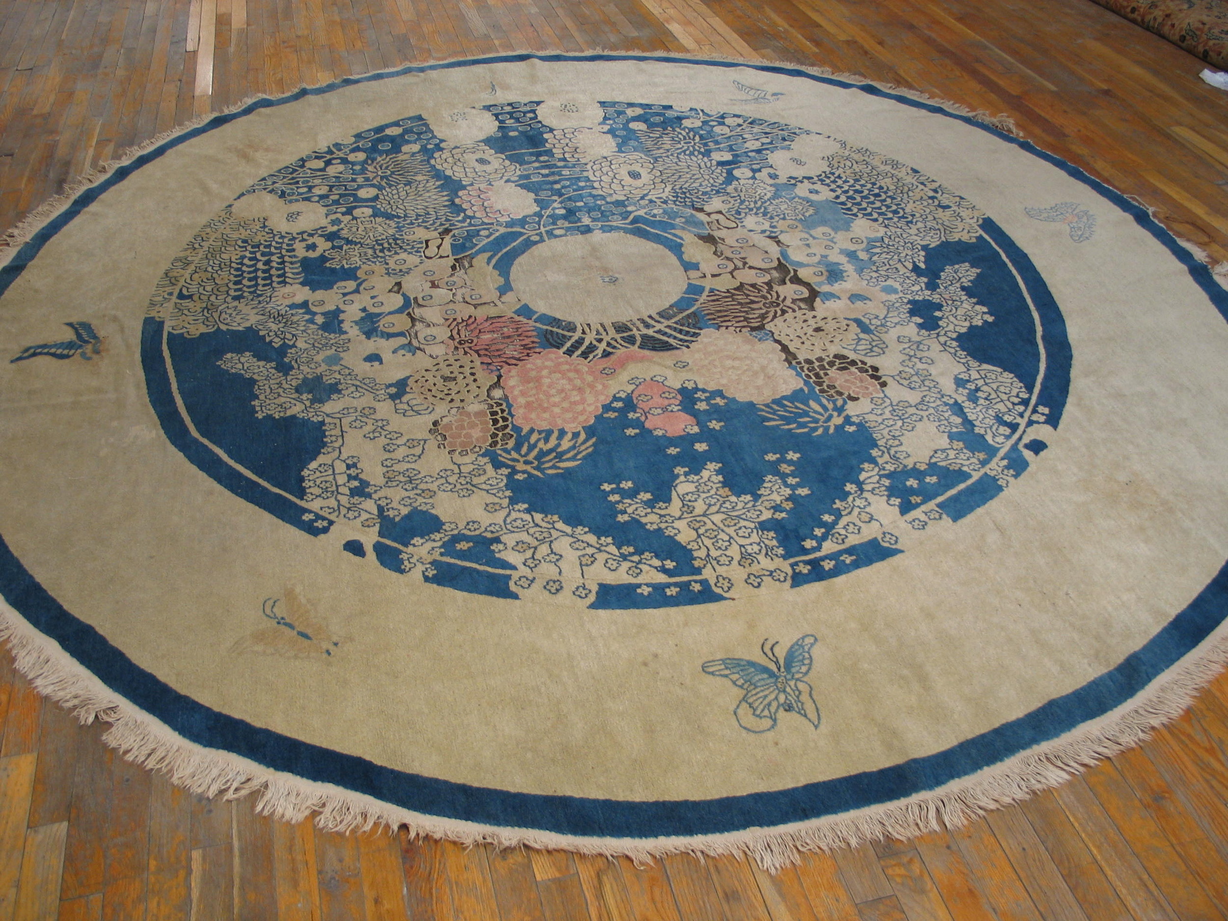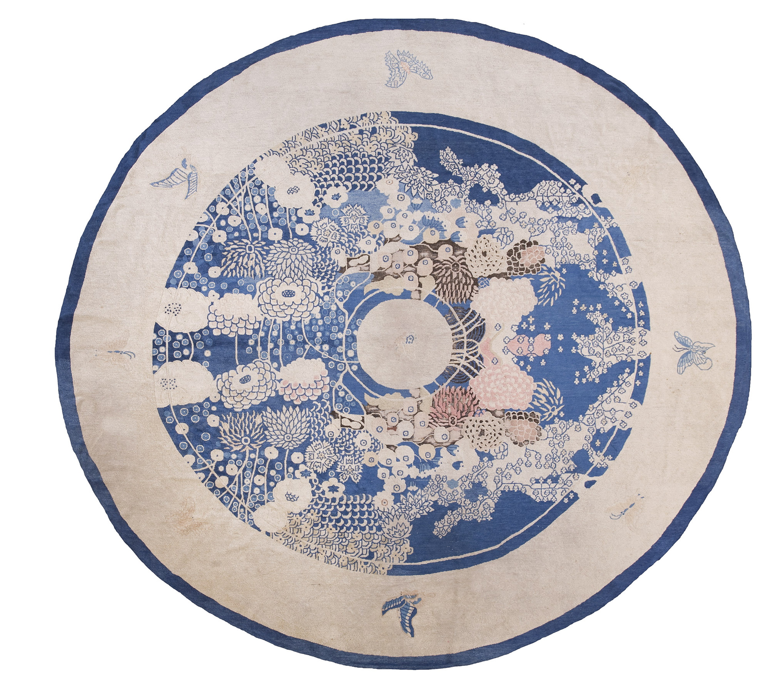 Antique Chinese – Peking Chinese Blue 1930s Rug, Country of Origin: China, Circa Date: 1930s. This exceptional circular weaving represents the finest output of peking rugs from the Art Deco period, showcasing the sophisticated design sensibilities that emerged from the workshops of North China.