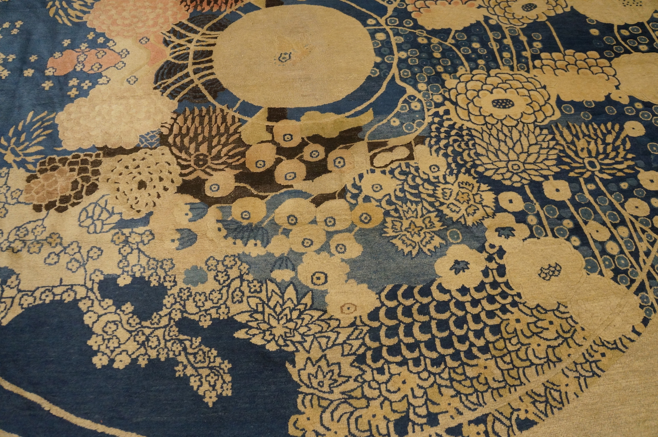 The palette is dominated by a rich, saturated indigo field, making it a compelling example among blue color rugs. This deep hue provides a striking contrast to the densely packed, stylized botanical elements rendered in cream, ivory, and subtle shades of pale pink and brown. The overall effect is one of lush, stylized naturalism, characteristic of the period’s departure from traditional imperial motifs.