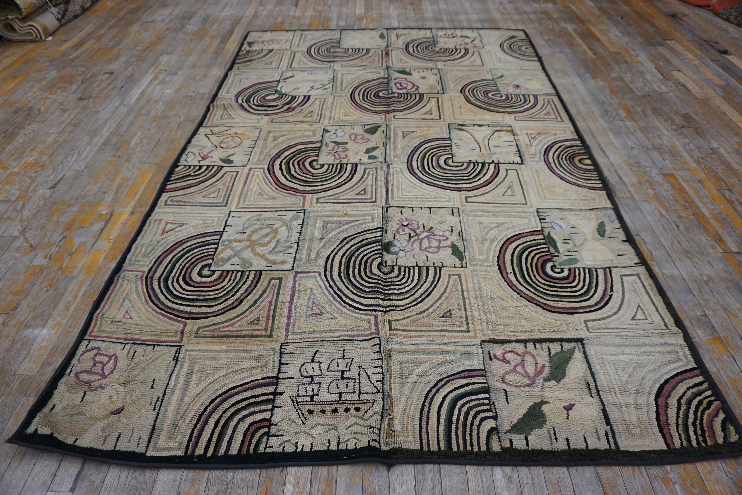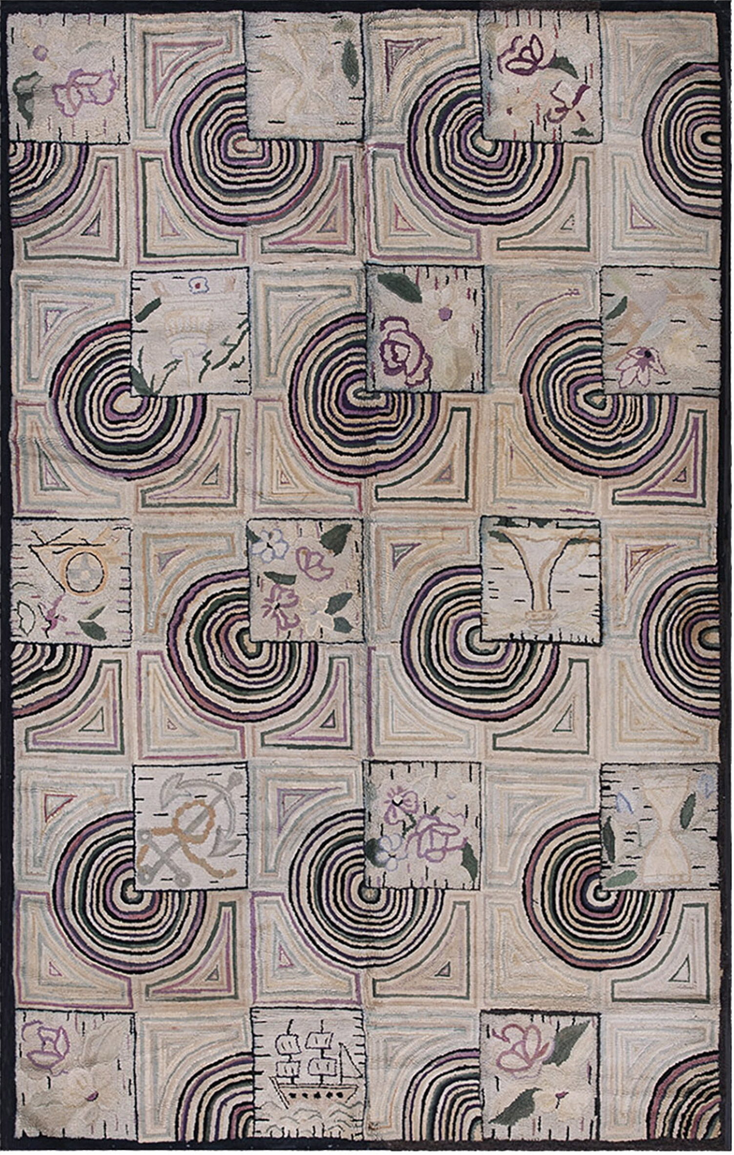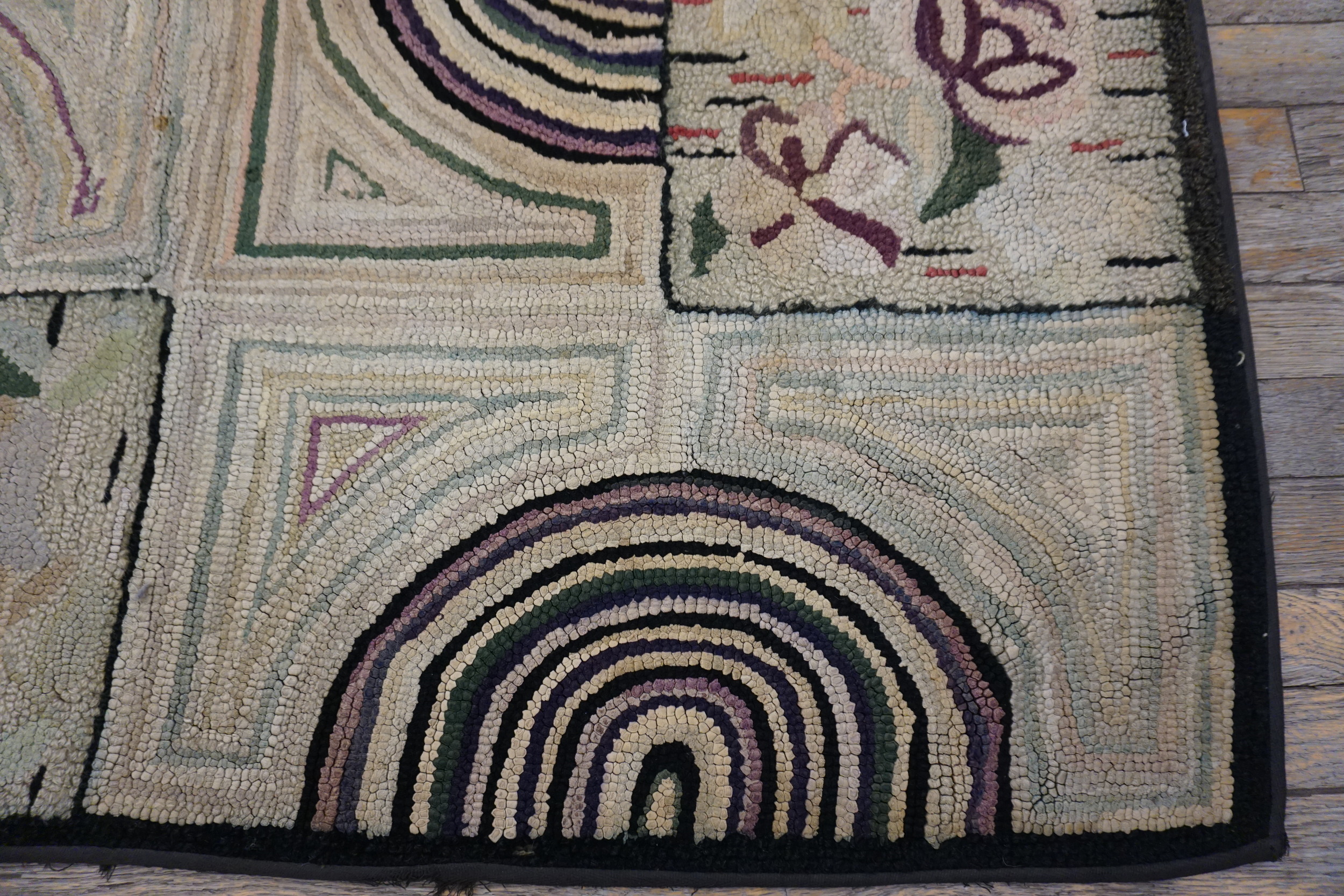 Dating to the 1930s, this runner exemplifies the transition from purely utilitarian hooked mats to decorative, collectible antique rugs. Its blend of bold Art Deco geometry and whimsical folk motifs makes it a rare and highly desirable example of American textile heritage.