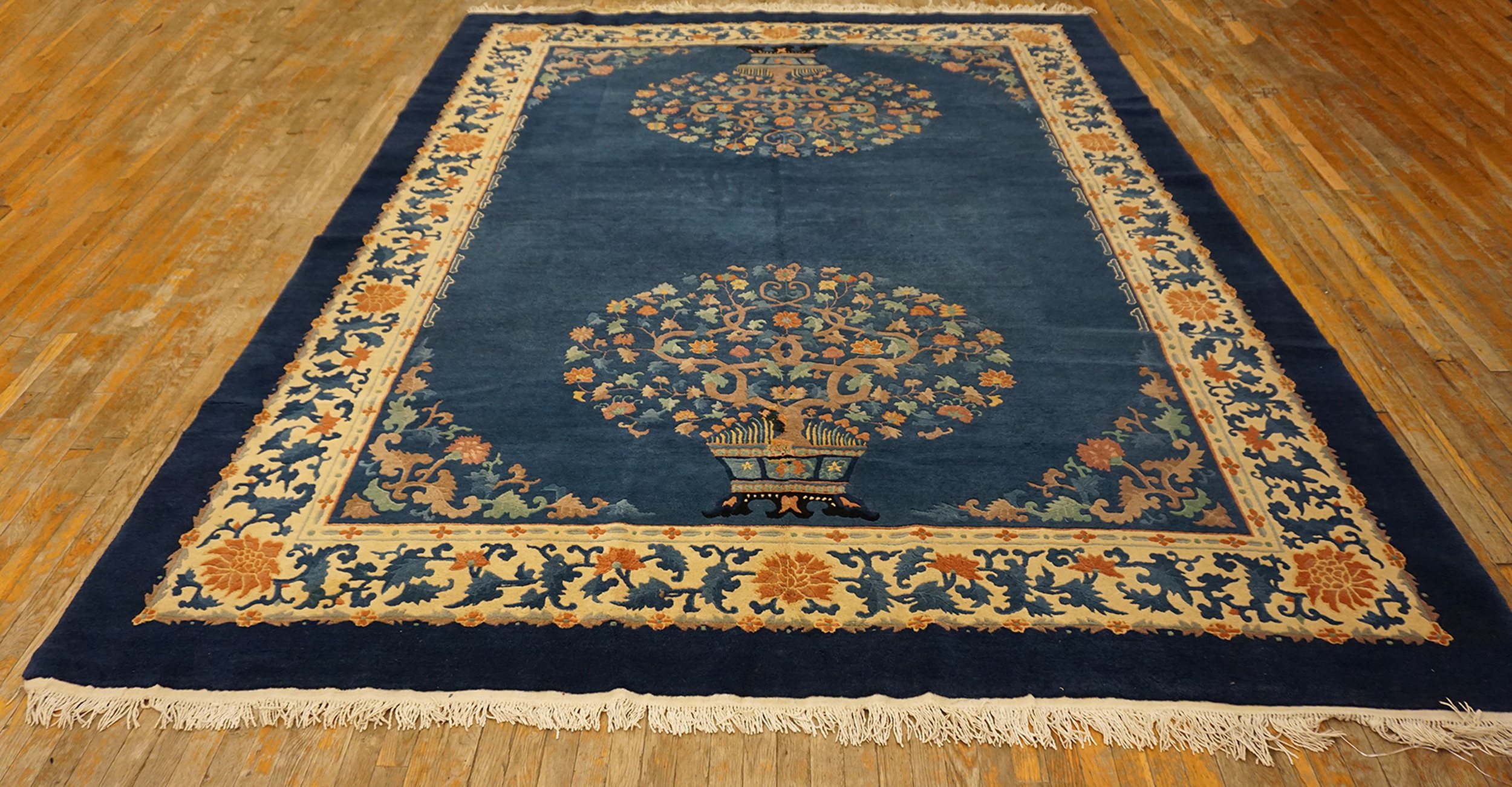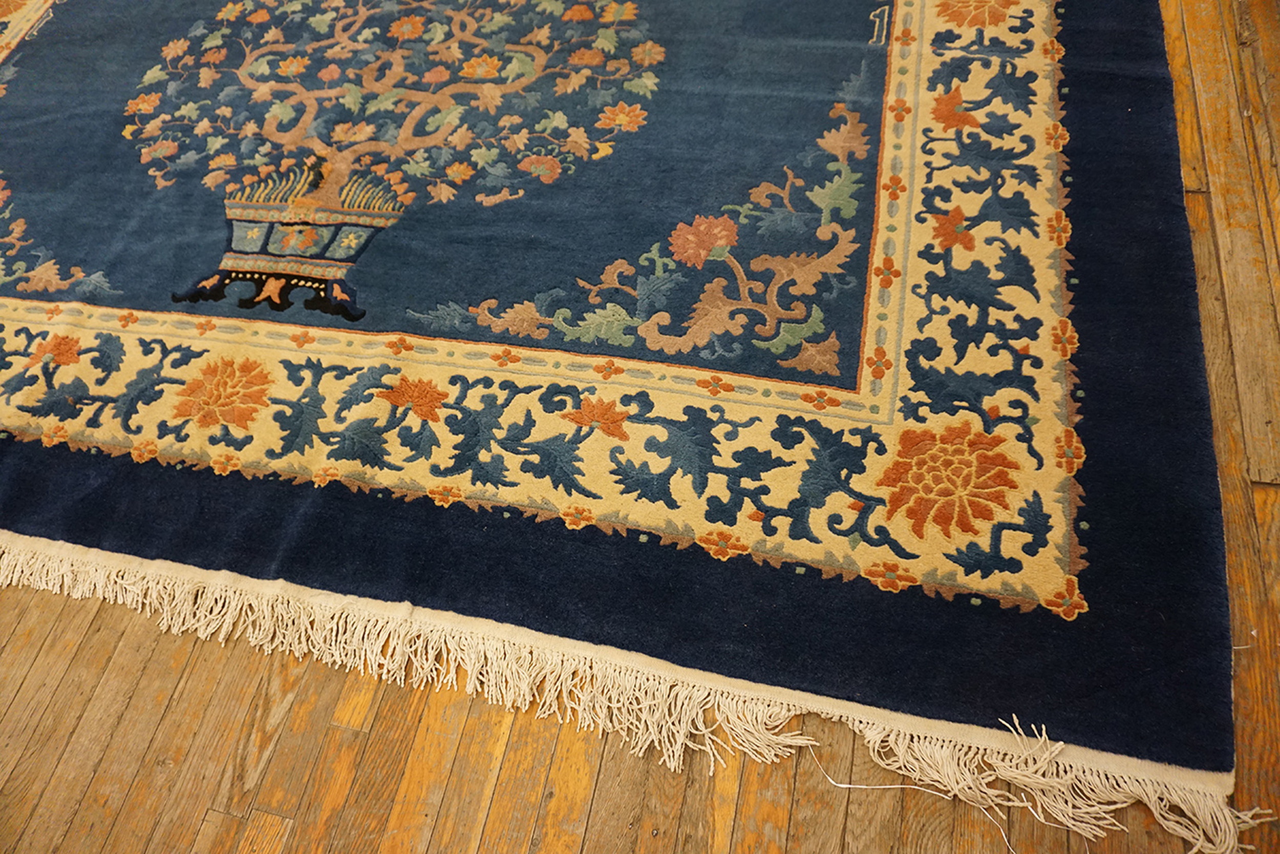 Antique Chinese – Peking Blue 1935 Rug, Circa Date: 1935. This exceptional example of early 20th-century Chinese weaving features the highly sought-after Peking blue field, a deep, saturated indigo that provides a dramatic backdrop for the stylized motifs. The mastery of dye work is evident in the rich depth of this specific shade, placing it among the finest blue color rugs of the period.
