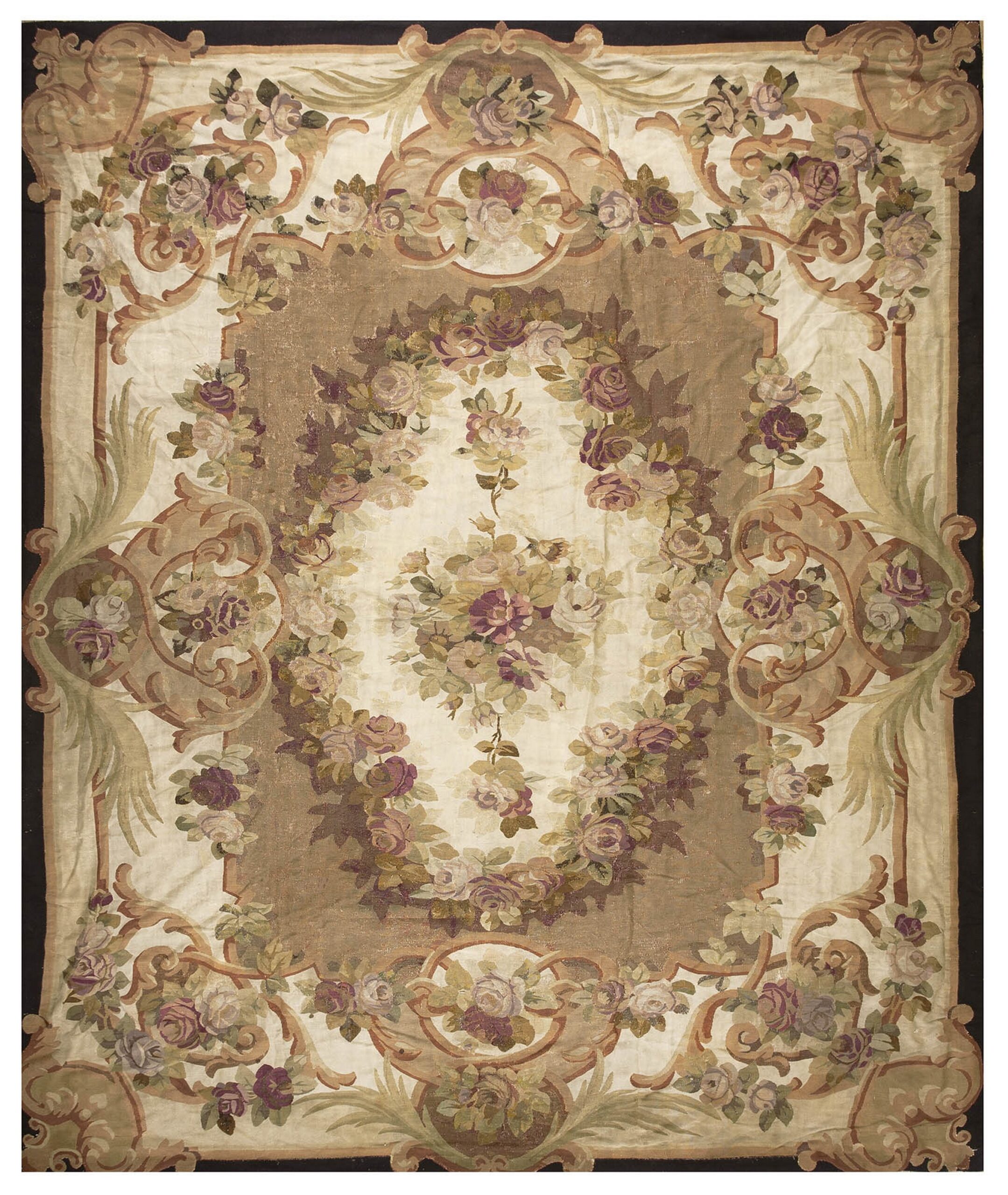 Antique Aubusson French Floral, Medallion Flat Weave Rug, Circa Date: 1870s. This exquisite French textile embodies the refined elegance of the late Second Empire period. Woven in the famed Aubusson workshops, known for their masterful tapestry and flat-weave production, this piece showcases the delicate, painterly quality characteristic of the era’s finest antique rugs.