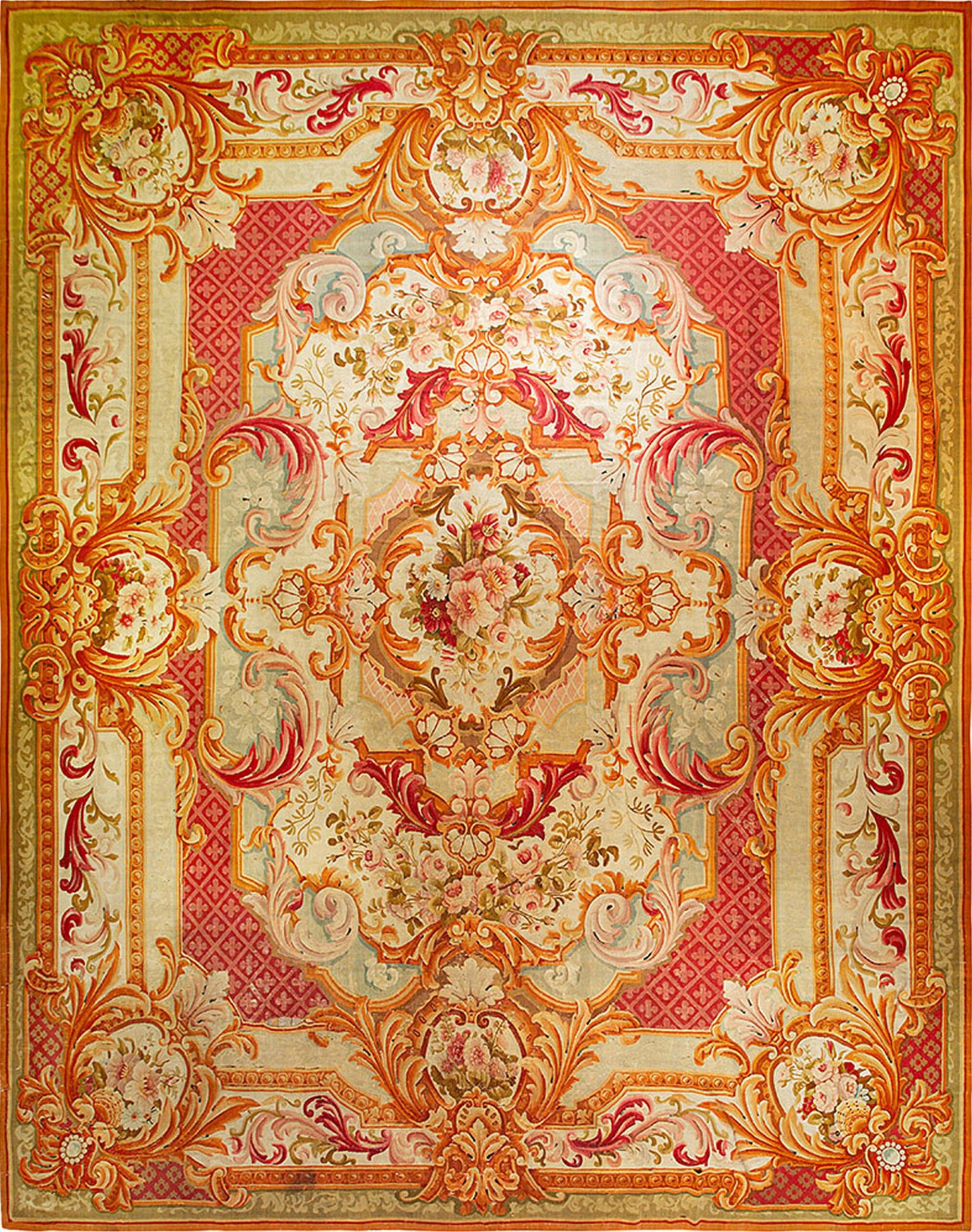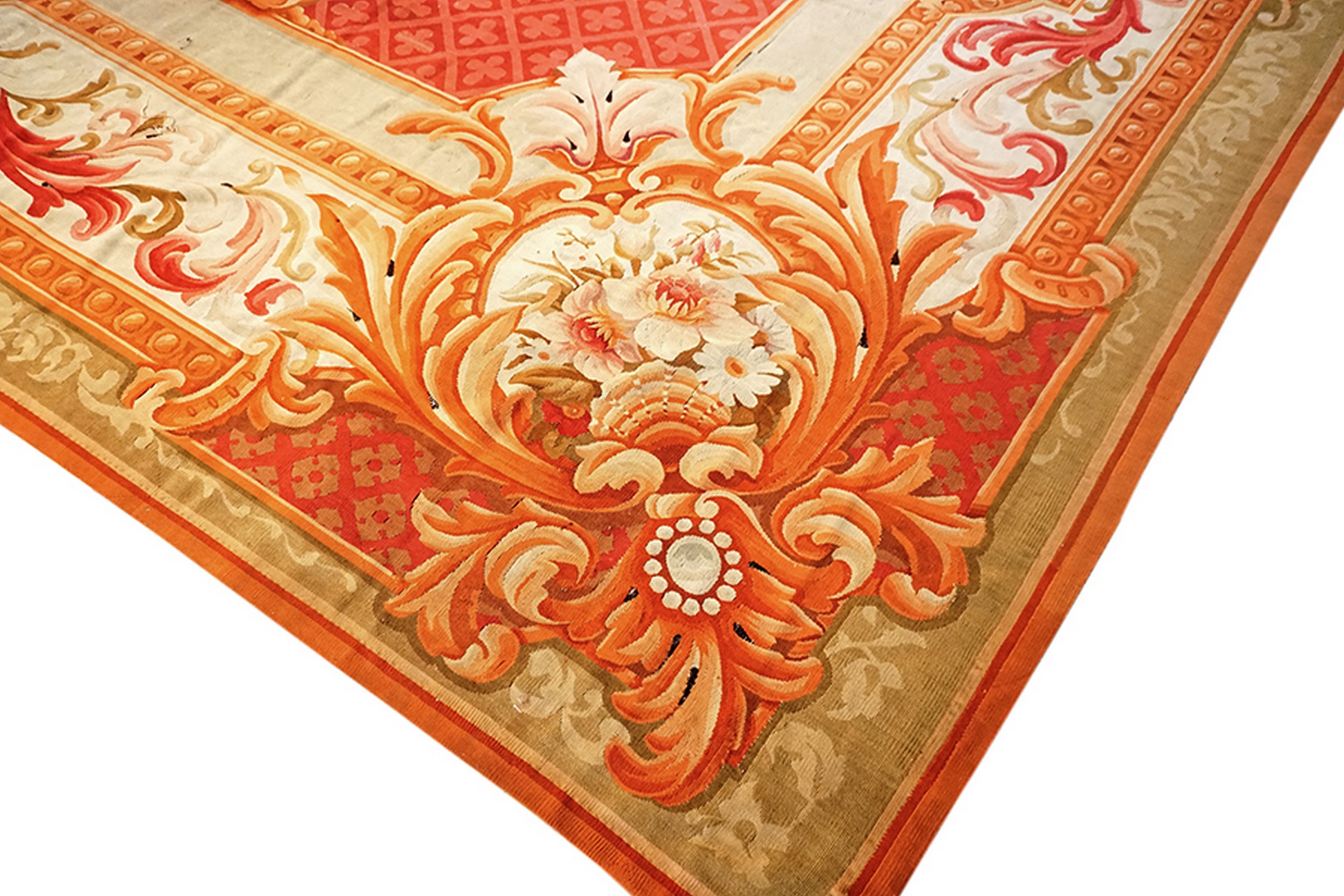 Unlike the high-pile Savonnerie carpets, this piece utilizes the specialized flat-weave technique, giving the intricate design a crisp, defined quality. This technique is the hallmark of the Aubusson rugs, renowned for their ability to perfectly translate architectural and decorative patterns onto the floor plane, making this an exceptional collector’s item.