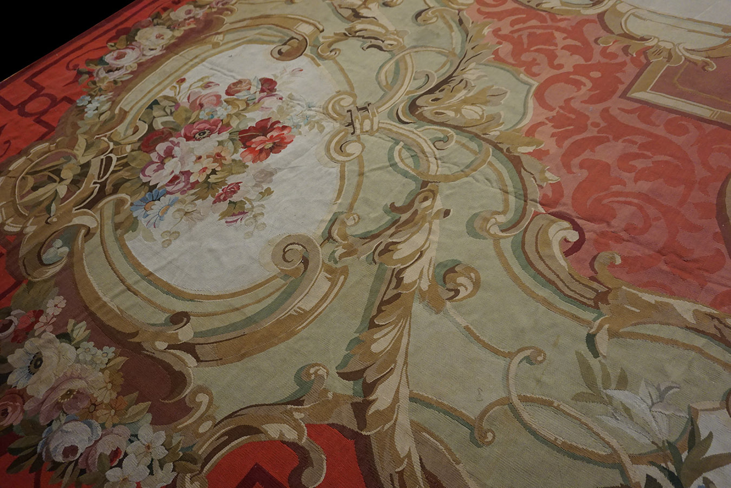 Antique Aubusson Oversized Large Oversized Big Rug Wool Coral, Country of Origin: France, Circa Date: 1870s. This magnificent example of Aubusson rugs captures the essence of late 19th-century French decorative arts, showcasing the opulent and highly detailed aesthetic favored during the Second Empire period. The low-pile wool construction emphasizes the painterly quality of the design, typical of the workshops that supplied the grandest Parisian residences.