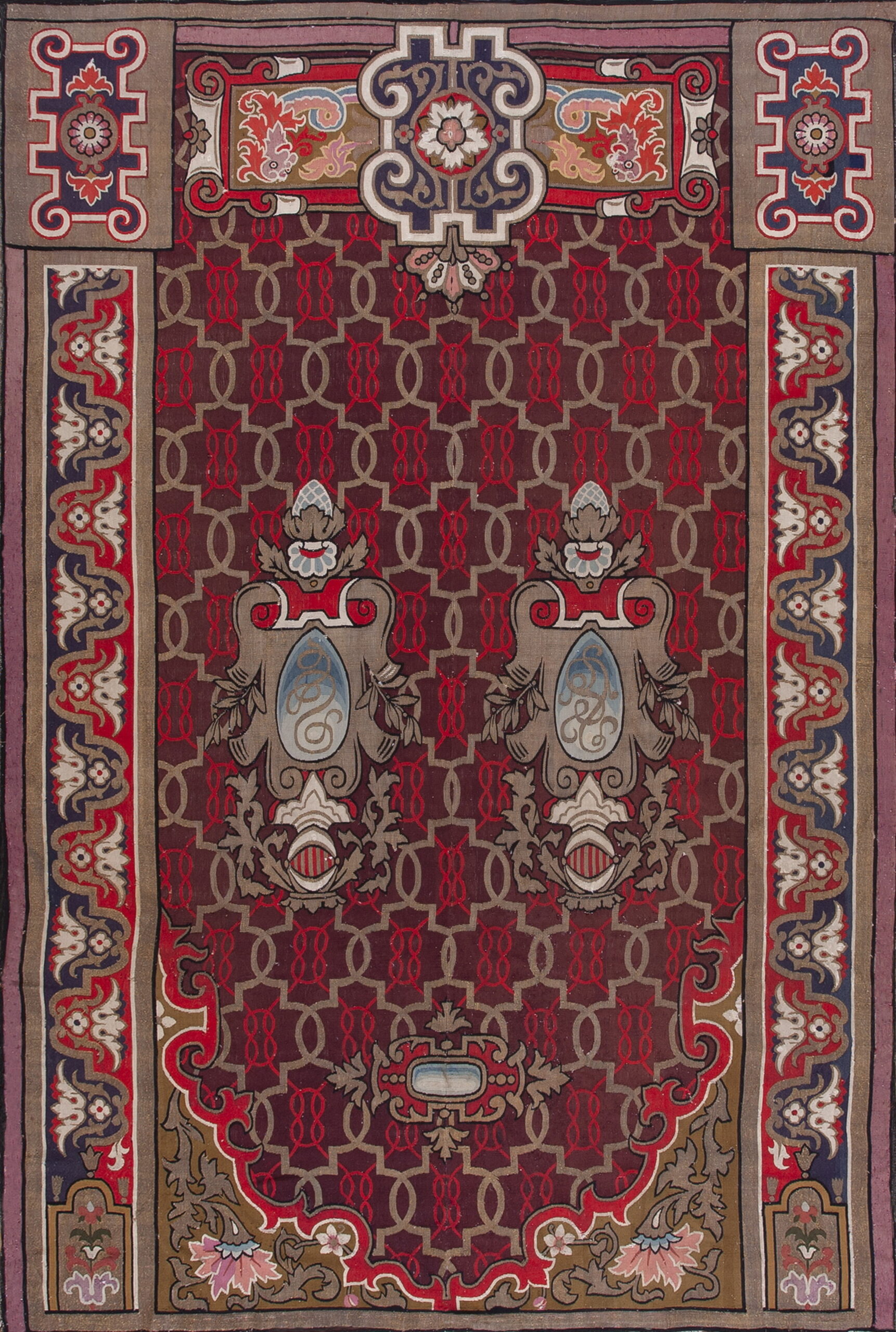 The central field is dominated by a complex, allover geometric trellis pattern rendered in deep maroon and rich brown tones. Interspersed within this lattice are vibrant accents of red and a sophisticated use of salmon coral pink detailing, which adds unexpected warmth and depth to the composition. This dense field contrasts sharply with the ornamental borders, a hallmark of high-quality Aubusson production.