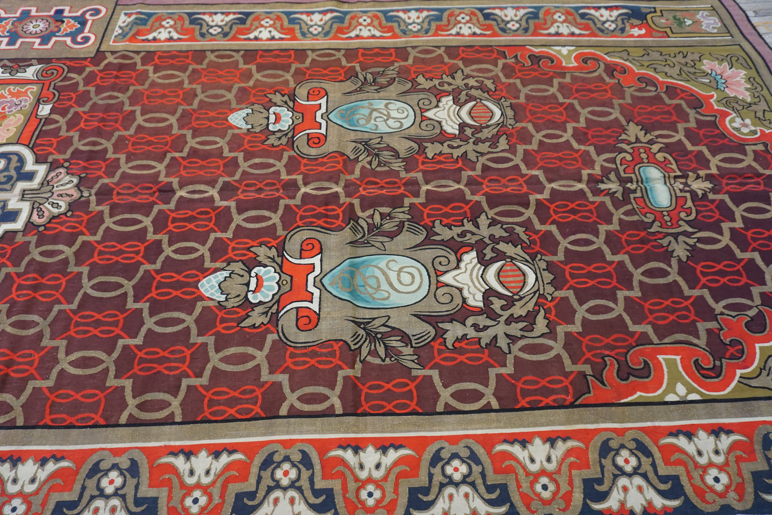 The elaborate borders feature highly stylized cartouches, scrolling acanthus leaves, and heraldic motifs, suggesting a commission for a grand estate or aristocratic residence. The scale of the piece indicates it was intended as a room size centerpiece, designed to anchor a formal salon or dining hall. The design elements, though geometric in the field, lean into Baroque revivalism in the framing elements.