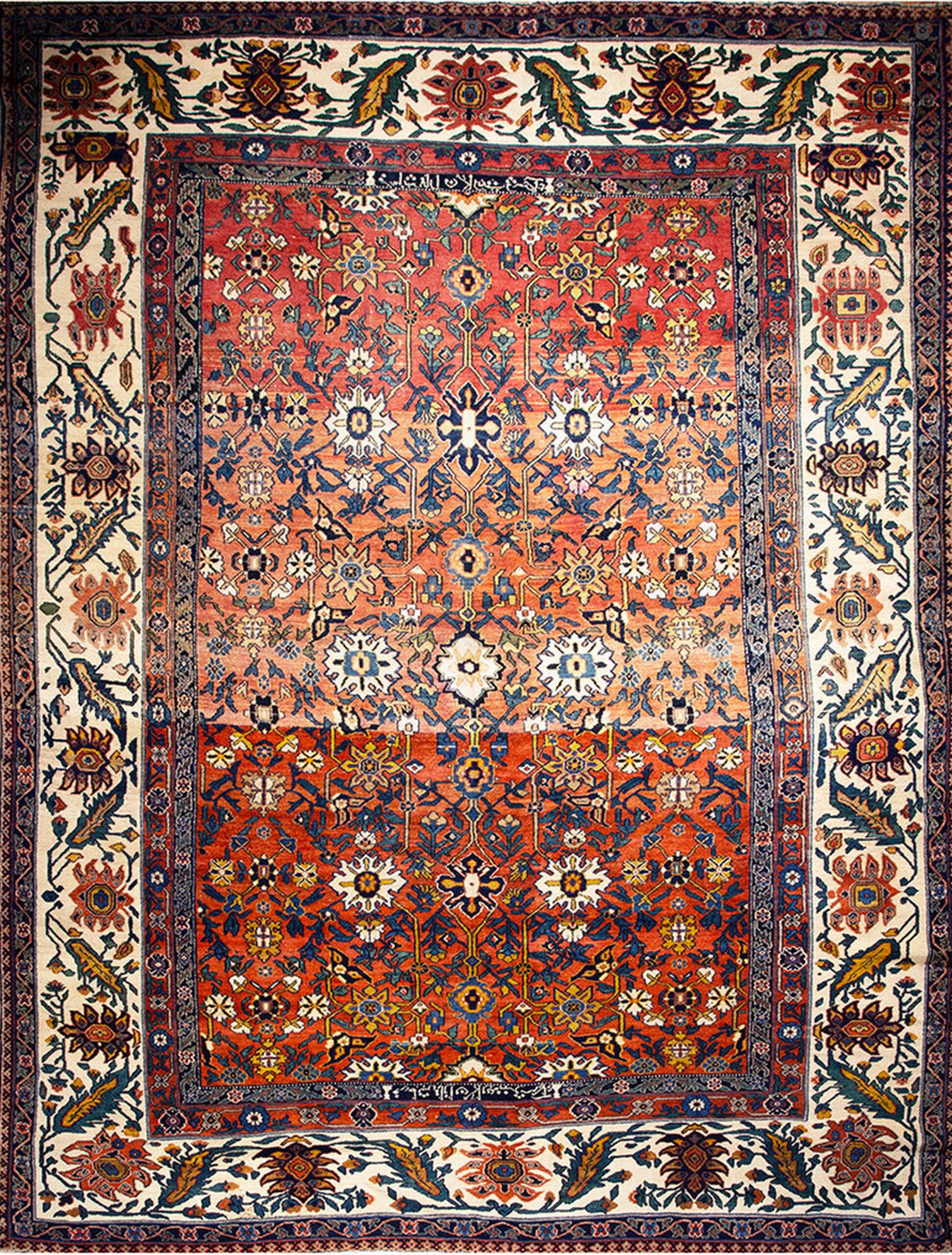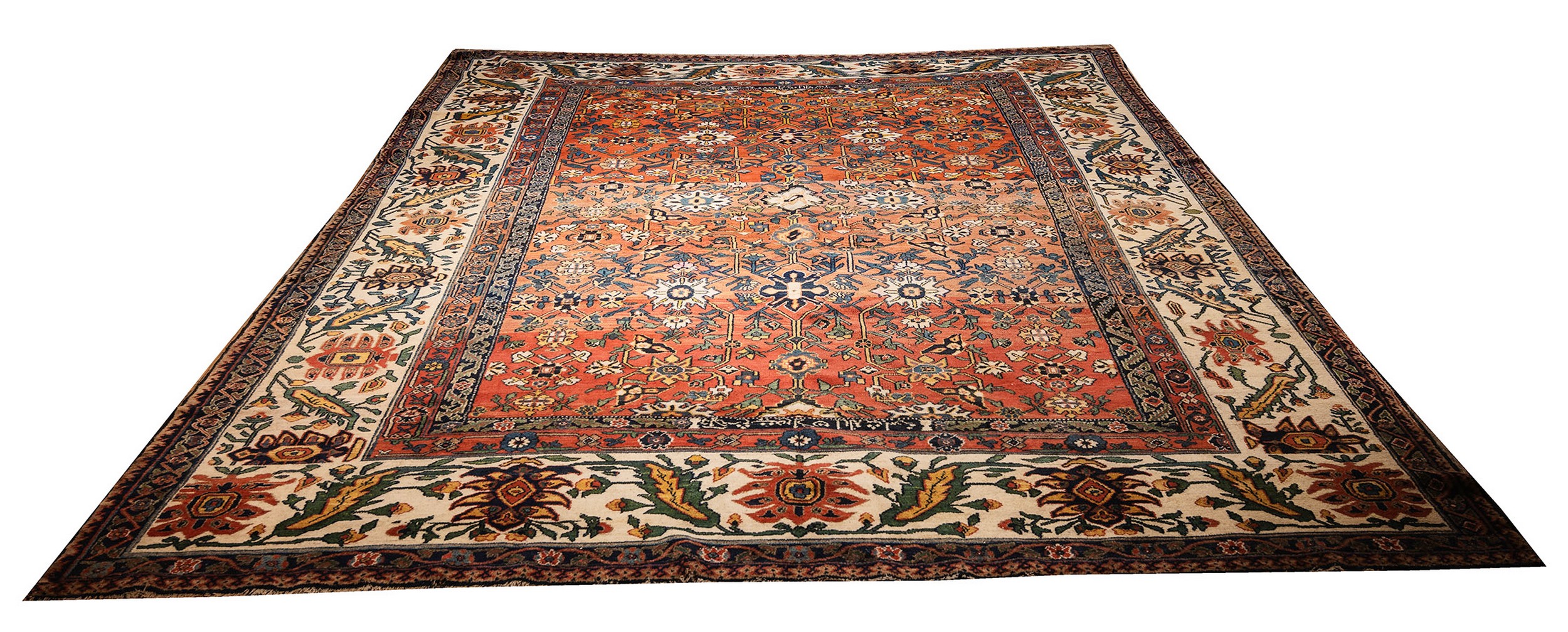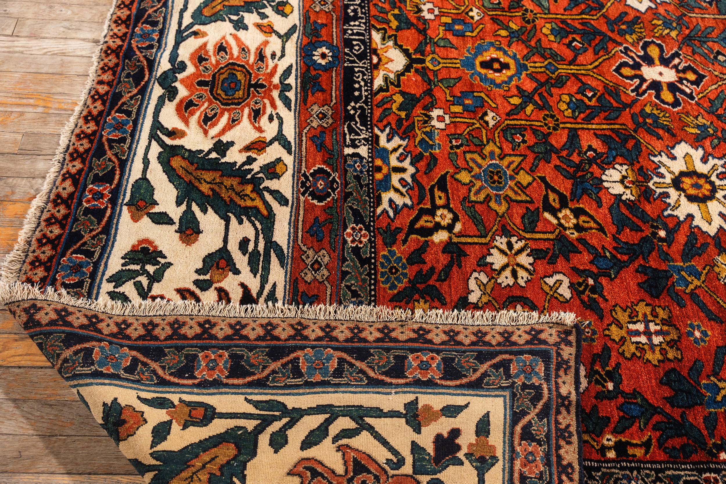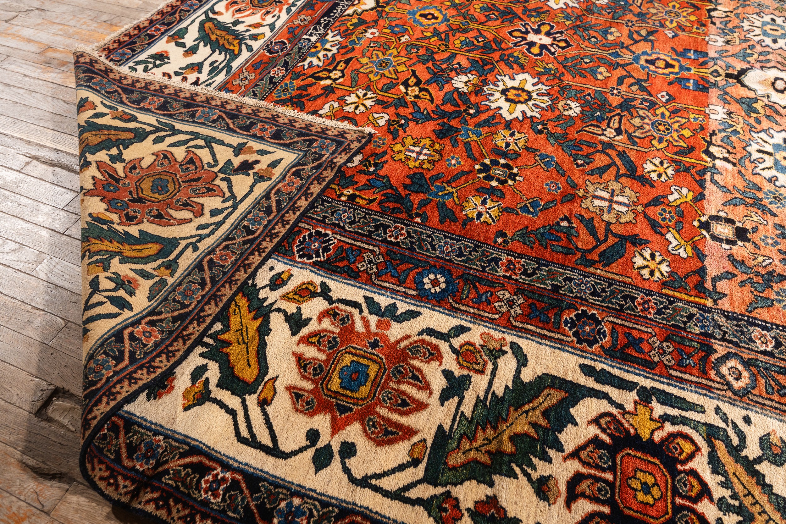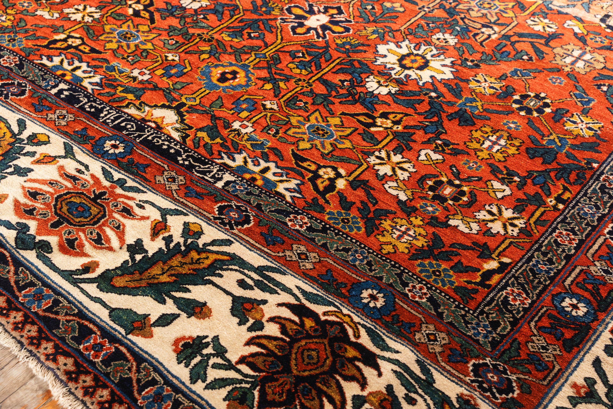 Framed by a wide, contrasting ivory border, the rug features grand, stylized palmettes interspersed with meandering leafy vines. The use of dark navy and rich forest green in the border elements ensures visual weight and definition, balancing the intensity of the central field. The knotting is tight and consistent, speaking to the enduring quality of early 20th-century Persian craftsmanship.