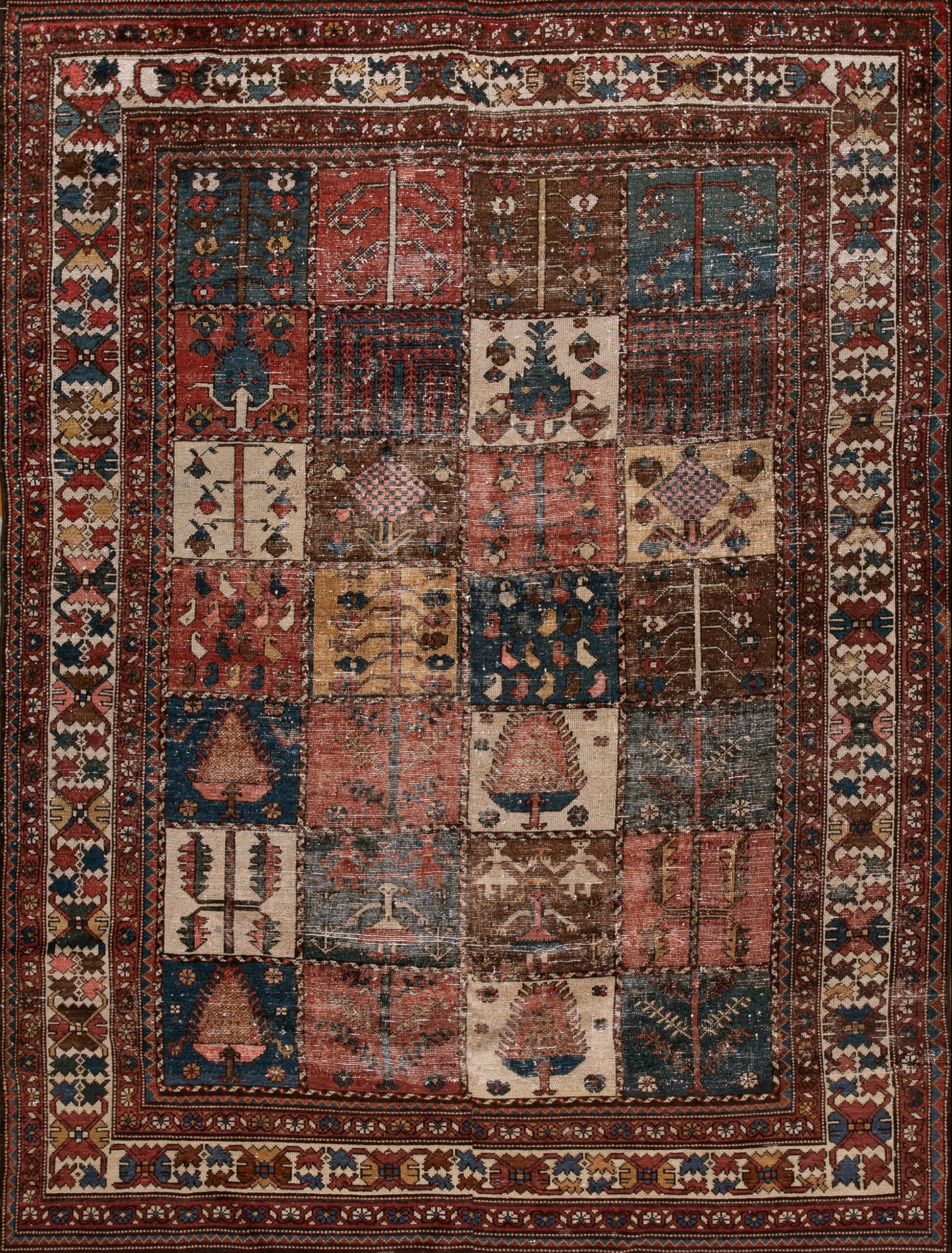 The composition successfully utilizes a complex, repeating structure while maintaining the visual flow characteristic of an allover rug pattern. Within the individual panels, weavers have rendered traditional iconography—including stylized Trees of Life, abstract geometric forms, and folk figures—with remarkable primitive charm.
