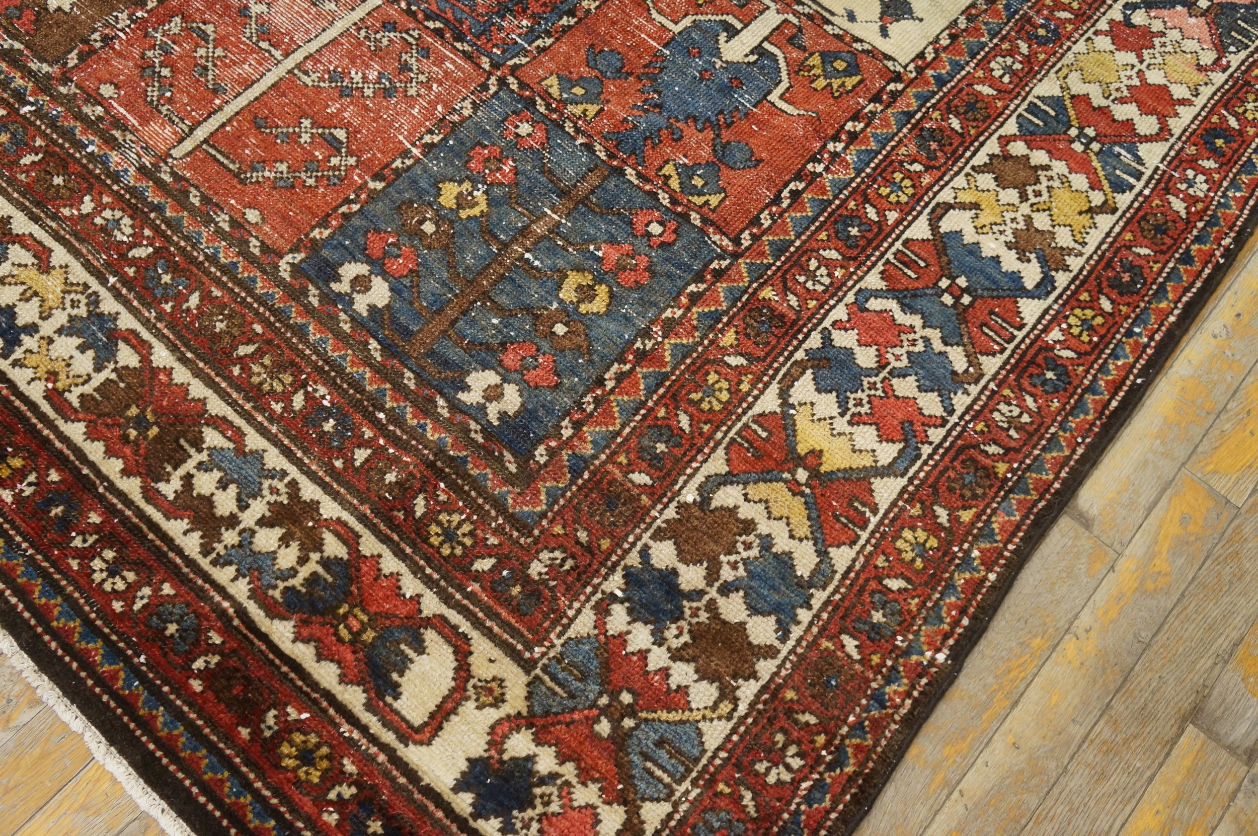 The palette is rich and earthy, featuring deep indigo, oxidized terracotta, and warm ochre. The natural dyes have aged beautifully, creating a harmonious patina that defines this category of multicolor jewel-tone rugs.