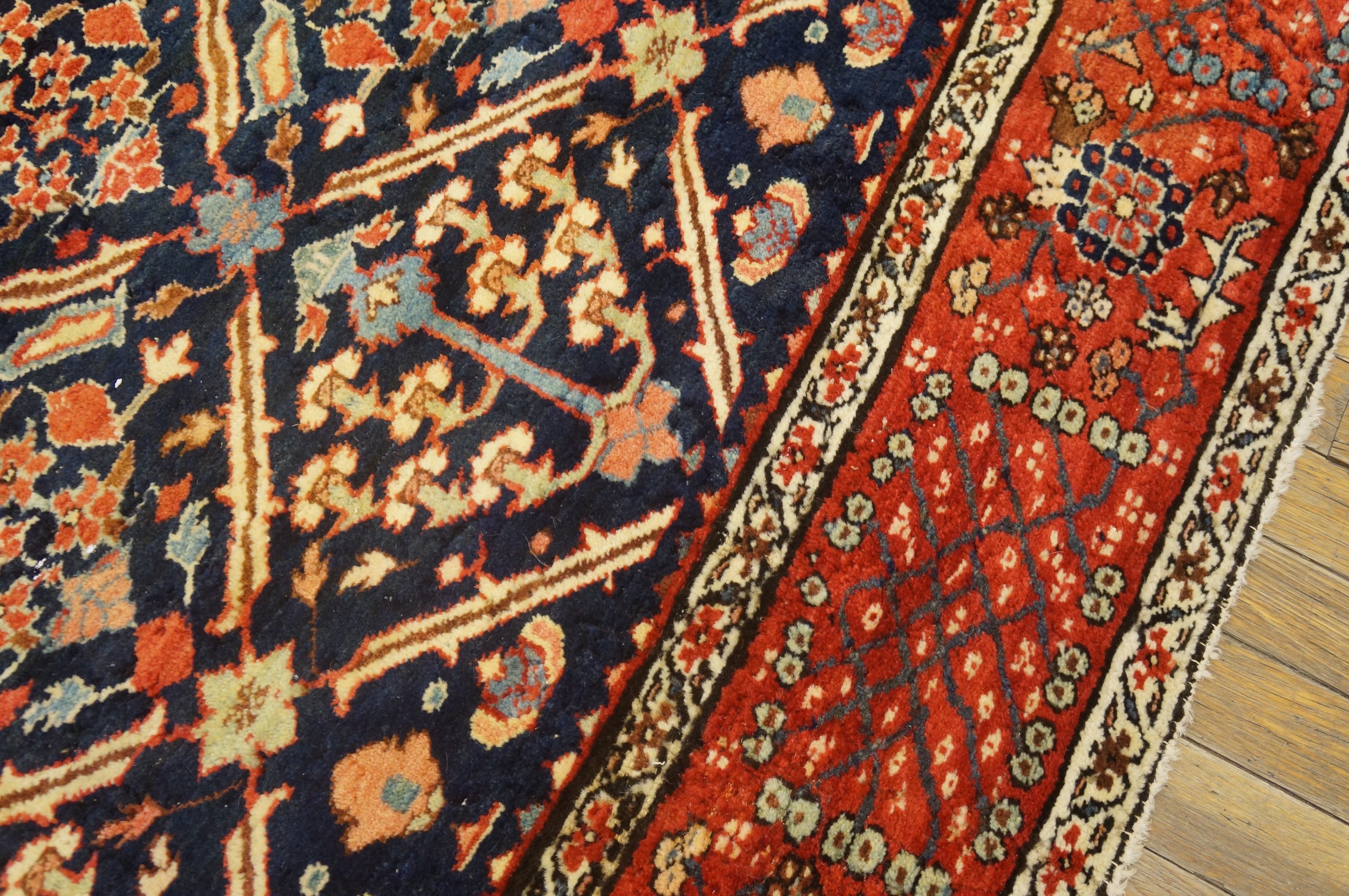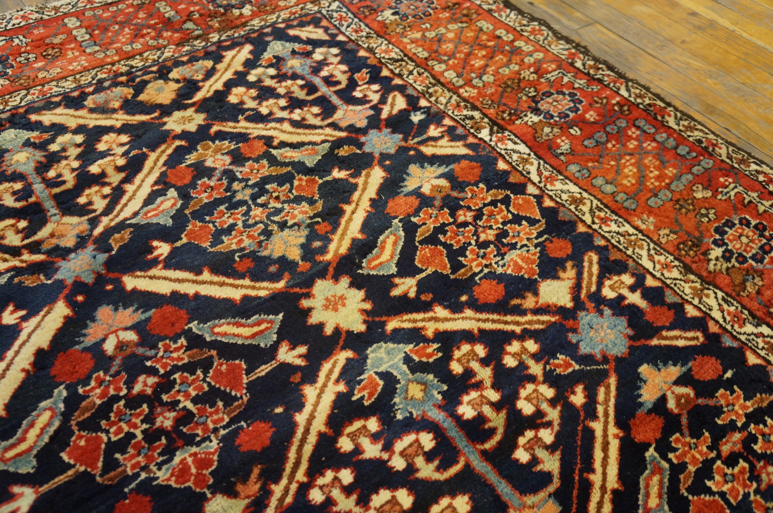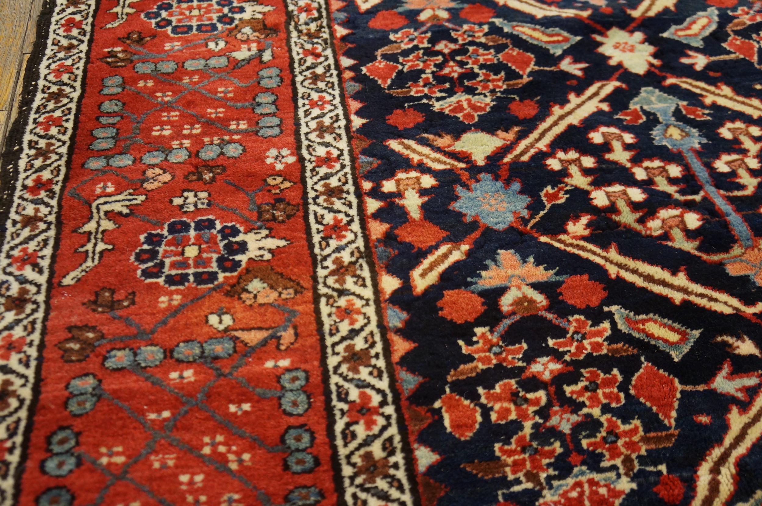 The palette is masterfully balanced, utilizing a rich, nearly black indigo ground that provides a dramatic contrast to the vibrant main border. This border is rendered in a deeply oxidized, earthy rust red color, accented by secondary details in soft sky blue, saffron, and ivory. The natural dyes have mellowed beautifully over the last century and a half, enhancing the rug’s antique character.