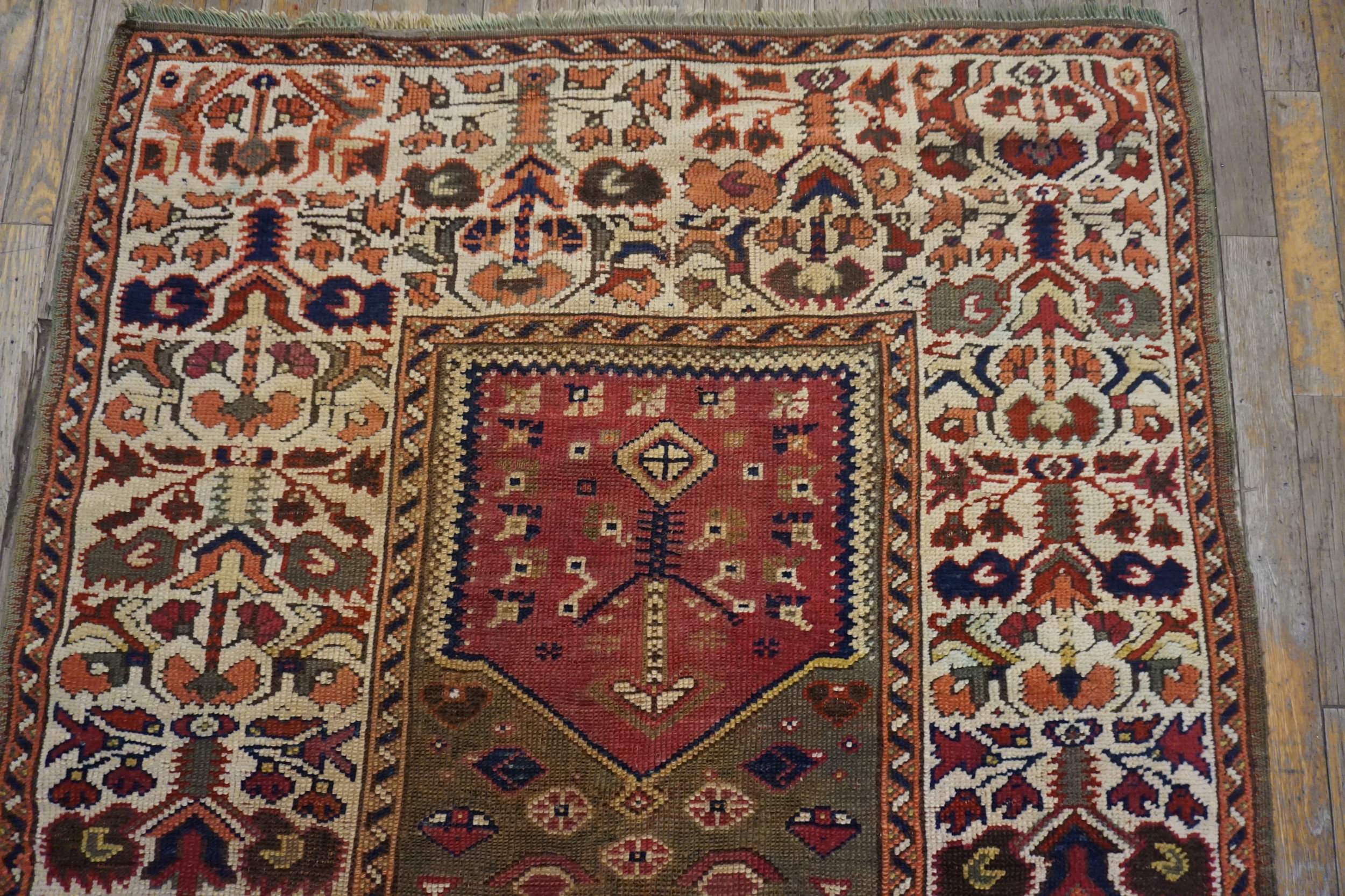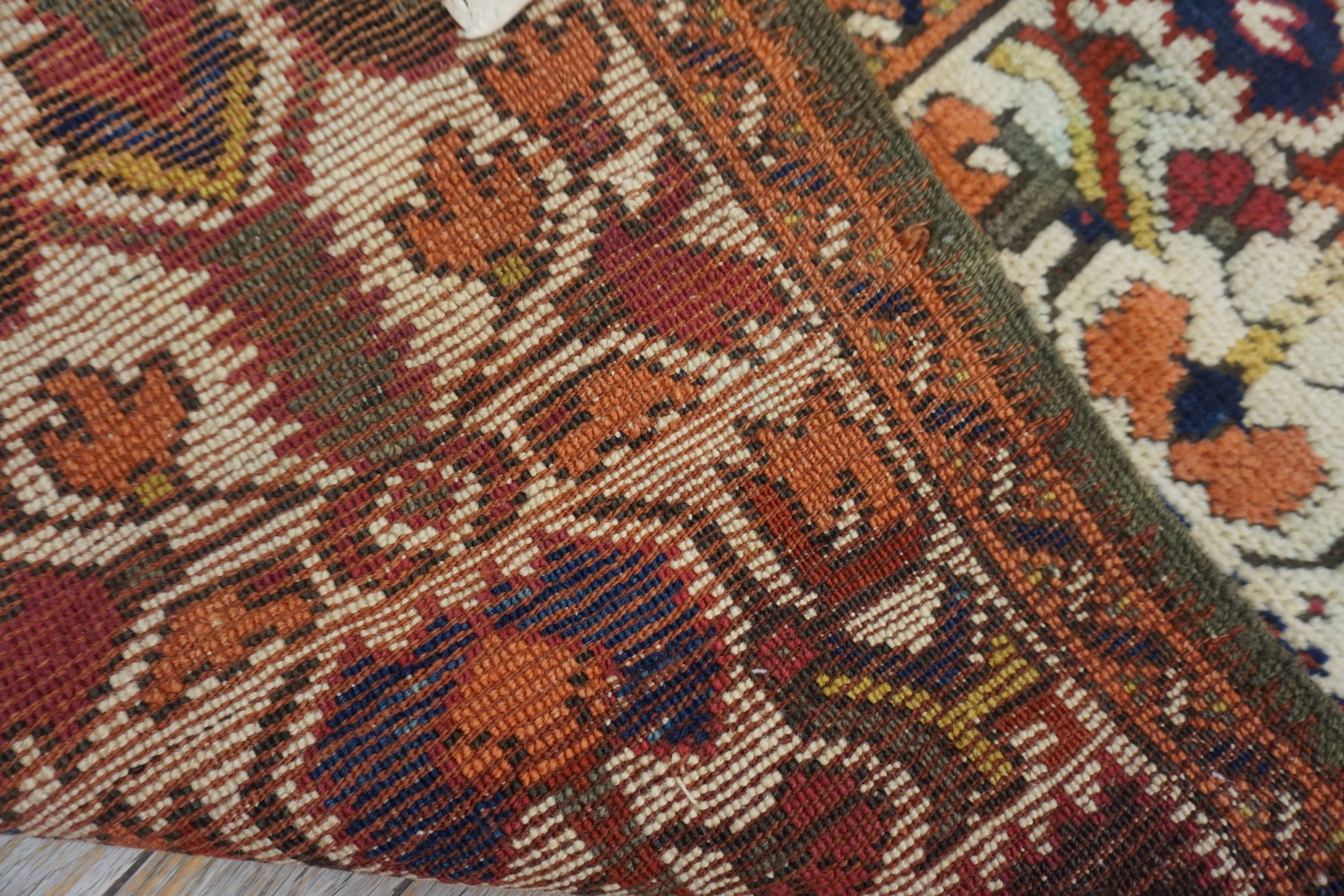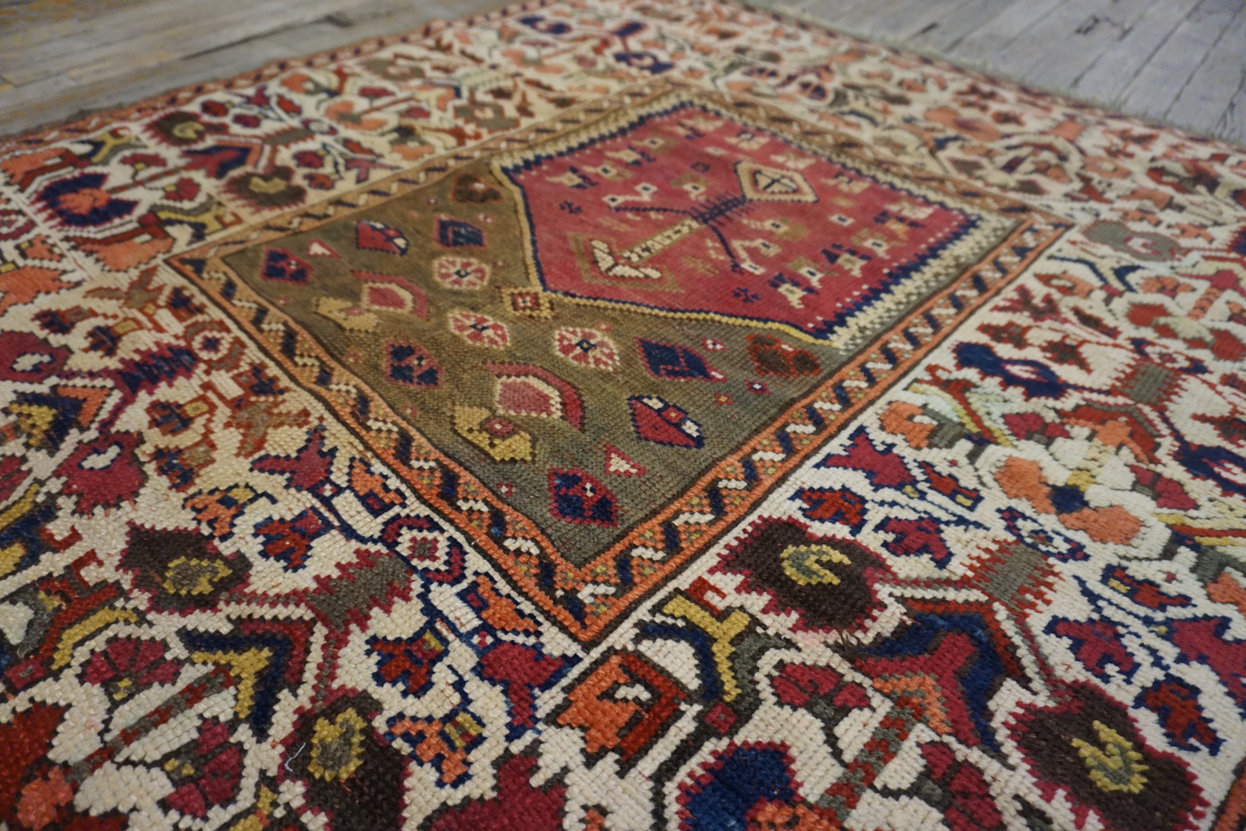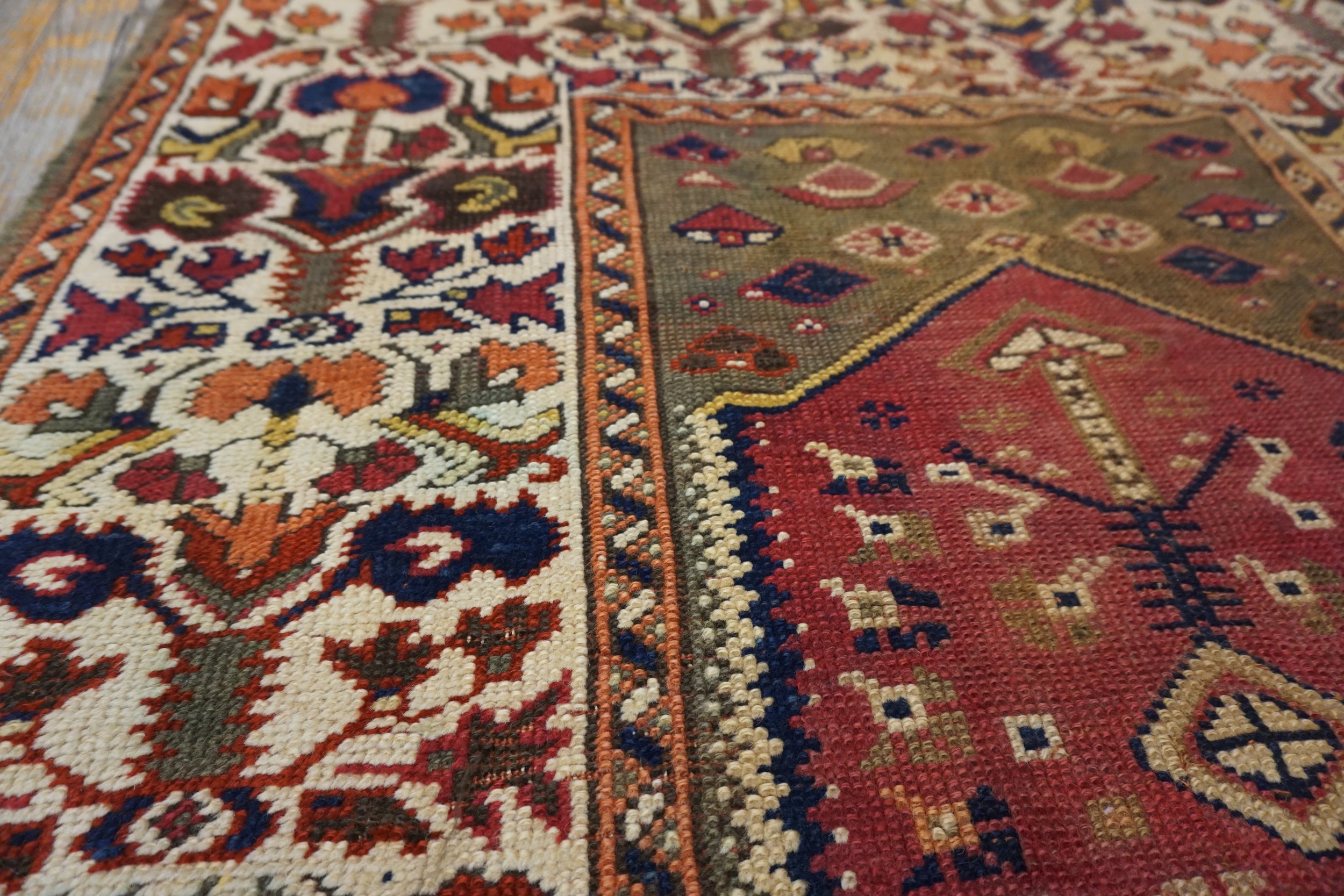 The palette is rich and saturated, utilizing natural dyes that have mellowed beautifully over time. Deep cochineal reds and striking indigo accents contrast sharply against the ivory ground. The overall effect is one of warmth and antiquity, subtly enhanced by the aged, earthy tones that lean toward green color rugs in certain light, reflecting the rug’s significant age and provenance.