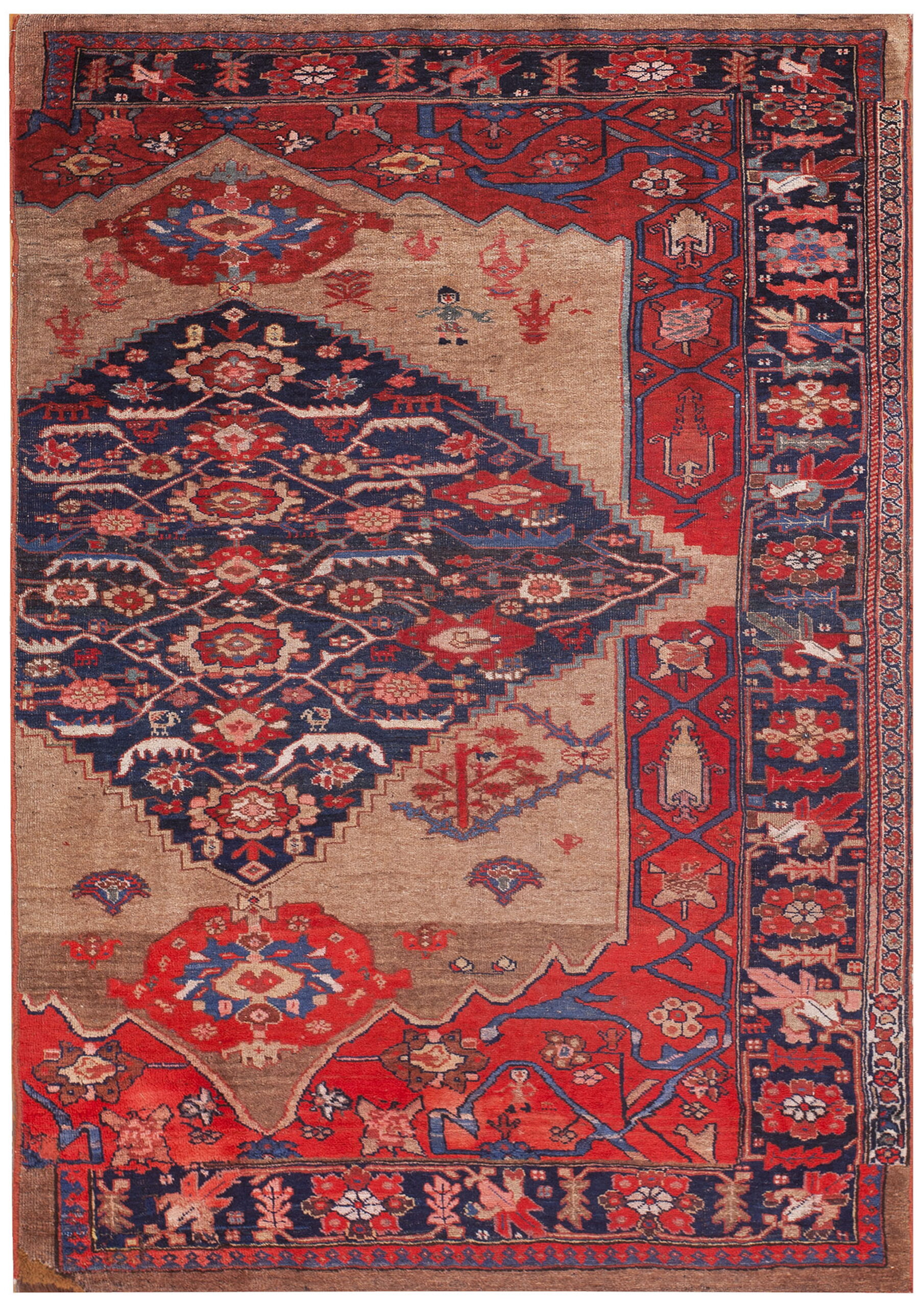 The design features a bold, stepped medallion format, heavily influenced by tribal aesthetics. While incorporating traditional floral elements within the structure, the overall impact is defined by strong, angular lines and pronounced serrations, placing it firmly within the category of geometric rugs. Subtle human and animal figures are integrated into the field, adding a unique, personal narrative quality often found in Bidjar weavings.