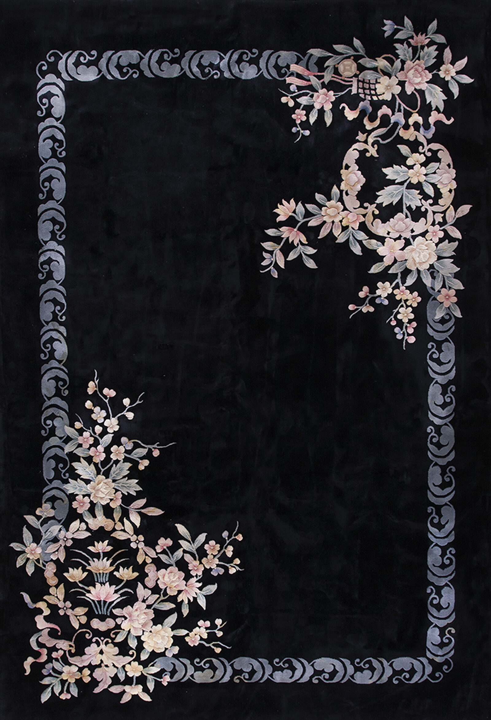 Adorning the corners are elegant sprays of blossoms—peonies and cherry branches—rendered in soft, muted tones of blush, cream, and pale sage. These asymmetrical arrangements, typical of Chinese Art Deco design, provide a stunning counterpoint to the streamlined, scrolling border executed in cool silver-gray. Such pieces exemplify the finest examples of floral rugs from the early 20th century.