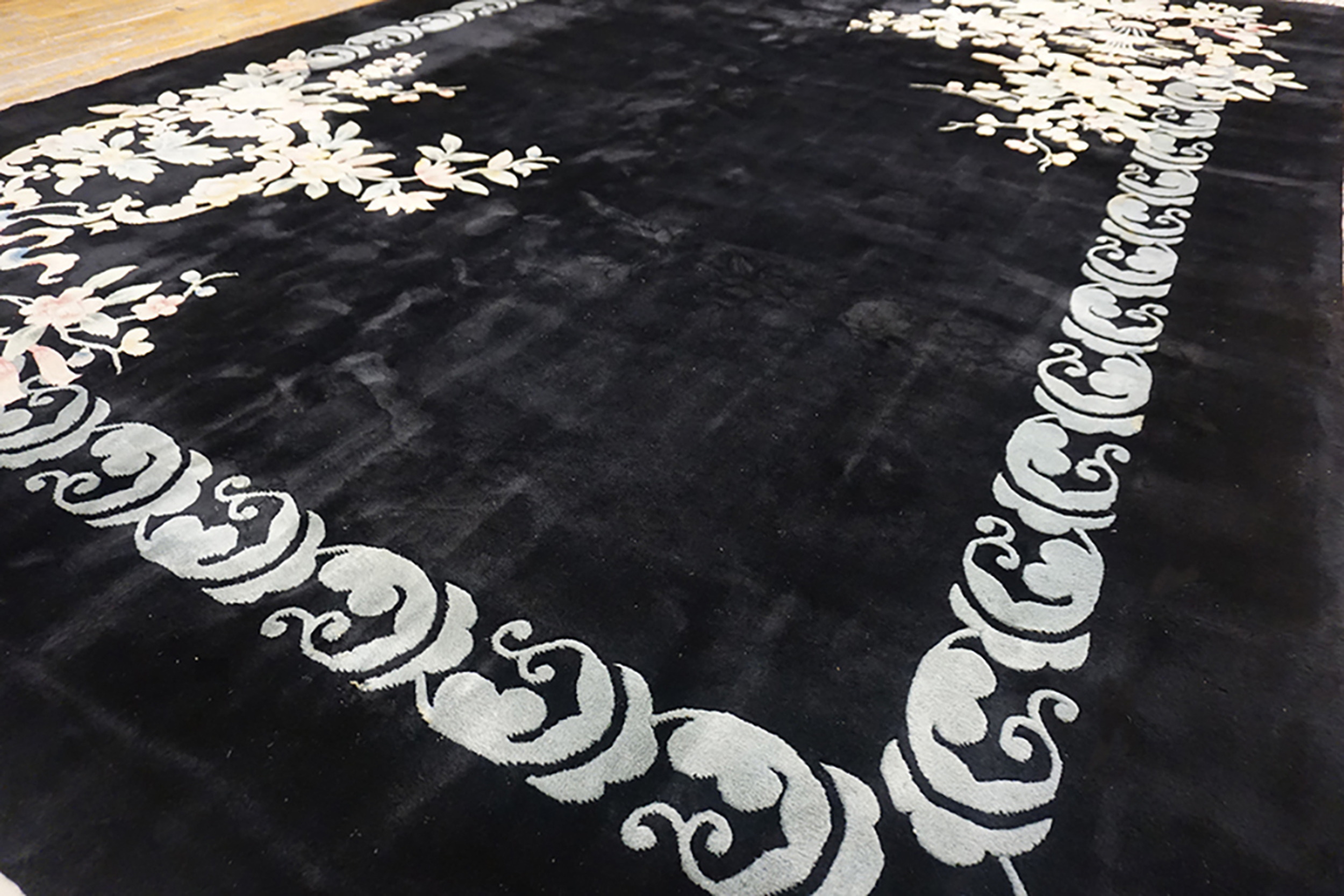 Antique Chinese – Art Deco Black 1935 Rug, Circa Date: 1935. This exceptional piece captures the height of the Art Deco movement as interpreted by master weavers in China. The dramatic contrast between the deep, saturated field and the delicate ornamentation defines its sophisticated appeal, making it a highly desirable example among antique rugs.