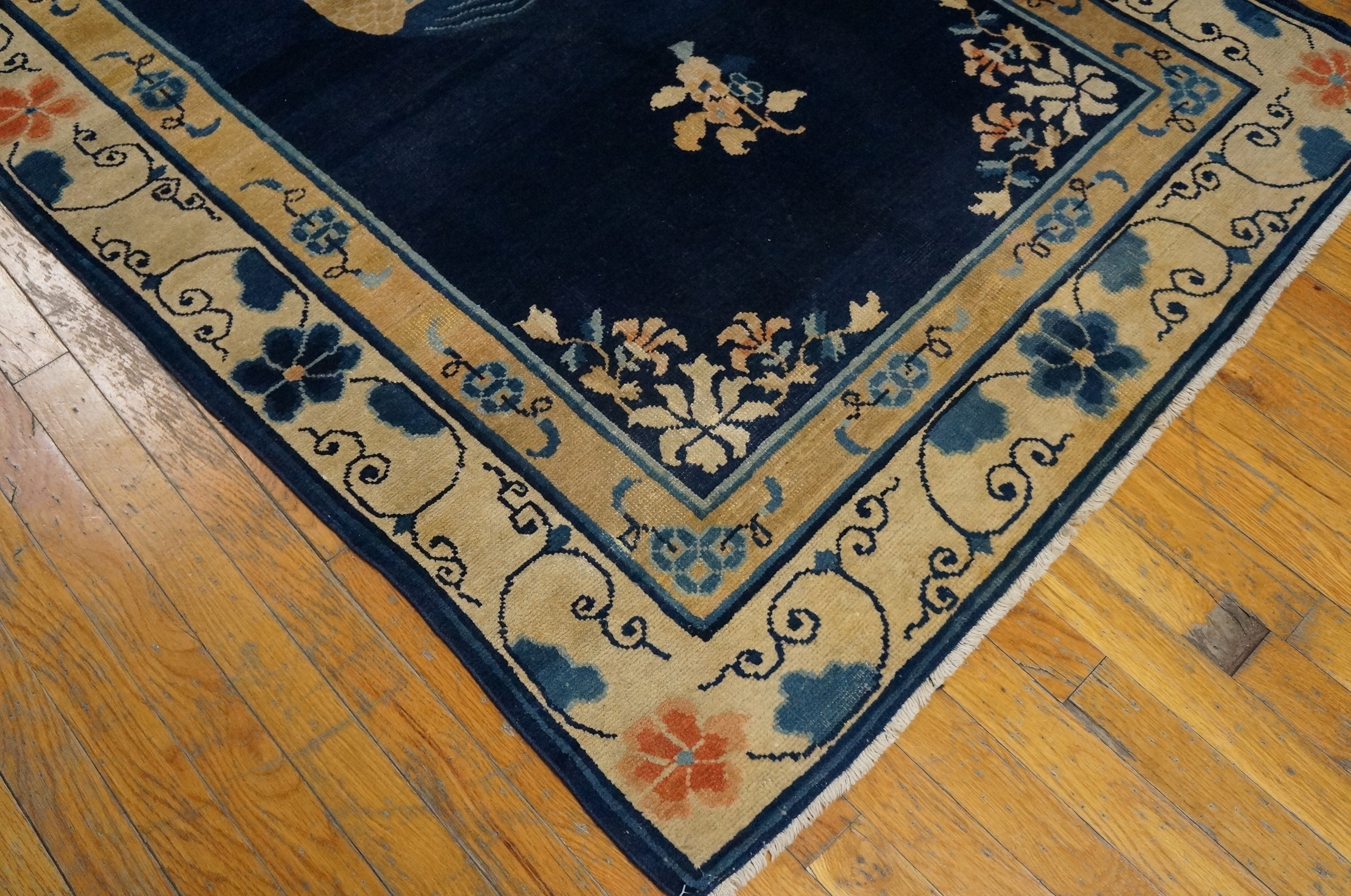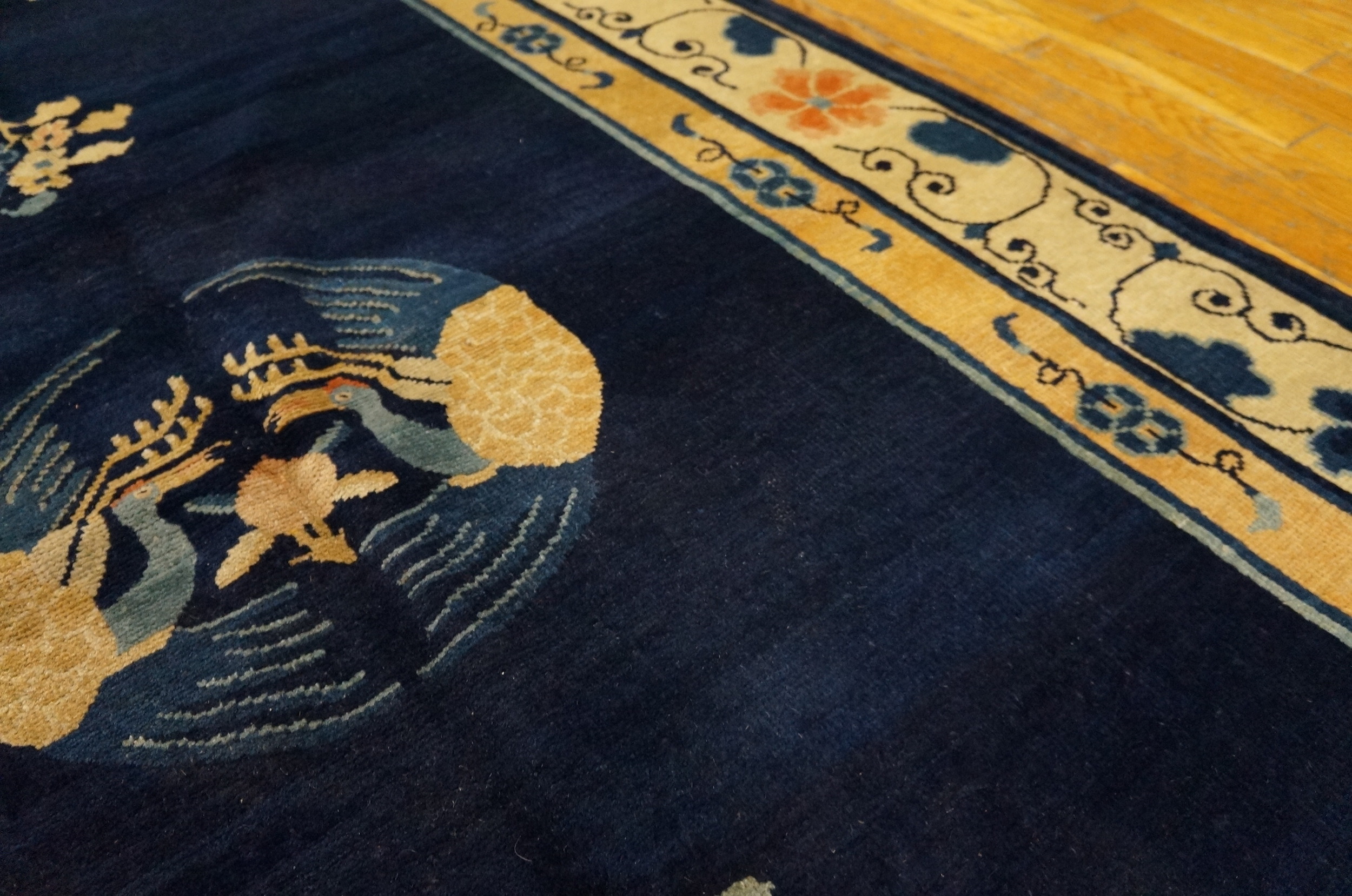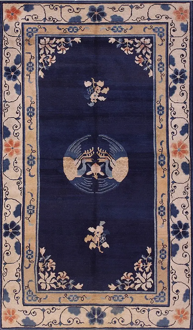 Antique Chinese – Peking Small Wool Blue Rug, Country of Origin: China, Circa Date: 1920s. This exquisite piece exemplifies the refined aesthetic of peking rugs produced during the early Republican era. The deep, saturated indigo field is characteristic of the finest Chinese rugs from this period, offering a striking contrast to the pale camel border, which frames the composition with elegance and restraint.