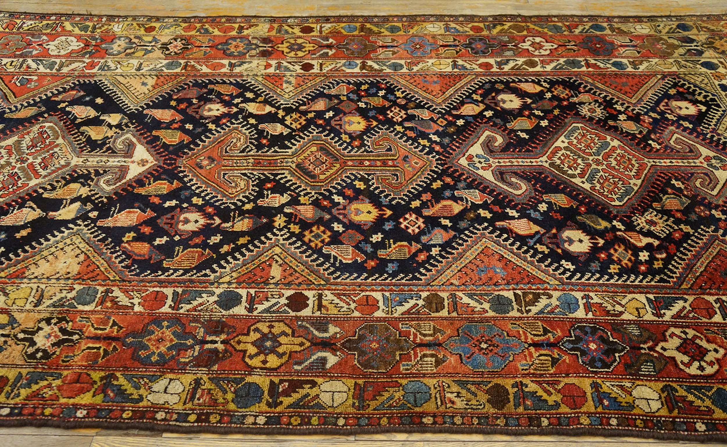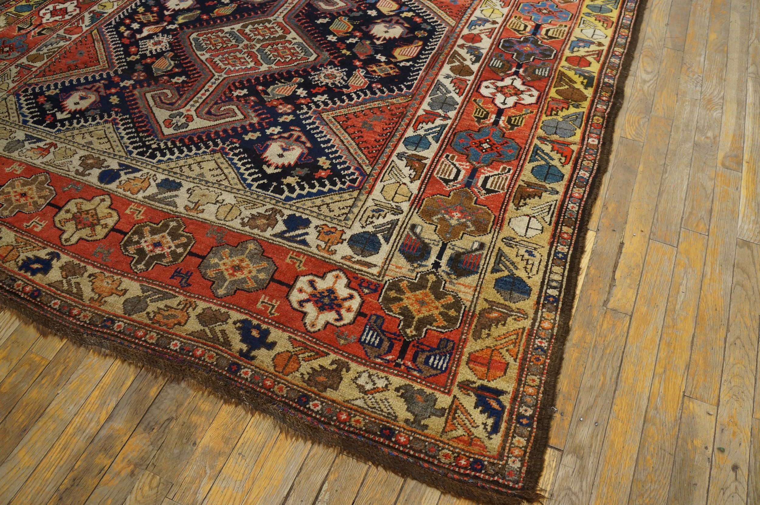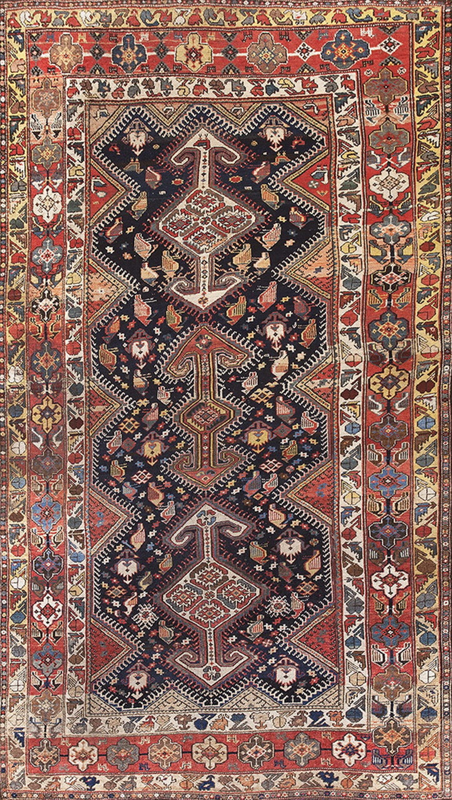 The expansive central field is defined by a deep, saturated indigo, creating a dramatic contrast against the vibrant secondary colors. This masterful use of the blue color palette allows the intricate, stylized bird and animal forms within the lozenge structure to visually lift from the background, showcasing the weaver’s symbolic language.