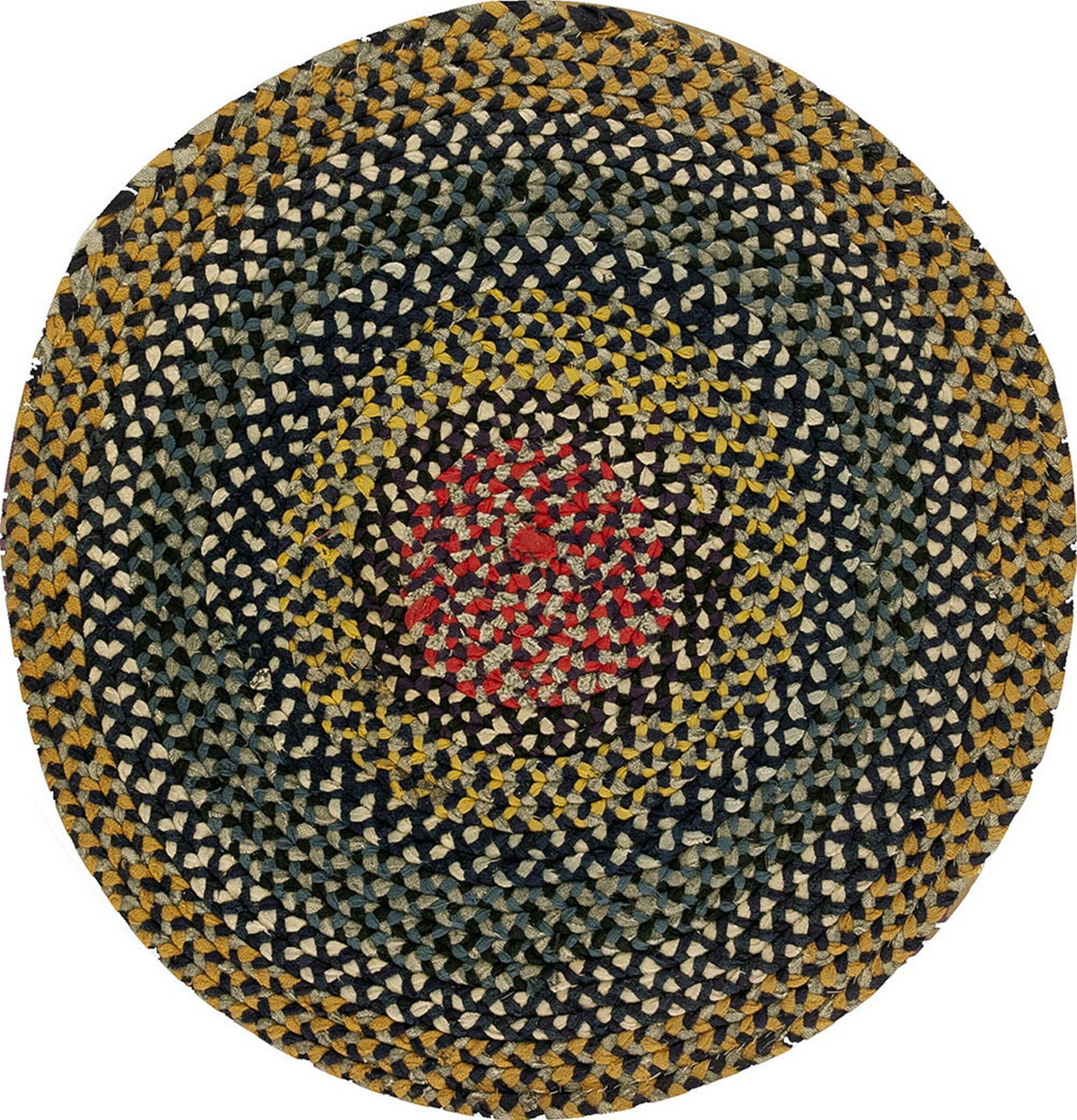 The construction technique, whether truly knotted or utilizing a braided structure to achieve this dense, circular form, results in a robust, highly textured surface. The allover design lacks a traditional border, allowing the concentric rings of color to flow seamlessly outward, emphasizing the hand-made, organic quality of the piece.
