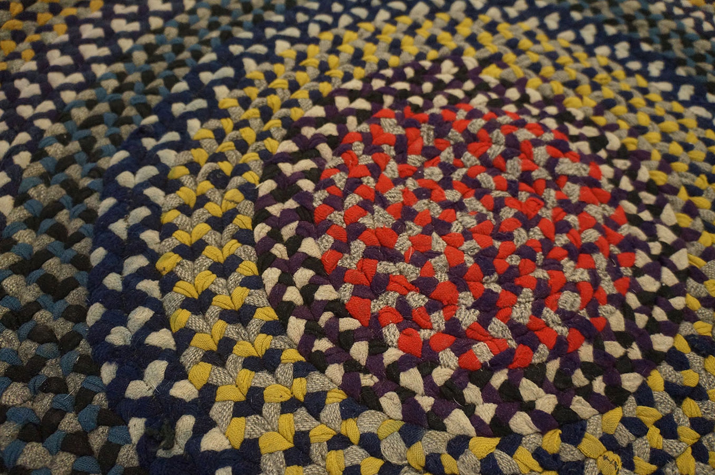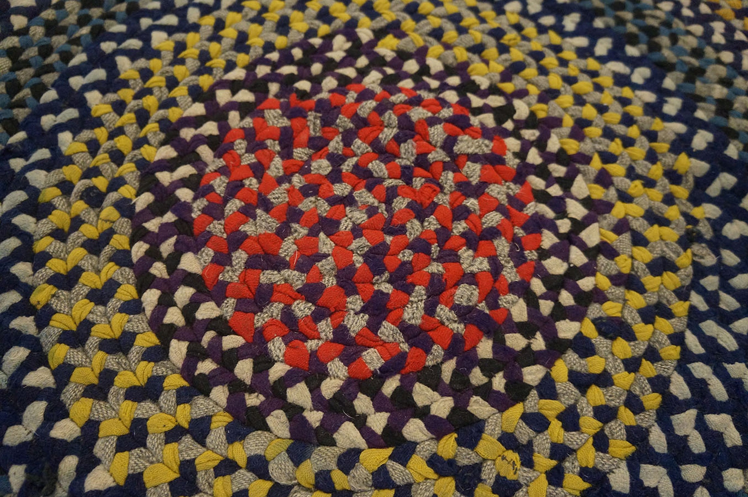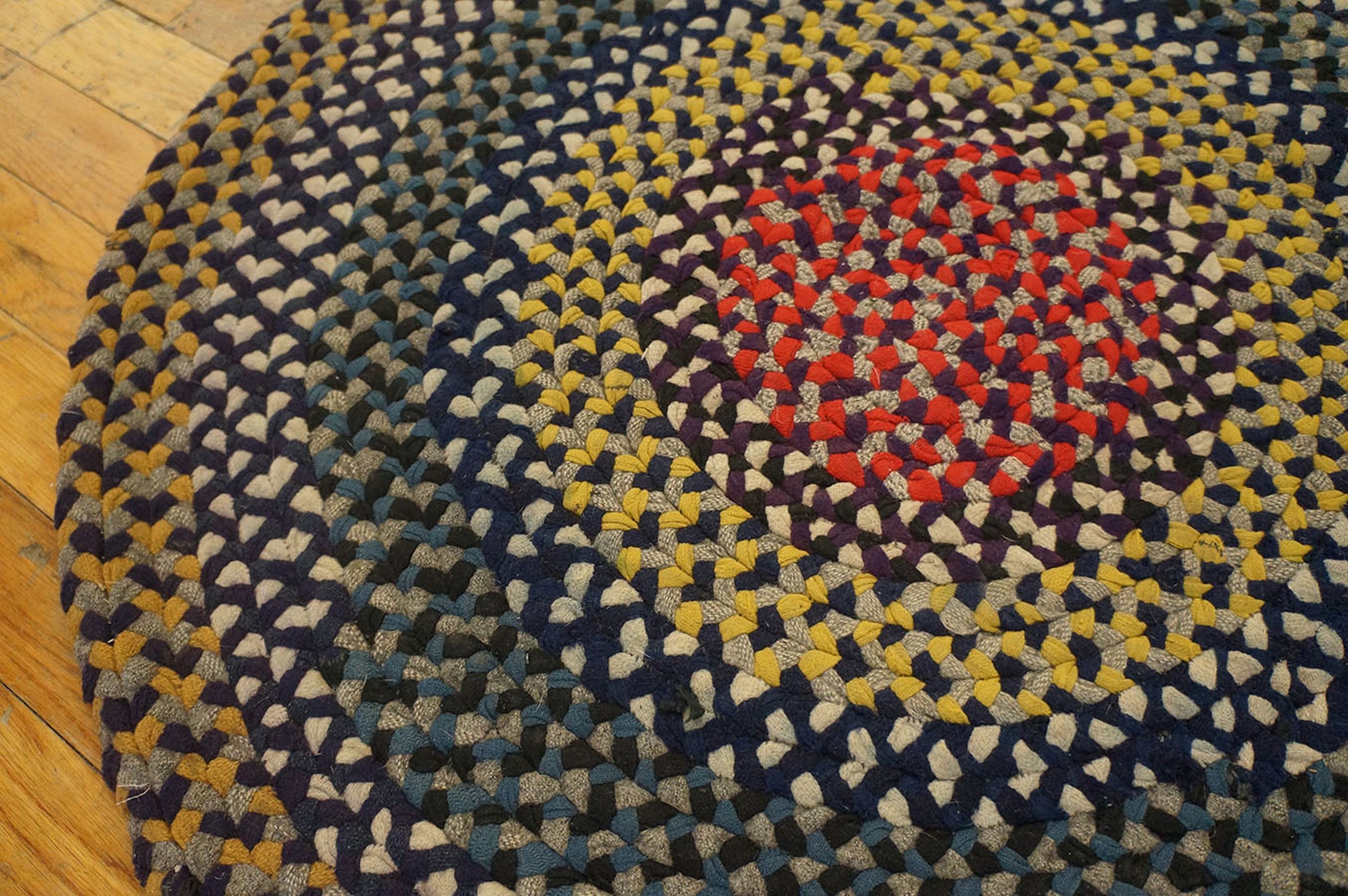Antique Braided American Allover Knotted Rug, Circa Date: 1900s. This compelling circular piece represents a distinct tradition of American textile craft. Created from tightly woven or braided fabric strips, this rug exhibits the resourceful artistry characteristic of early 20th-century folk textiles. Such pieces offer a unique counterpoint to formal Oriental and European antique rugs.