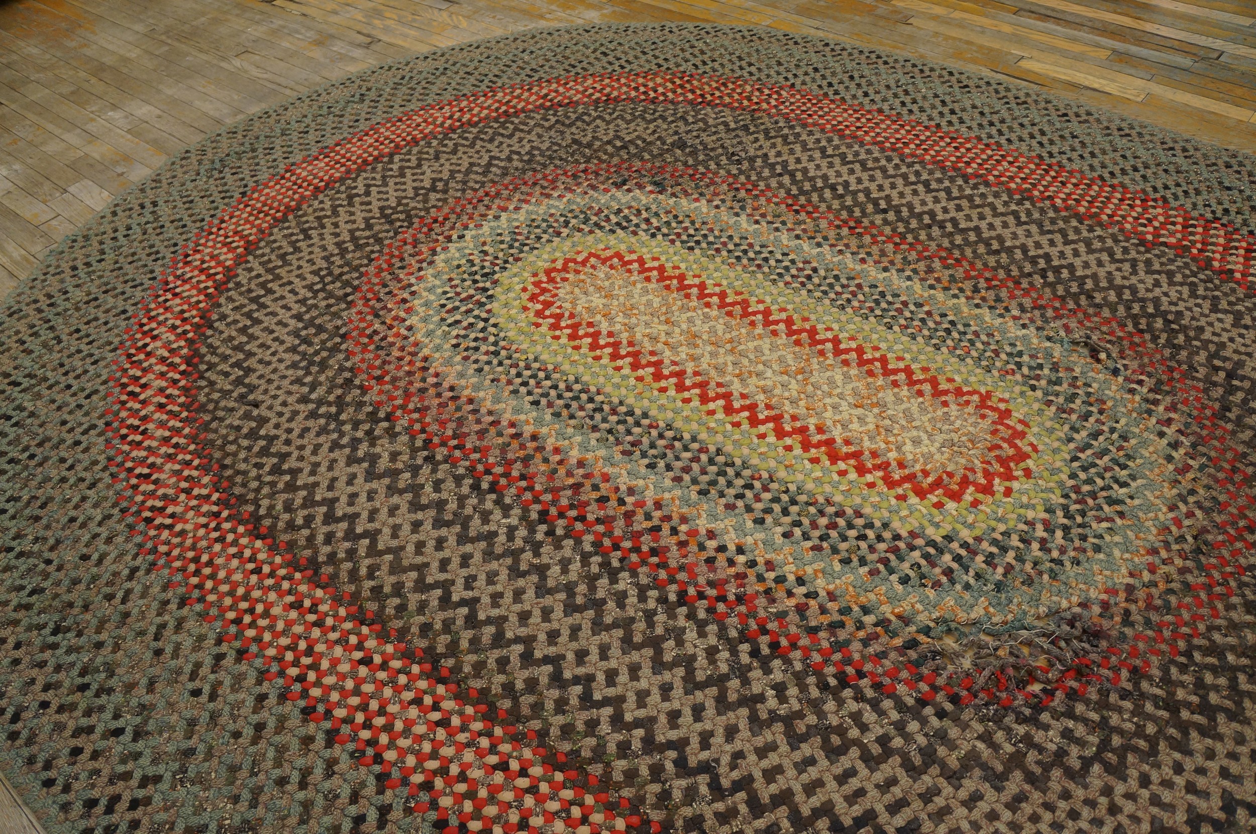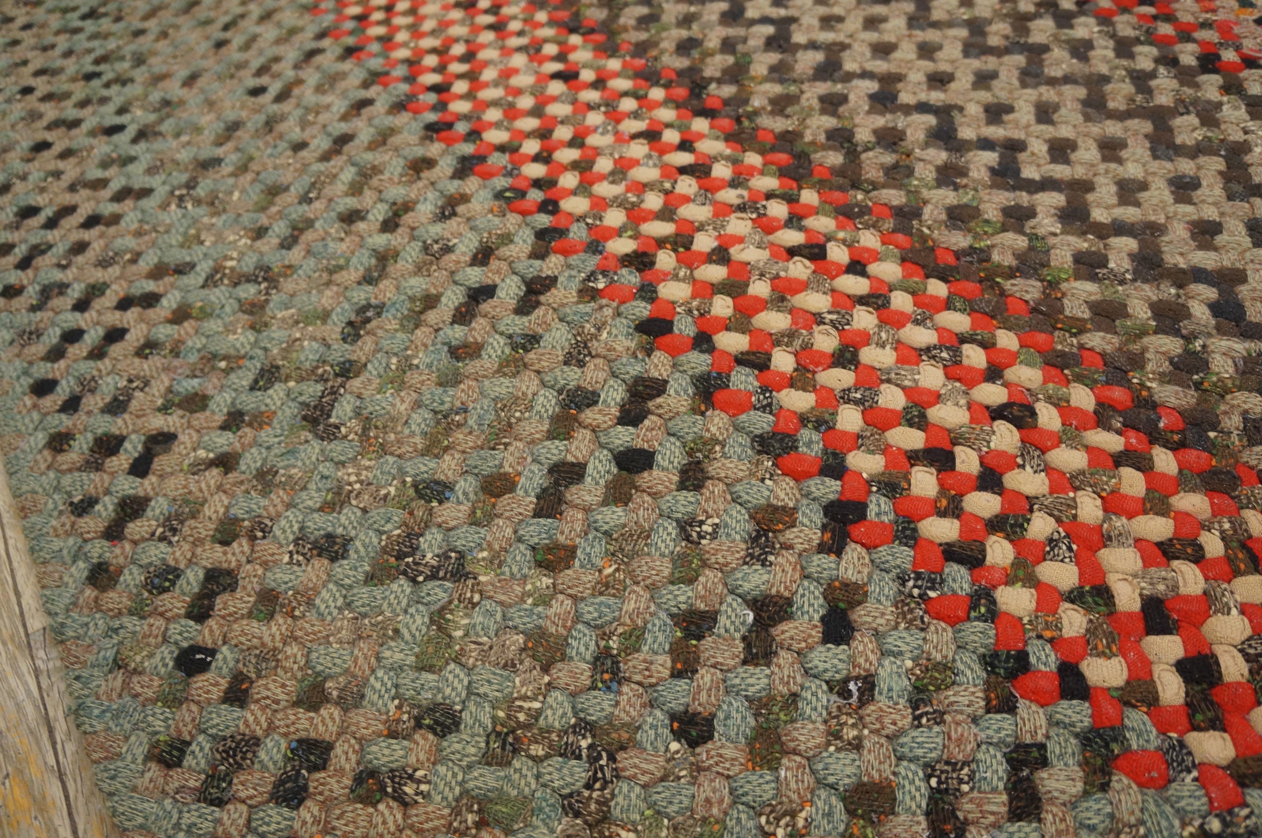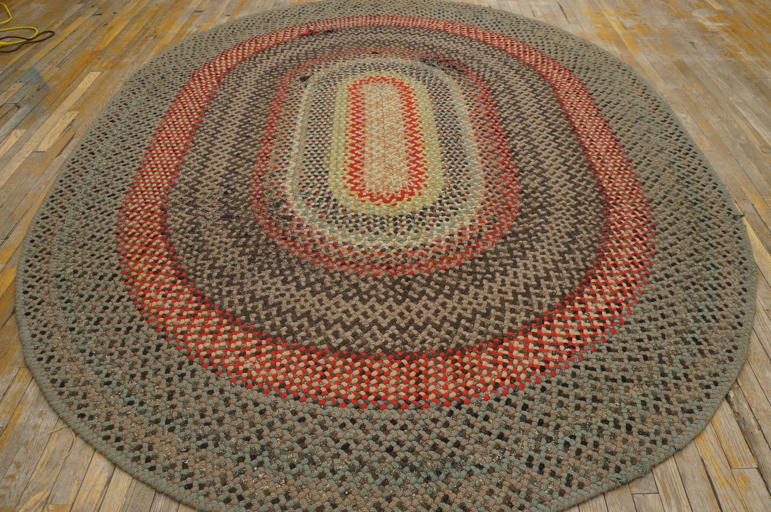 The meticulous, tight braided construction is evident in the concentric rings that define the pattern, creating a highly textural surface that is both visually engaging and exceptionally hard-wearing. Such pieces are highly sought after by collectors of authentic antique rugs who appreciate craftsmanship rooted in utility and regional tradition.