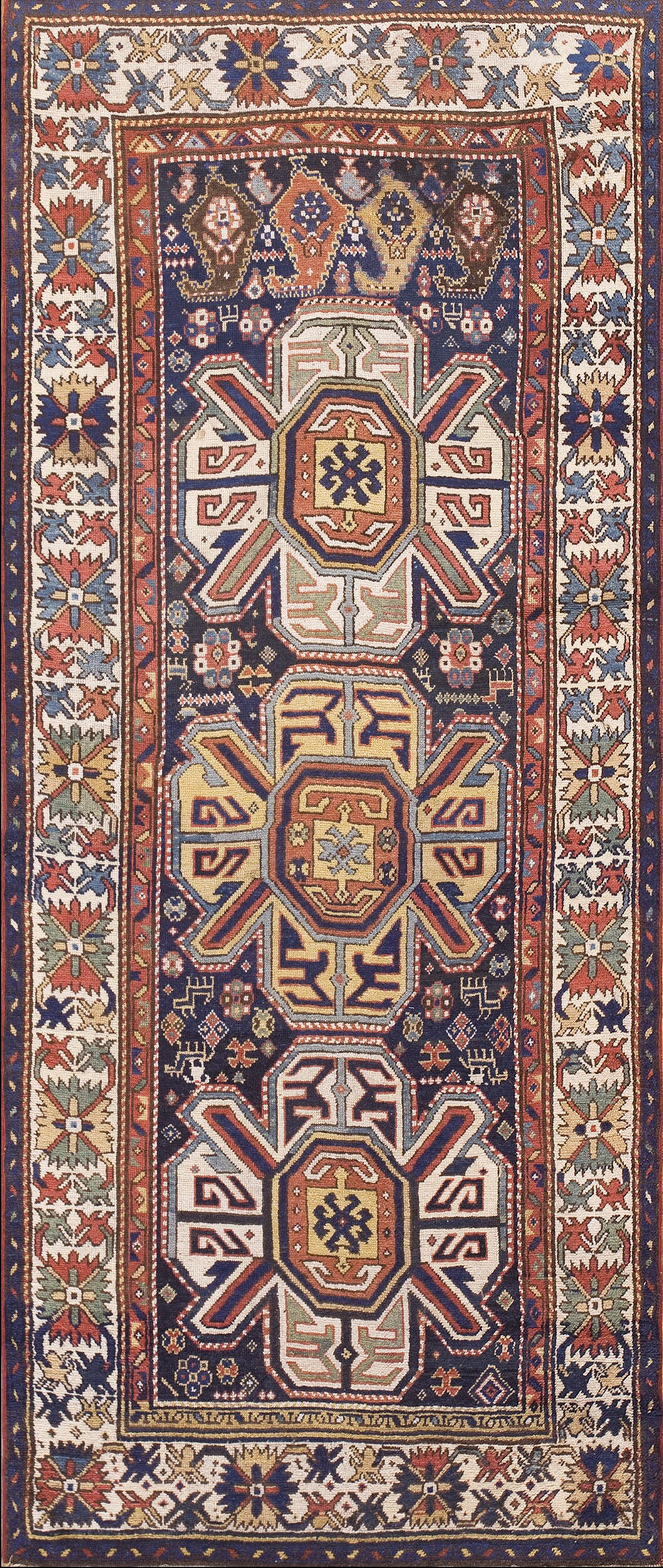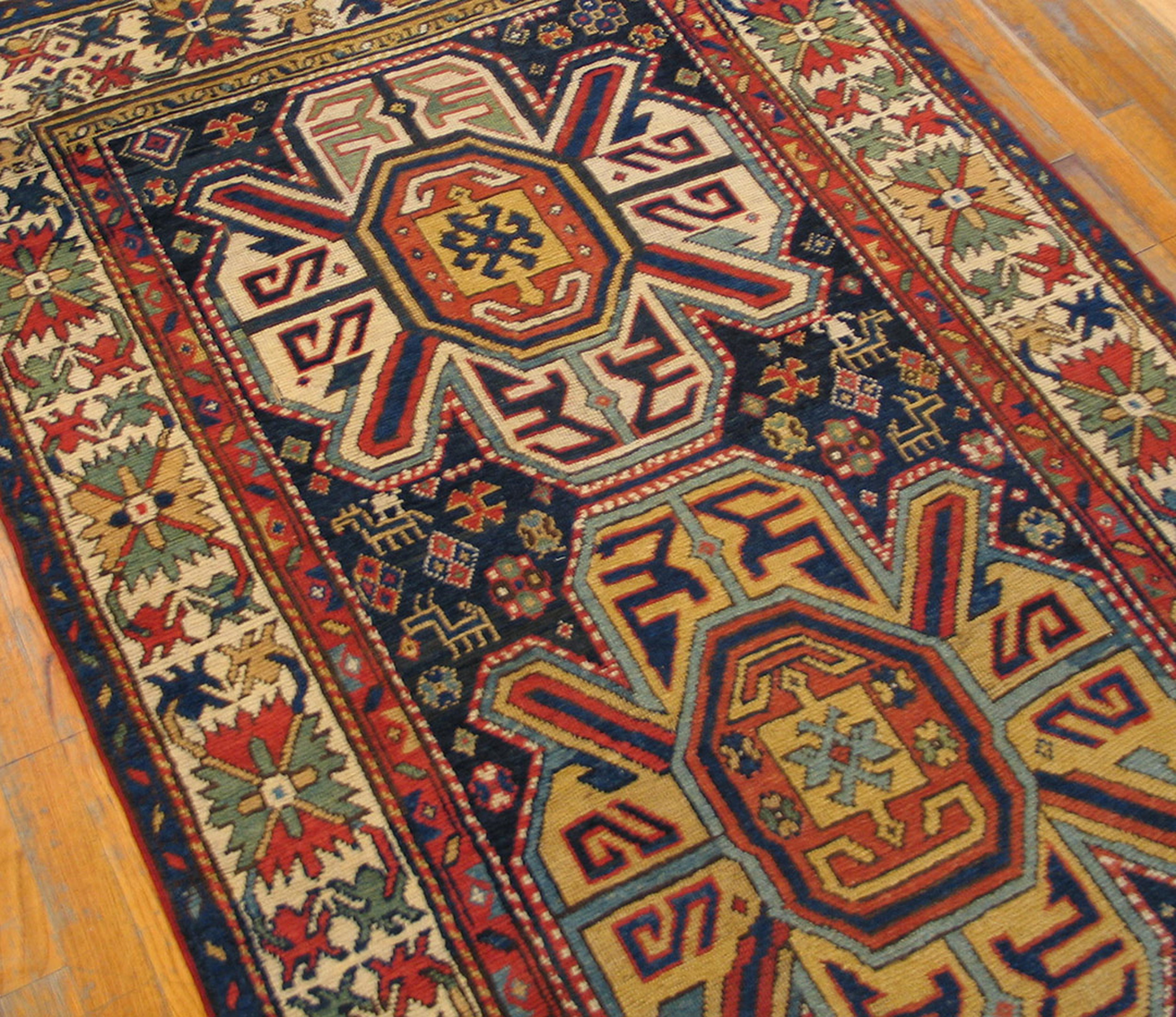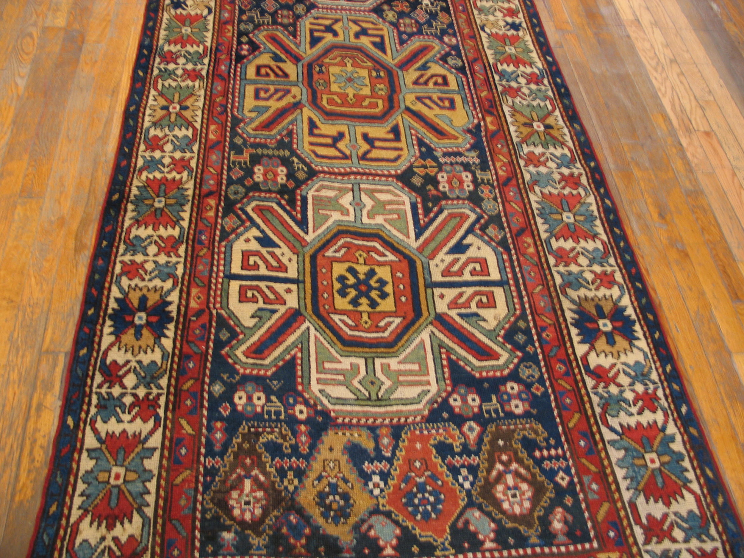 Hallway Runner Rugs (4.03ft x 9ft), Country of Origin: Caucasus, Circa Date: 1880s. This exceptional example of 19th-century weaving tradition originates from the Caucasian rugs region, known for its bold, tribal designs and robust construction. The dense wool pile and rich, saturated dyes attest to its age and enduring quality.