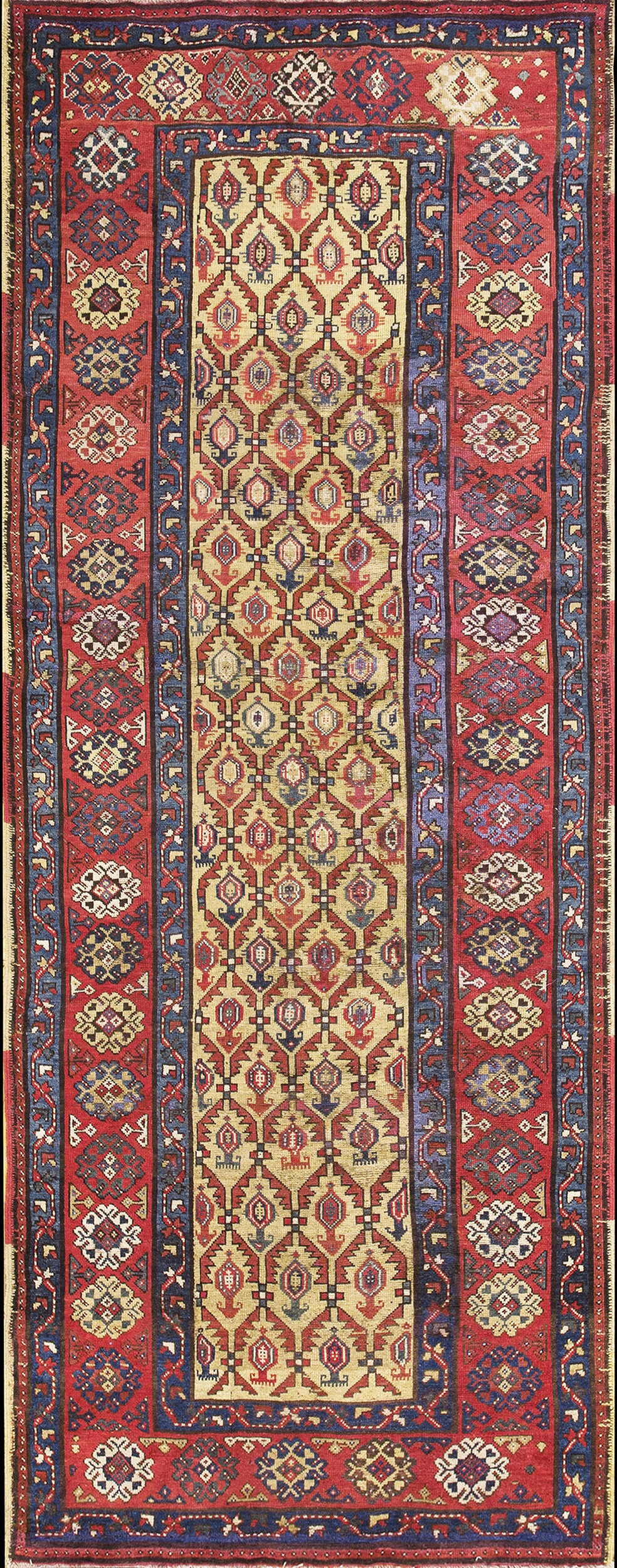The design structure is characteristic of karabagh production, featuring a repeating lattice of stylized geometric medallions within the central field. The precise, angular drawing and saturated color palette—dominated by deep reds and indigo—are classic hallmarks of Caucasian rugs, demonstrating a powerful command of traditional village motifs.
