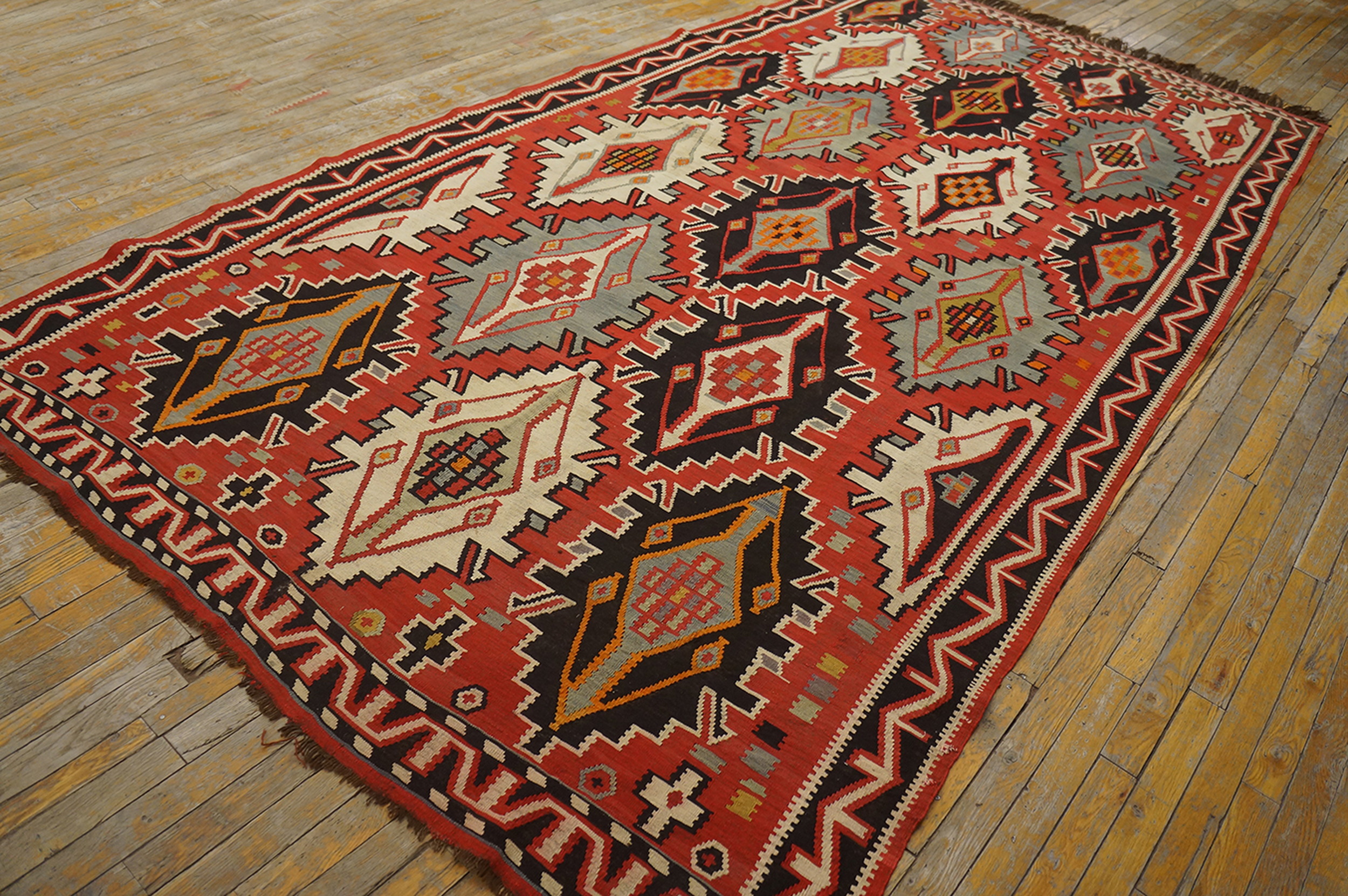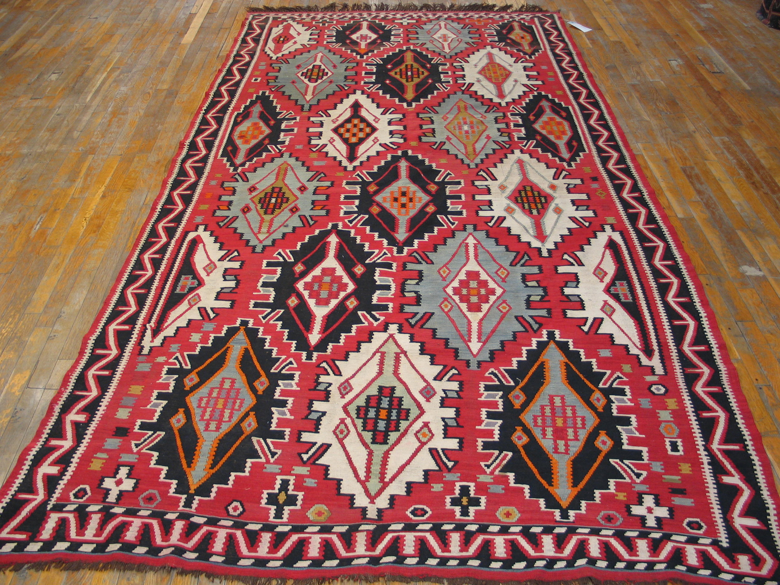 Antique Caucasian – Kilim Caucasian Knotted Rug, Circa Date: 1900s. This striking textile represents the pinnacle of early 20th-century tribal weaving, showcasing the raw, powerful aesthetic characteristic of antique rugs from the Caucasus region. The use of saturated, natural dyes gives the piece remarkable depth and permanence.