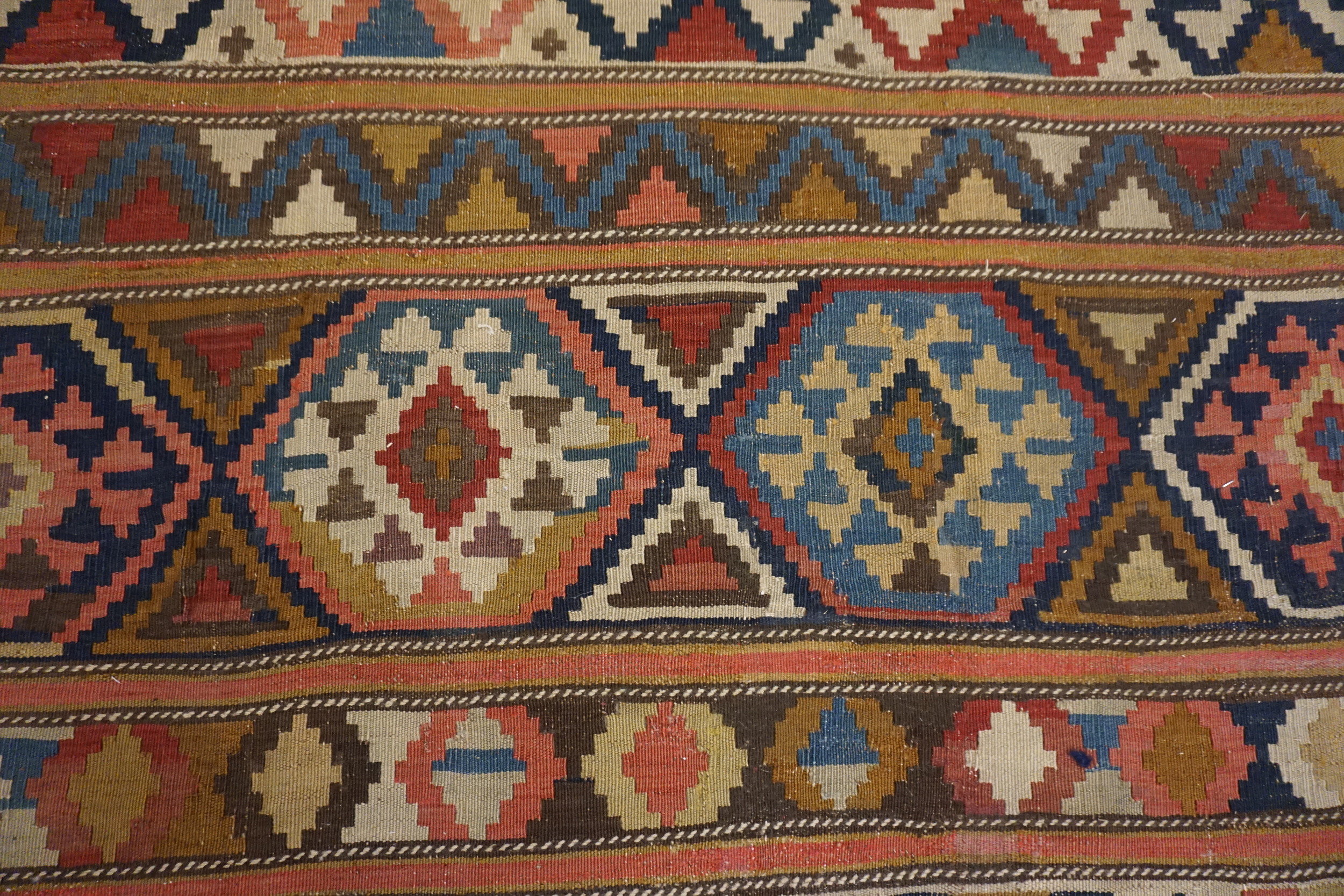 Antique Allover Geometric Wool Flat Weave Multicolor Jewel Tones 1920s Rug, Circa Date: 1920s. This exceptional flat-weave textile, likely a kilim, showcases the enduring artistry of nomadic and village weaving traditions. The wool construction and tight, horizontal banding of the design define it as a prime example of antique rugs from the early 20th century.
