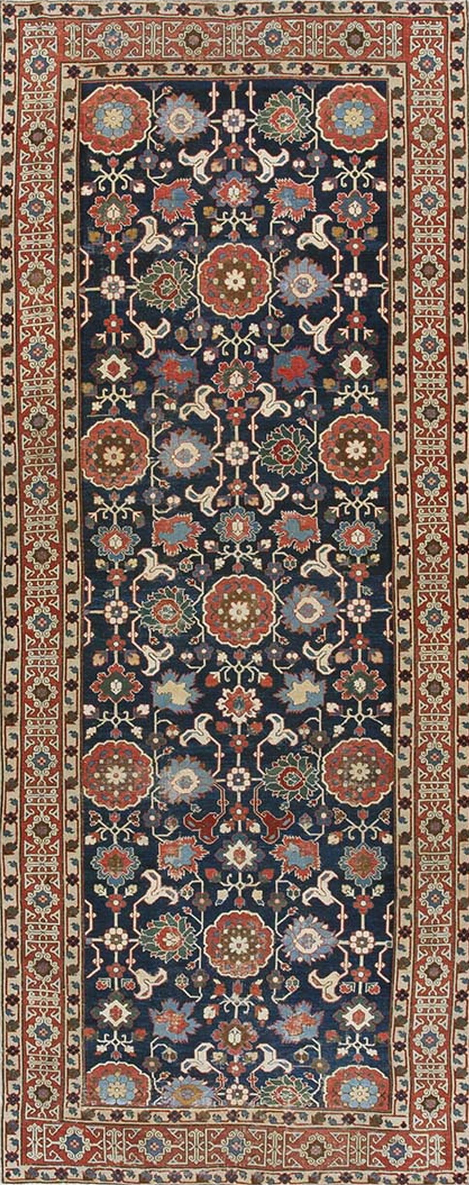 Antique Caucasian – Kuba Hallway Runner Wool Blue Rug, Country of Origin: Russia, Circa Date: 1825. This exceptional textile originates from the Kuba region of the Eastern Caucasus, reflecting the deep weaving traditions established in what is now modern-day Russia. Its remarkable preservation testifies to the quality of early 19th-century Caucasian wool production.