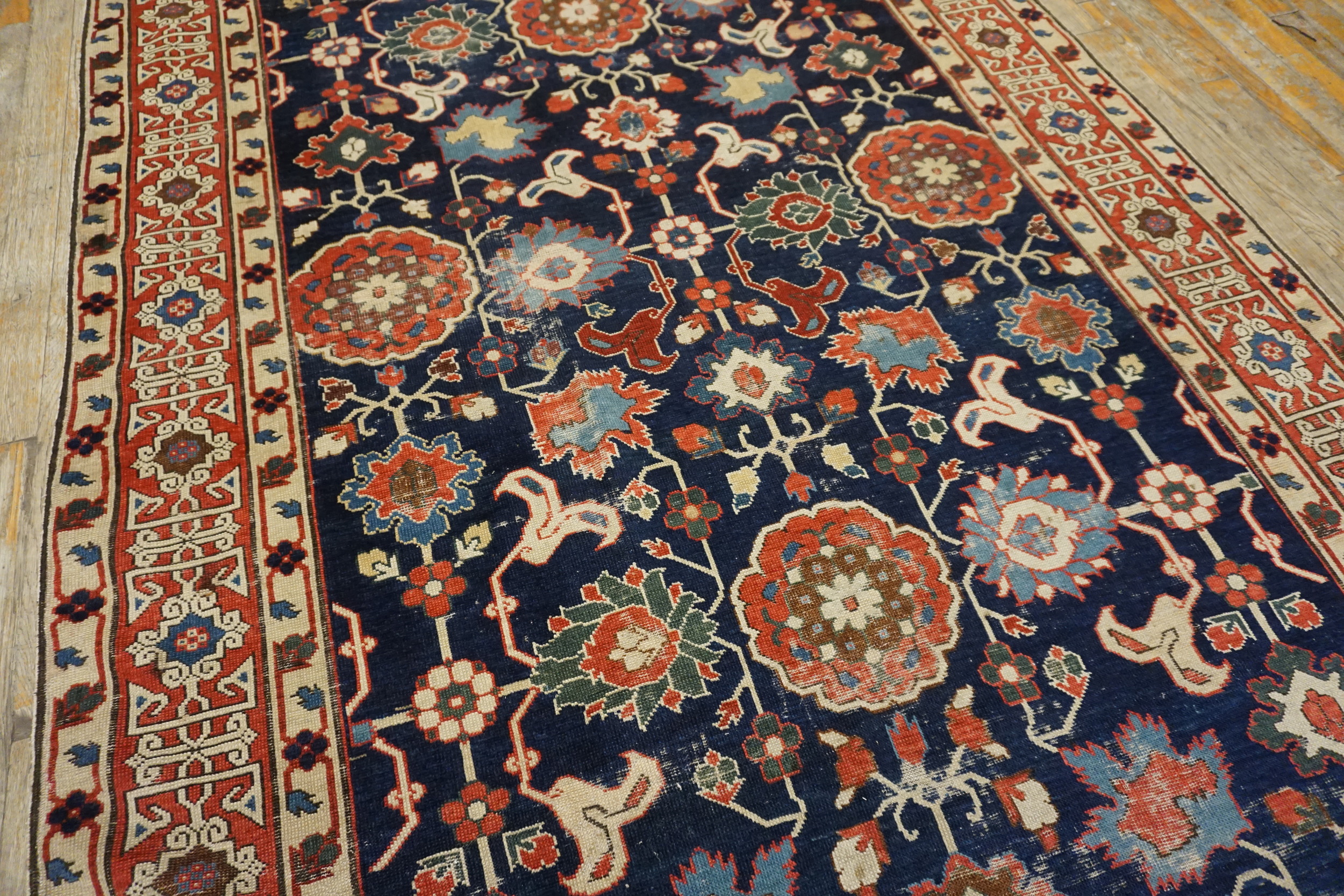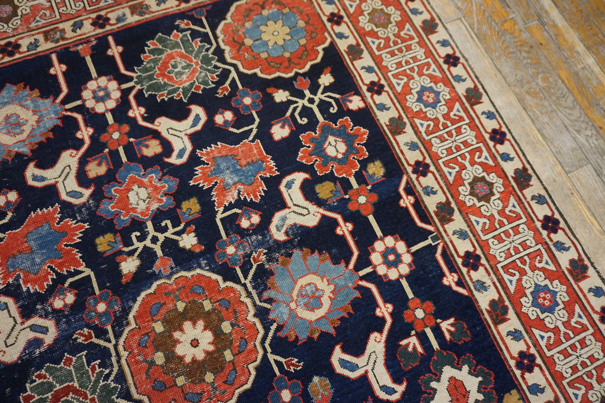 The design employs a dense, highly stylized allover pattern of stylized blossoms and geometric medallions, characteristic of the Kuba style. Unlike central medallion formats, the continuous flow of the field ensures visual interest across the entire length. As a genuine example of antique rugs, this piece showcases the technical mastery of Caucasian weavers from the early 19th century.