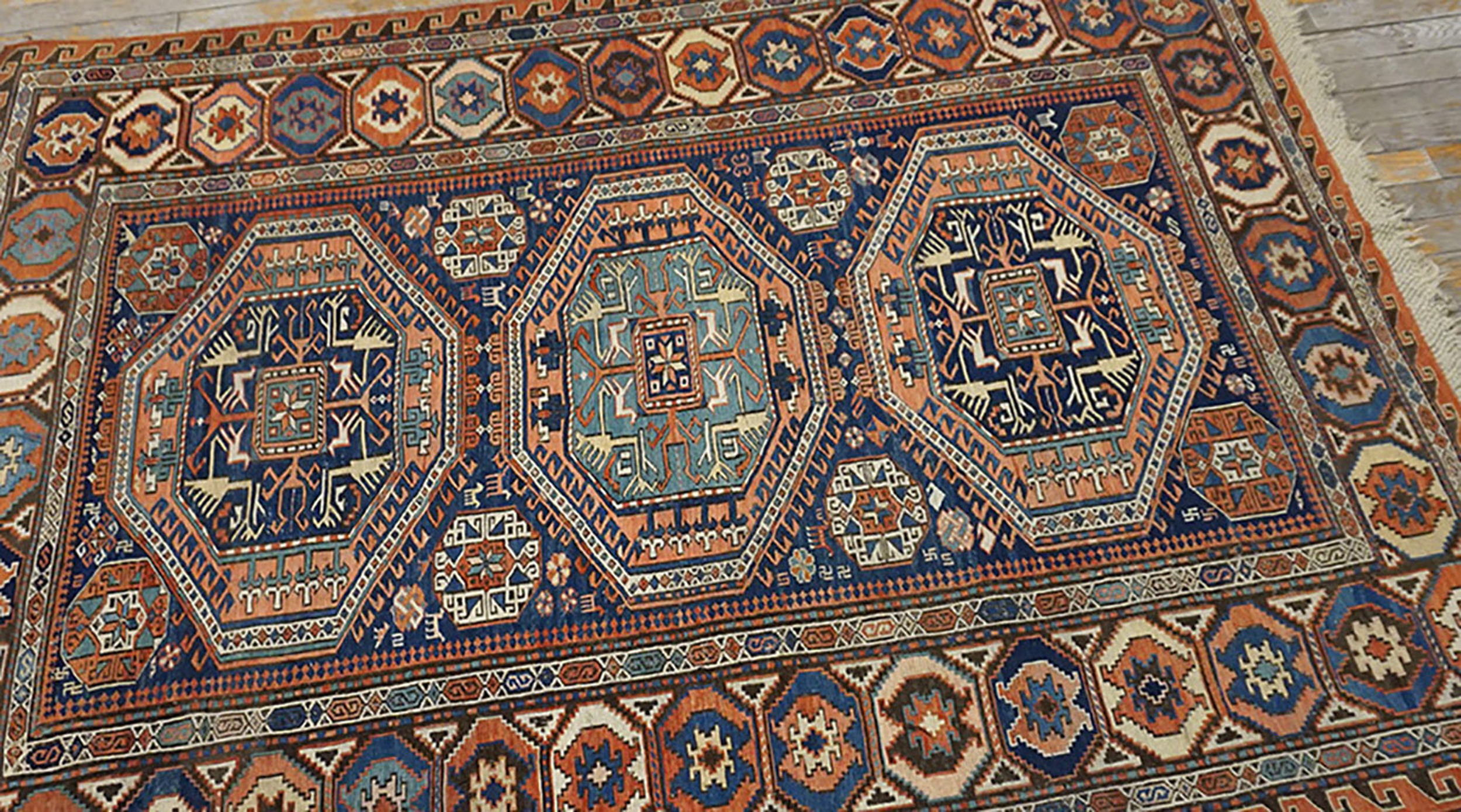Antique Caucasian – Sumak Flat Weave Rug, Circa Date: 1870s. This exceptional late 19th-century Sumak exemplifies the robust, highly detailed weaving tradition of the Caucasus region. The flat-weave structure, known for its durability and intricate reverse side, showcases a powerful central design aesthetic typical of antique rugs from this era.