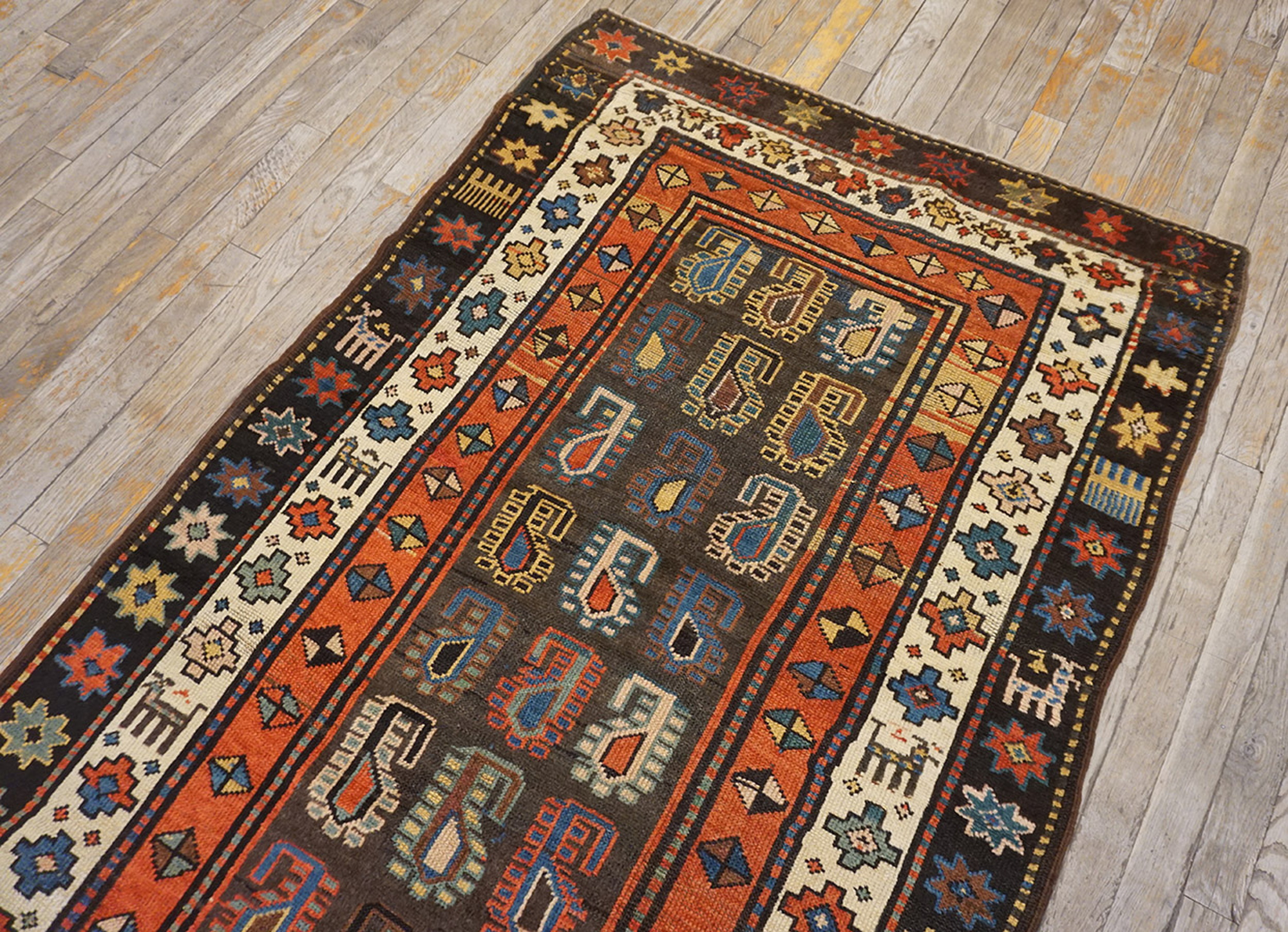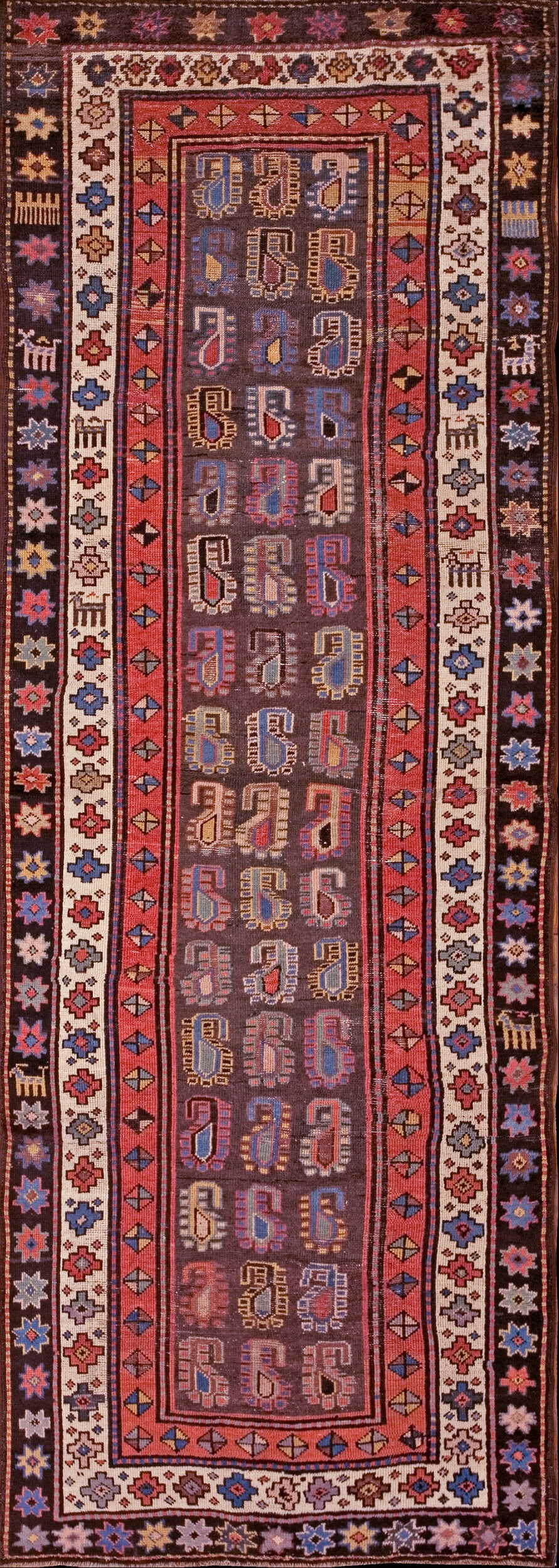 Antique Caucasian Knotted Rug, Country of Origin: Russia, Circa Date: 1900s. This exceptional piece represents the finest weaving traditions of the Moghan region, a key area within Russia known for its distinctive tribal iconography and robust construction. Its narrow, elongated format speaks to its original function as a passage covering, embodying the nomadic artistry of the Caucasus.