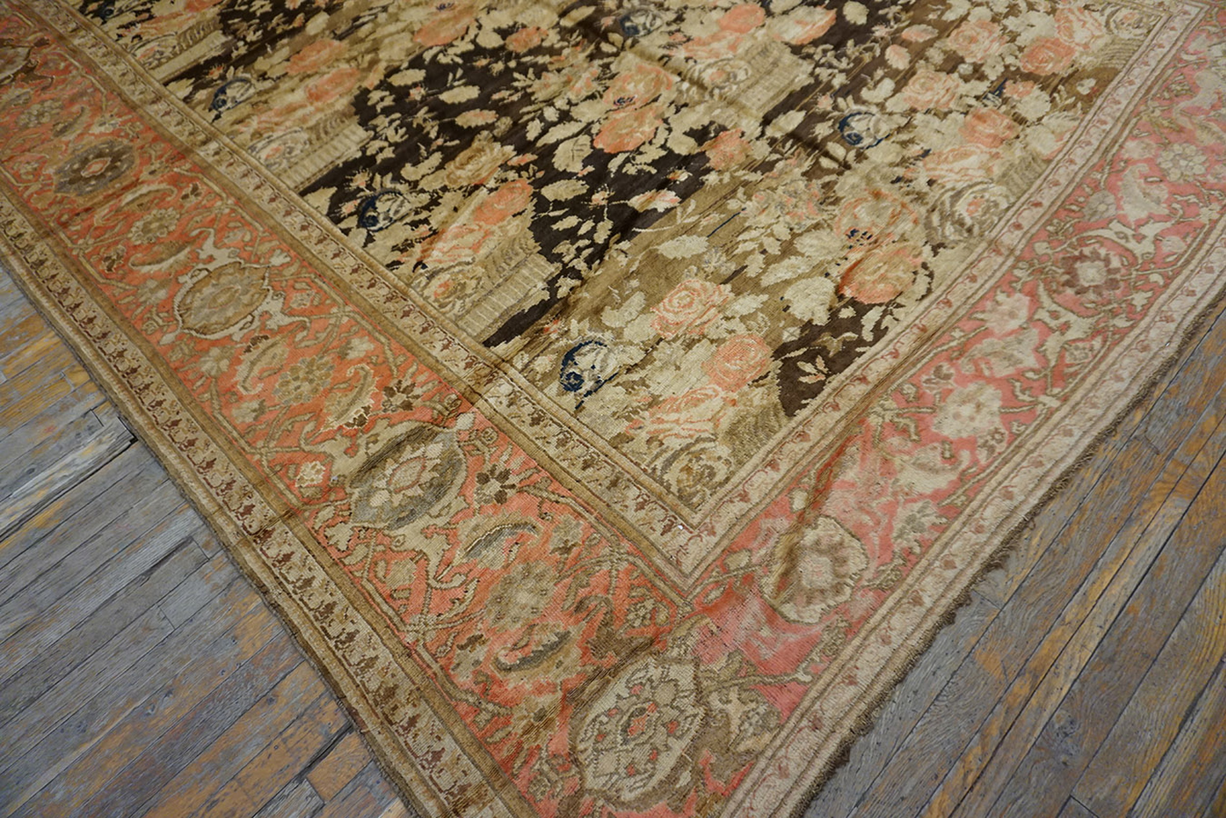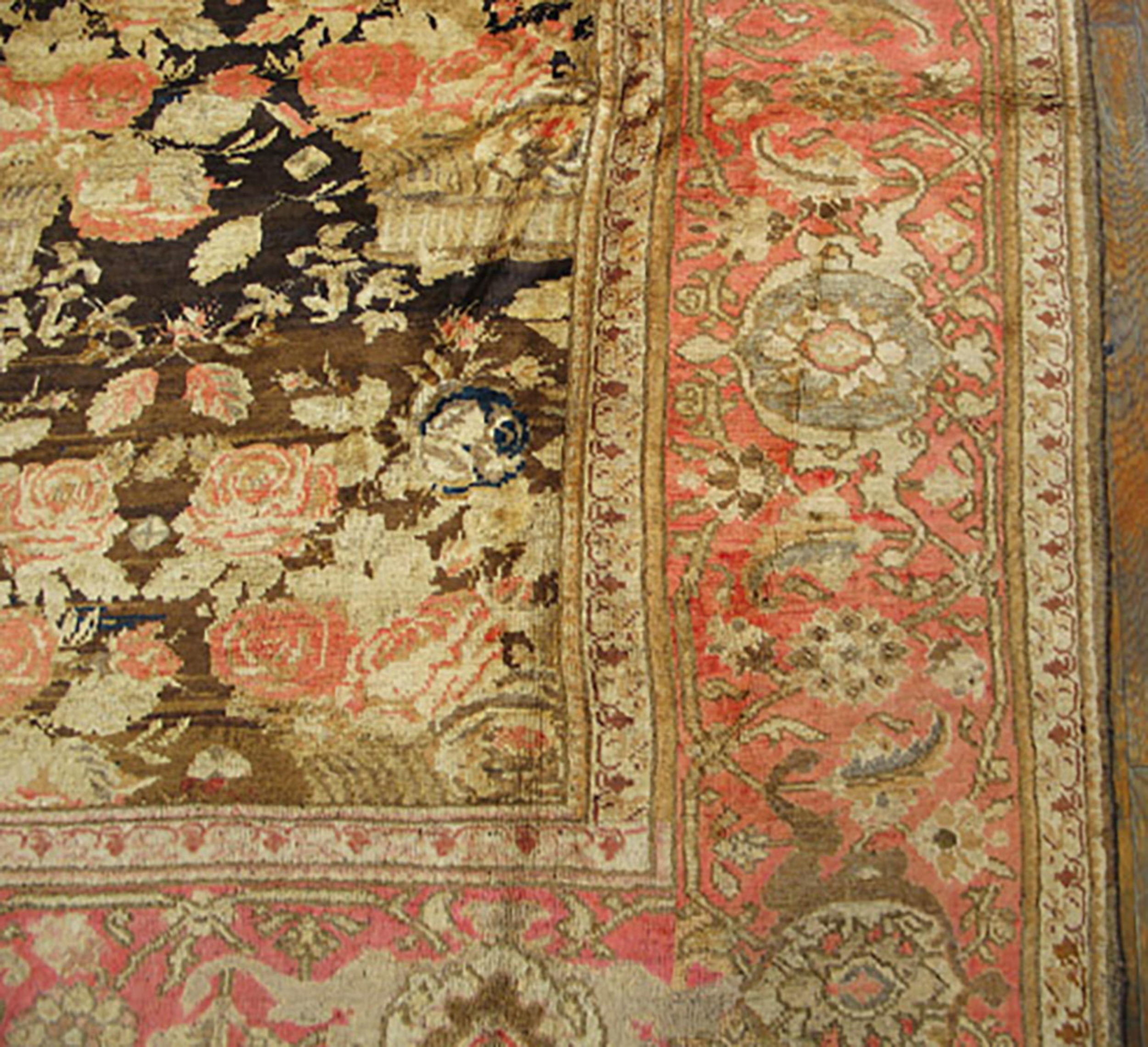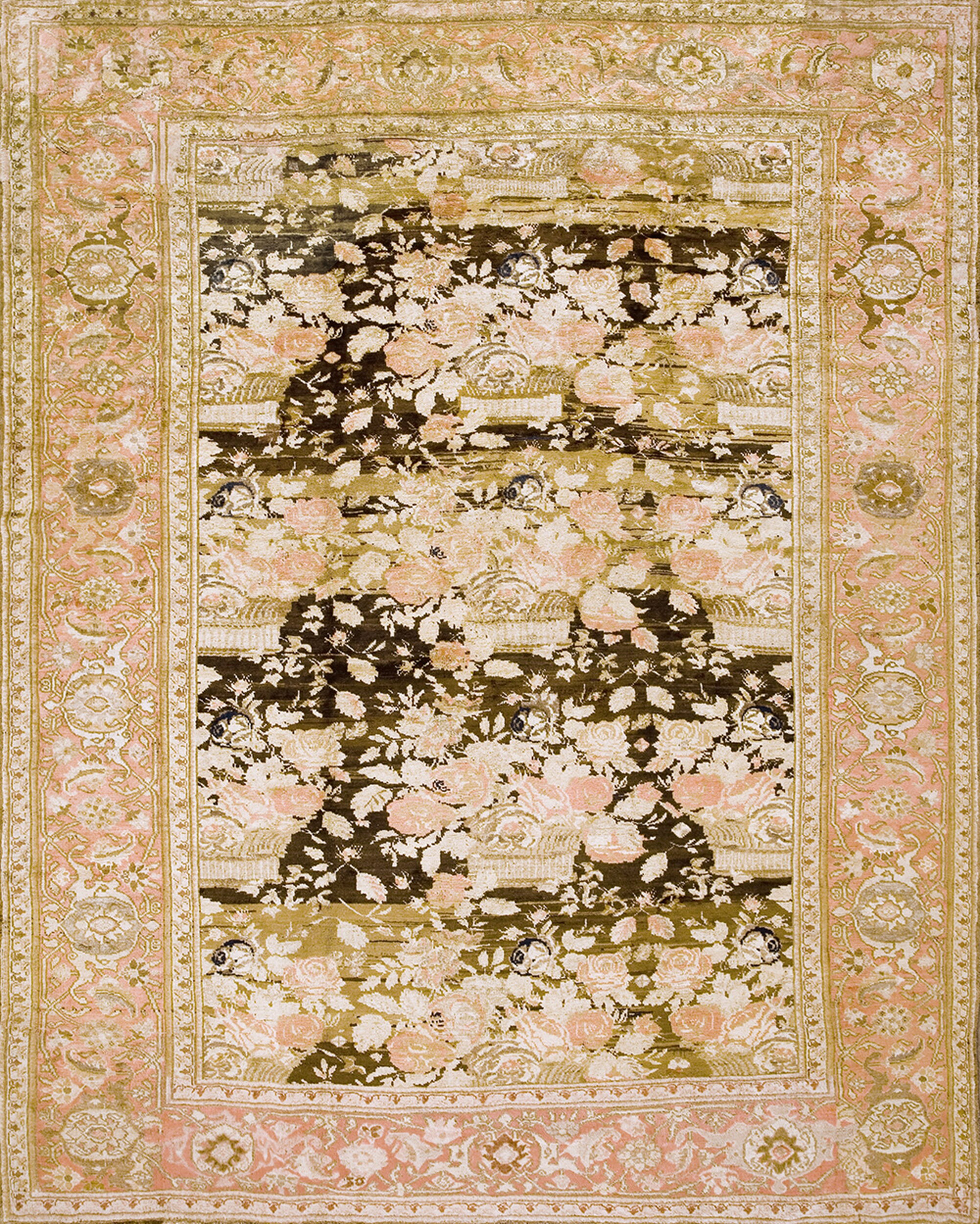 The deeply saturated field, characterized by a rich, variegated brown earth tone color rugs palette, provides a dramatic canvas for the highly naturalistic floral arrangements. These bouquets, rendered in soft creams and delicate blush pinks, appear to float against the darker ground, creating a striking visual depth characteristic of late 19th and early 20th-century weaving.