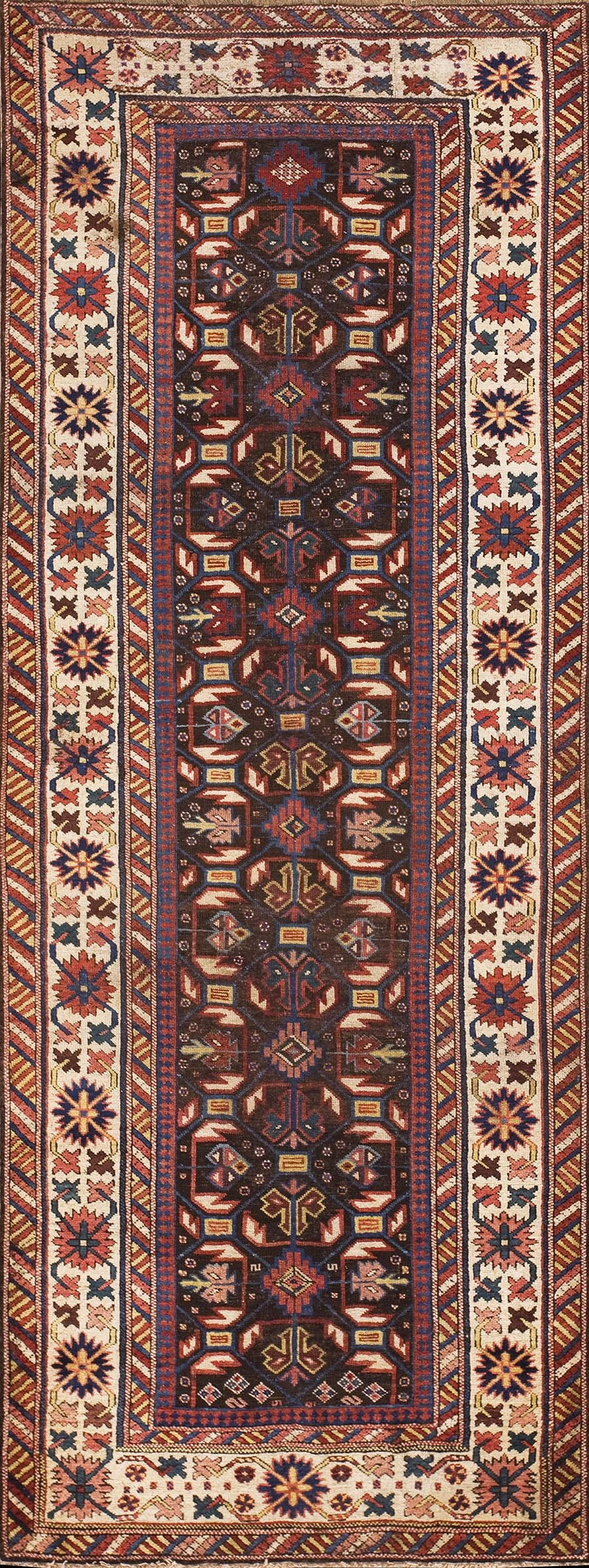 A striking ivory main border, featuring repeating stylized floral elements, provides essential contrast to the dark field, framing the central design with clarity and light. This highly collectible item represents a significant piece of textile history, offering collectors an authentic example of the finest antique rugs from the Caucasus region.