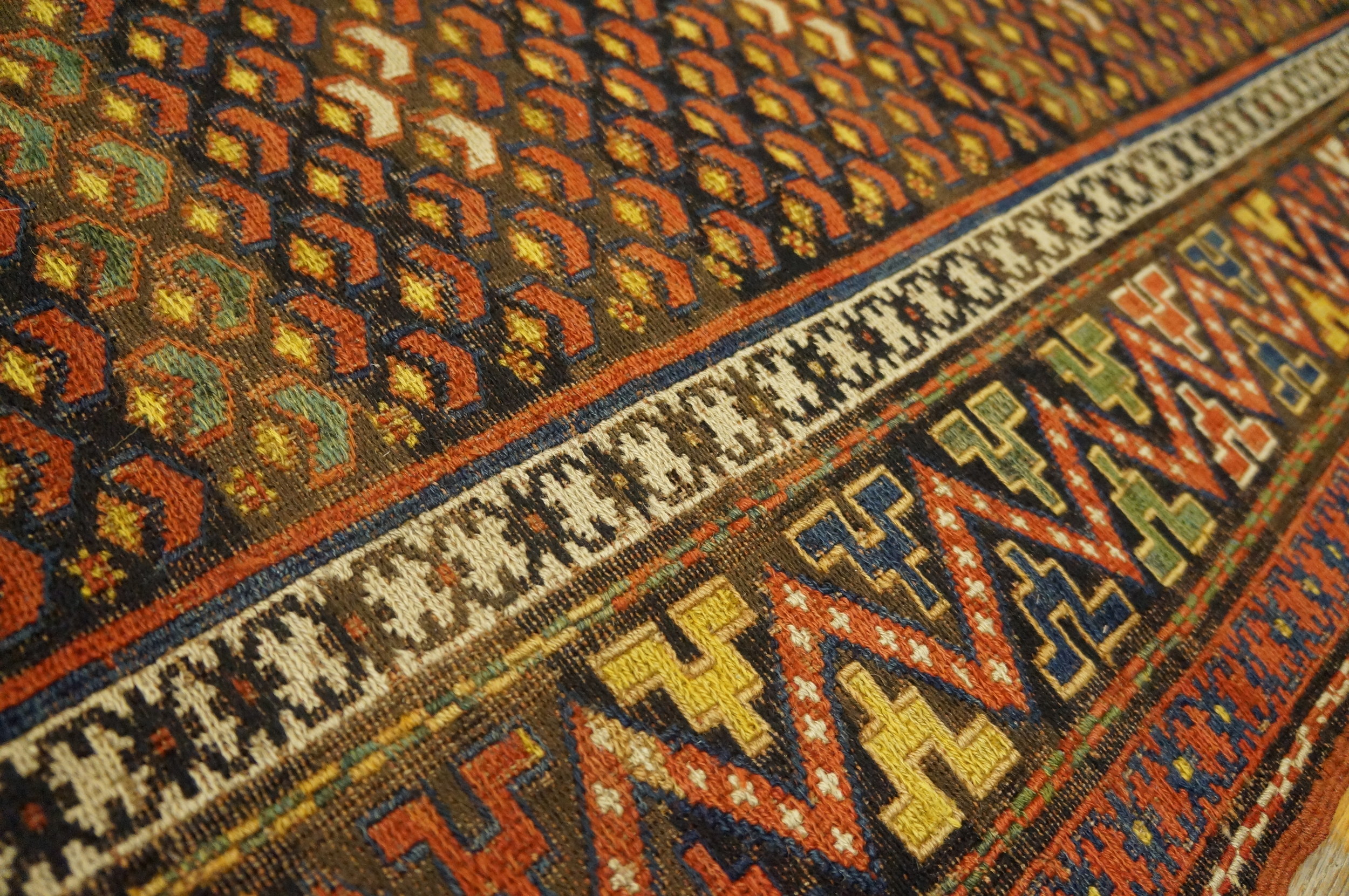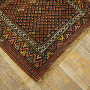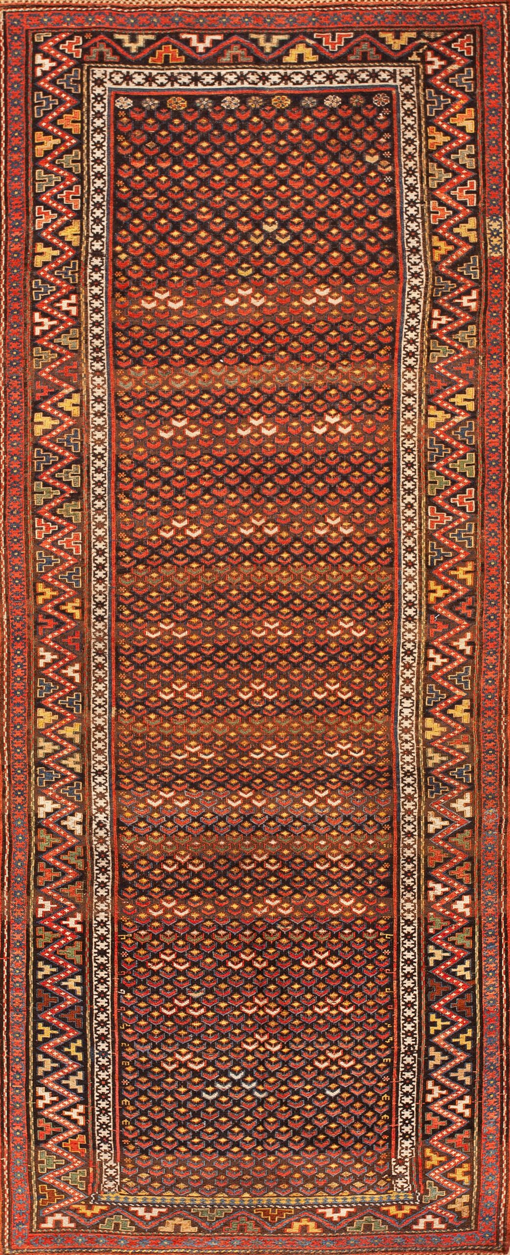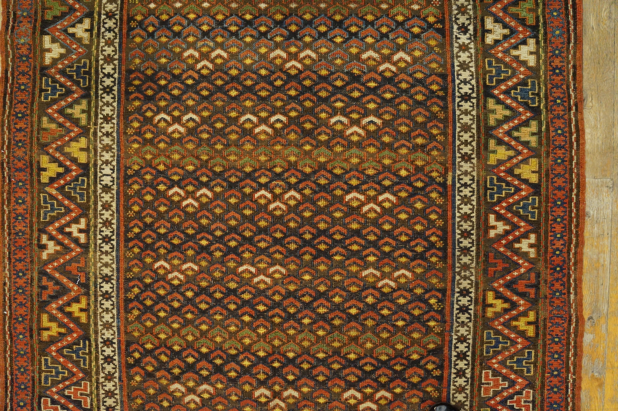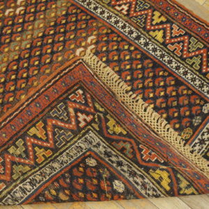 Antique Caucasian Hallway Runner Wool Rug, Country of Origin: Caucasus, Circa Date: 1890s. This exceptional late 19th-century textile represents the pinnacle of nomadic weaving traditions. Woven in the Sumak technique, which creates a durable, brocade-like surface, this piece showcases the bold, saturated palette characteristic of the region. The strong geometric vocabulary immediately identifies it as a product of the Caucasian rugs tradition, prized for its intensity and visual power.